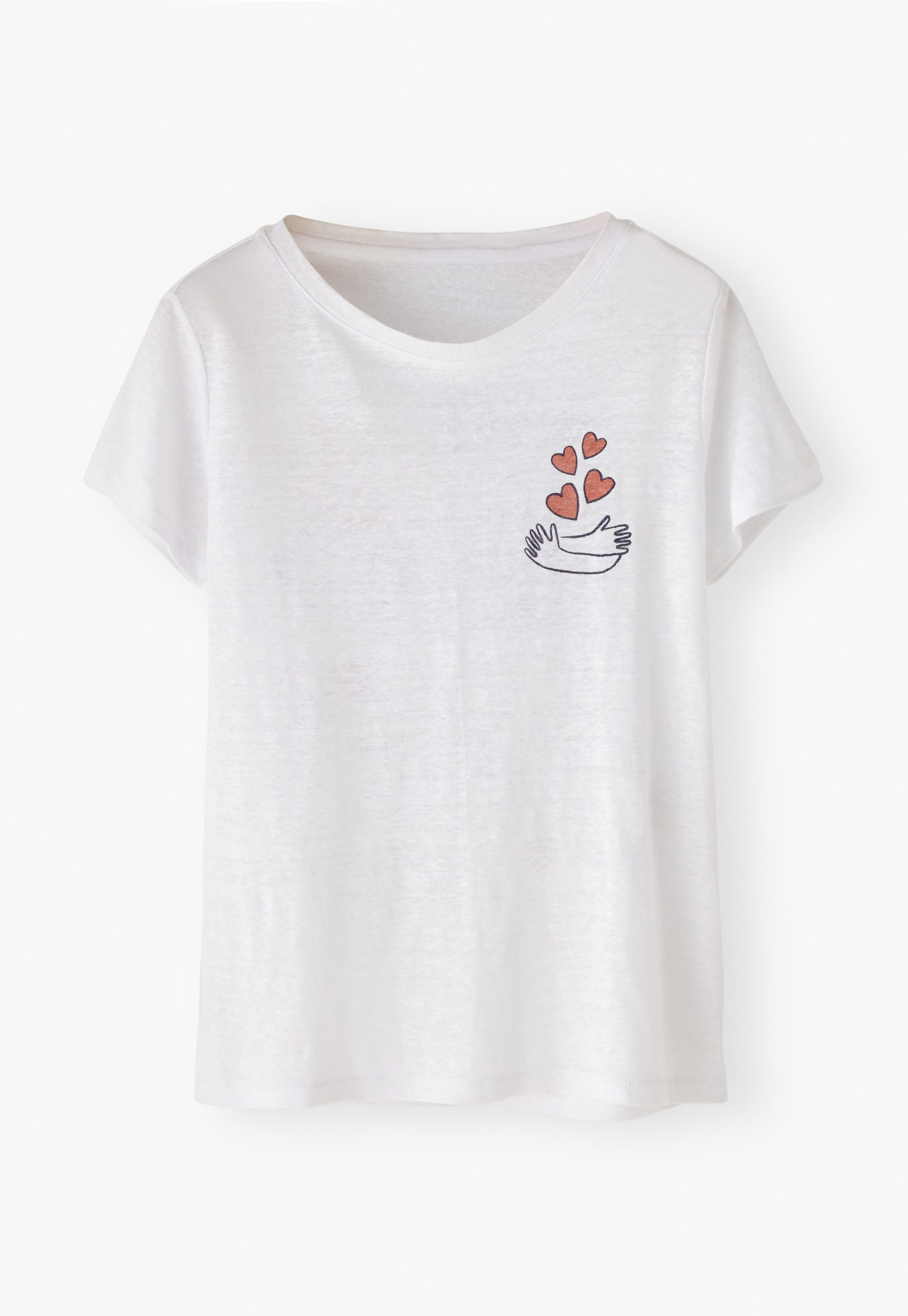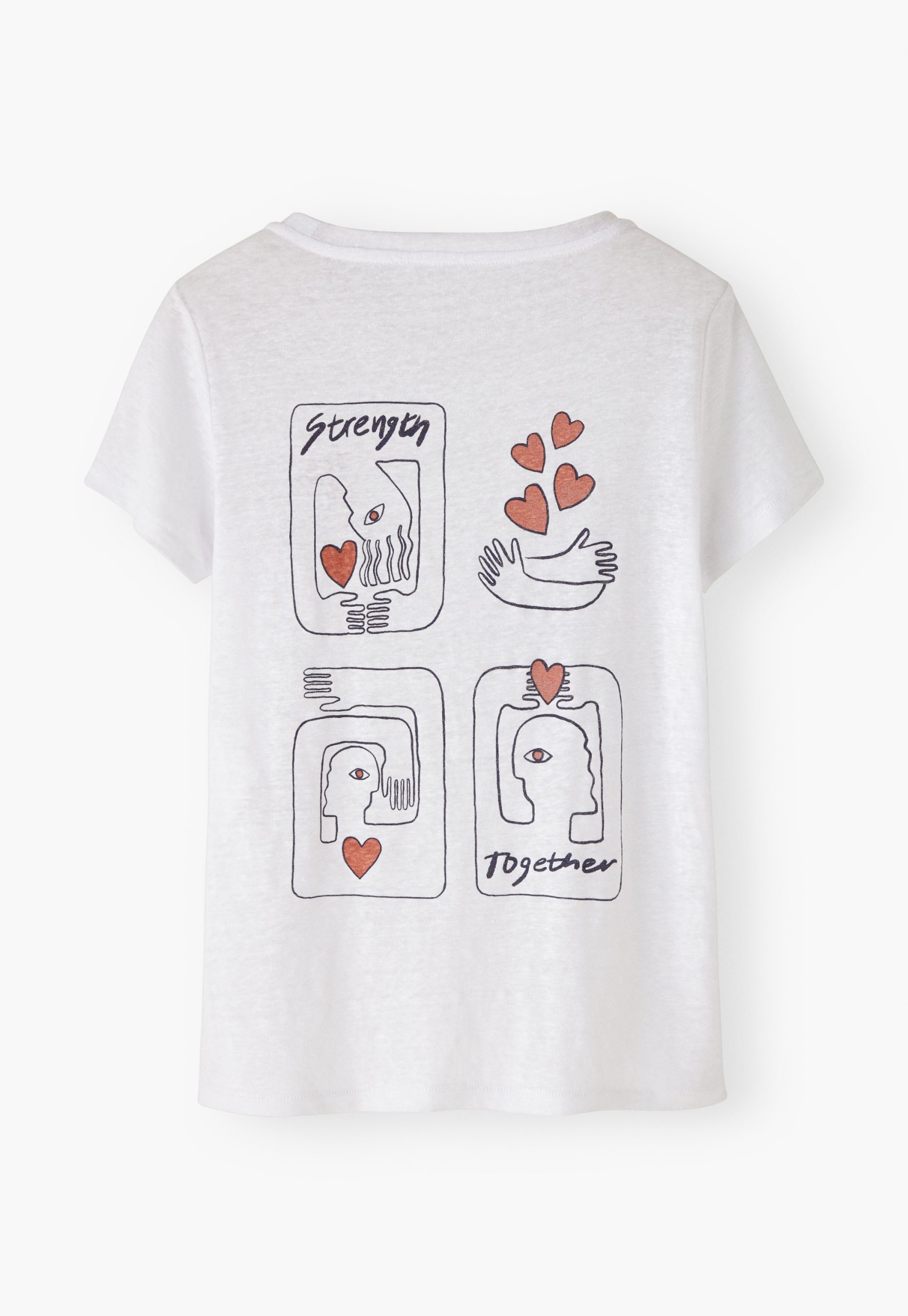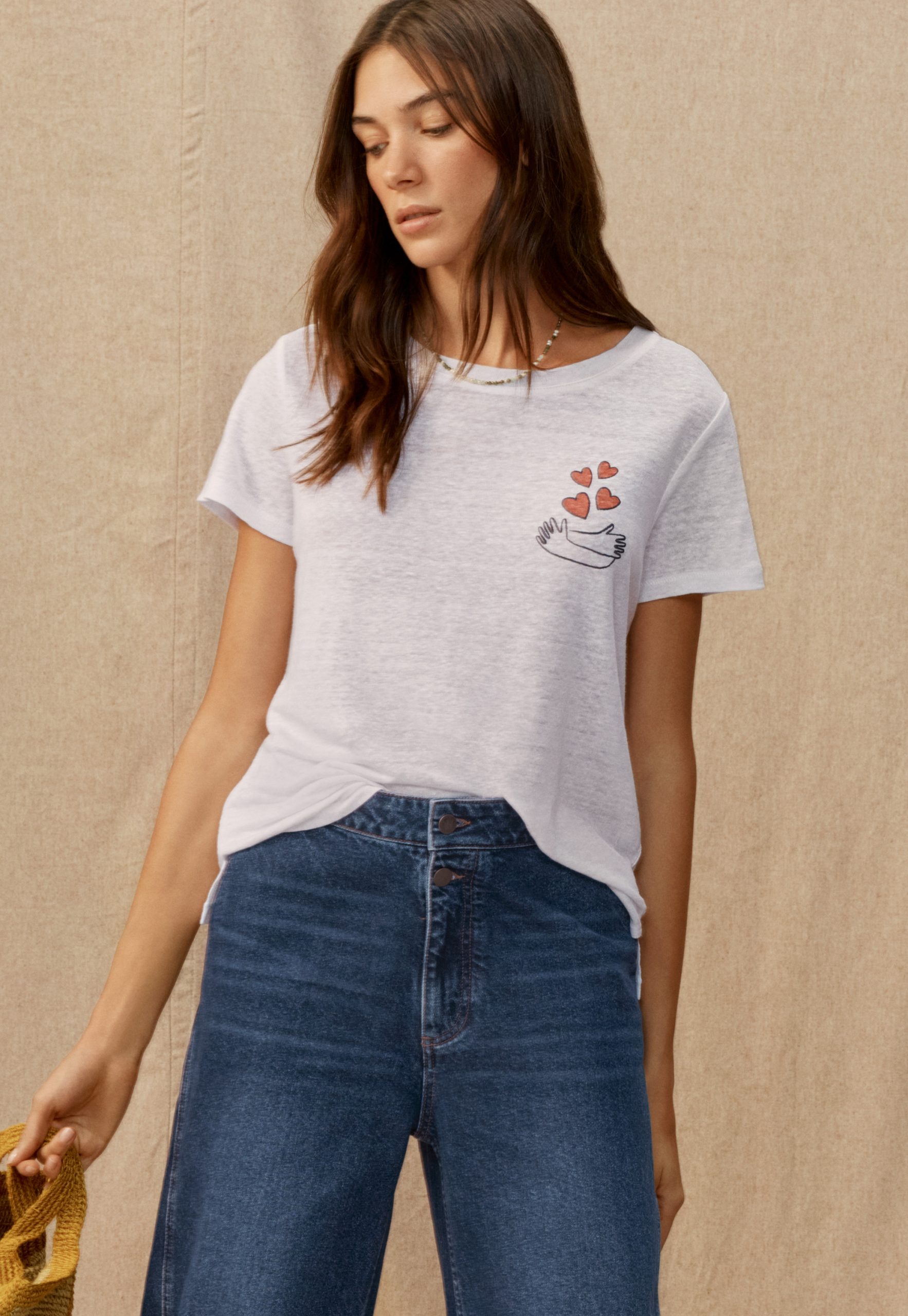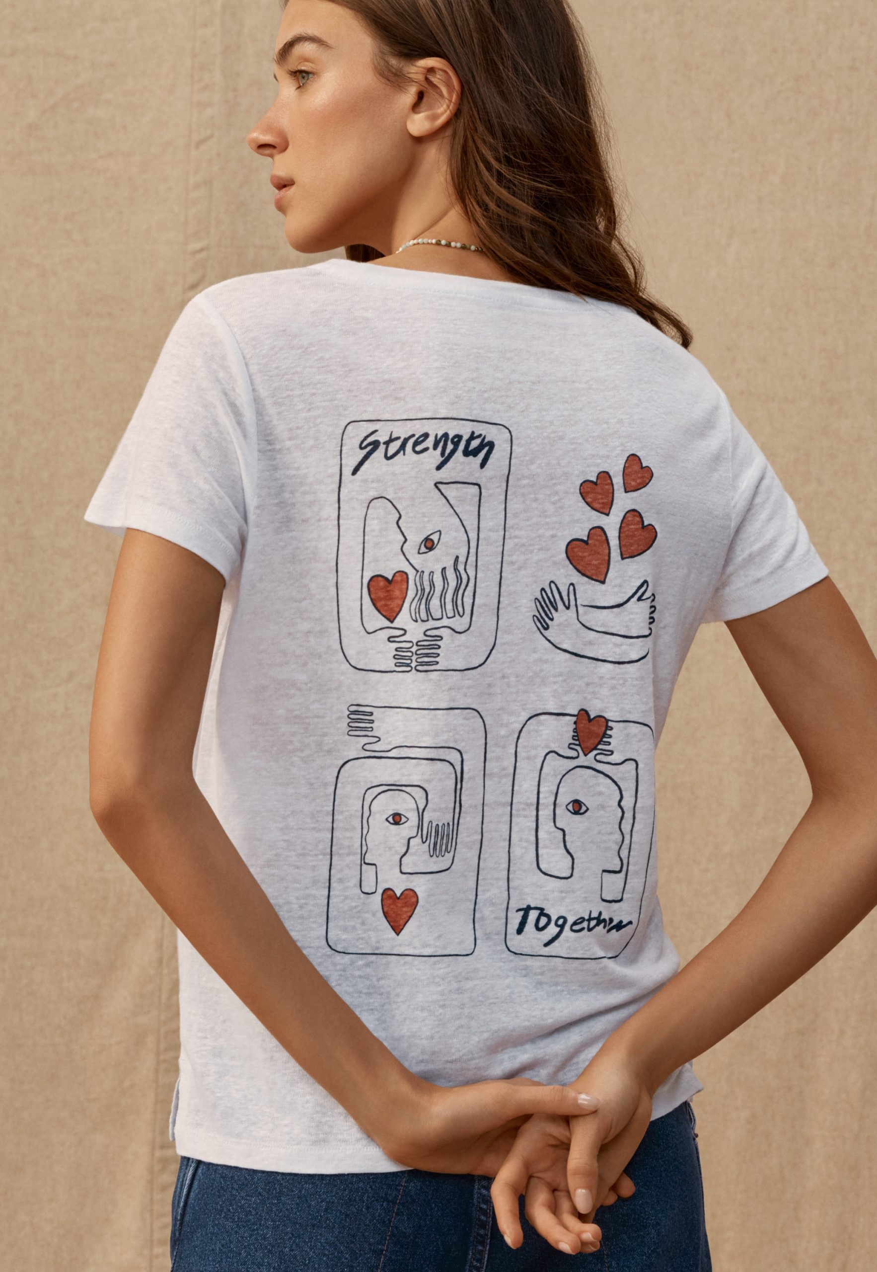 A design beautifully created by our in-house print designer, Ellie, this soft and drapey lightweight linen jersey T-shirt features an exclusive print symbolising love, unity, and strength. 100% of the proceeds from the sale of each T-shirt go to London-based charities PAWA and Karuna Trust, empowering teenage girls in West Bengal through education.