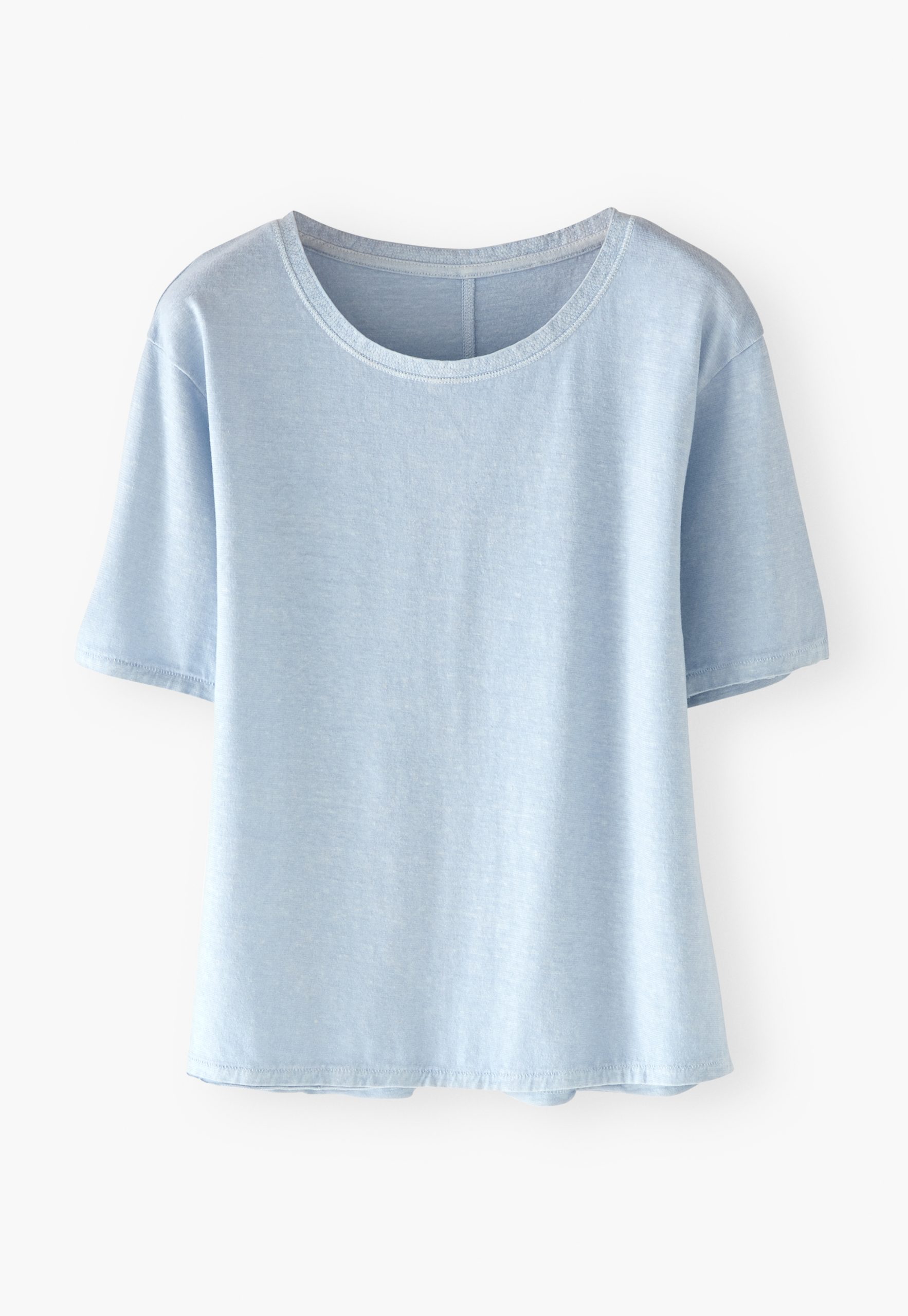 Garment, pigment-dyeing gives this T-shirt a loved and laundered look whilst the hemp and organic cotton mix is soft and cool next to the skin. Stitching around the neck and a raw finish at the hem add detail. Finished with a seam stitched down the centre-back.