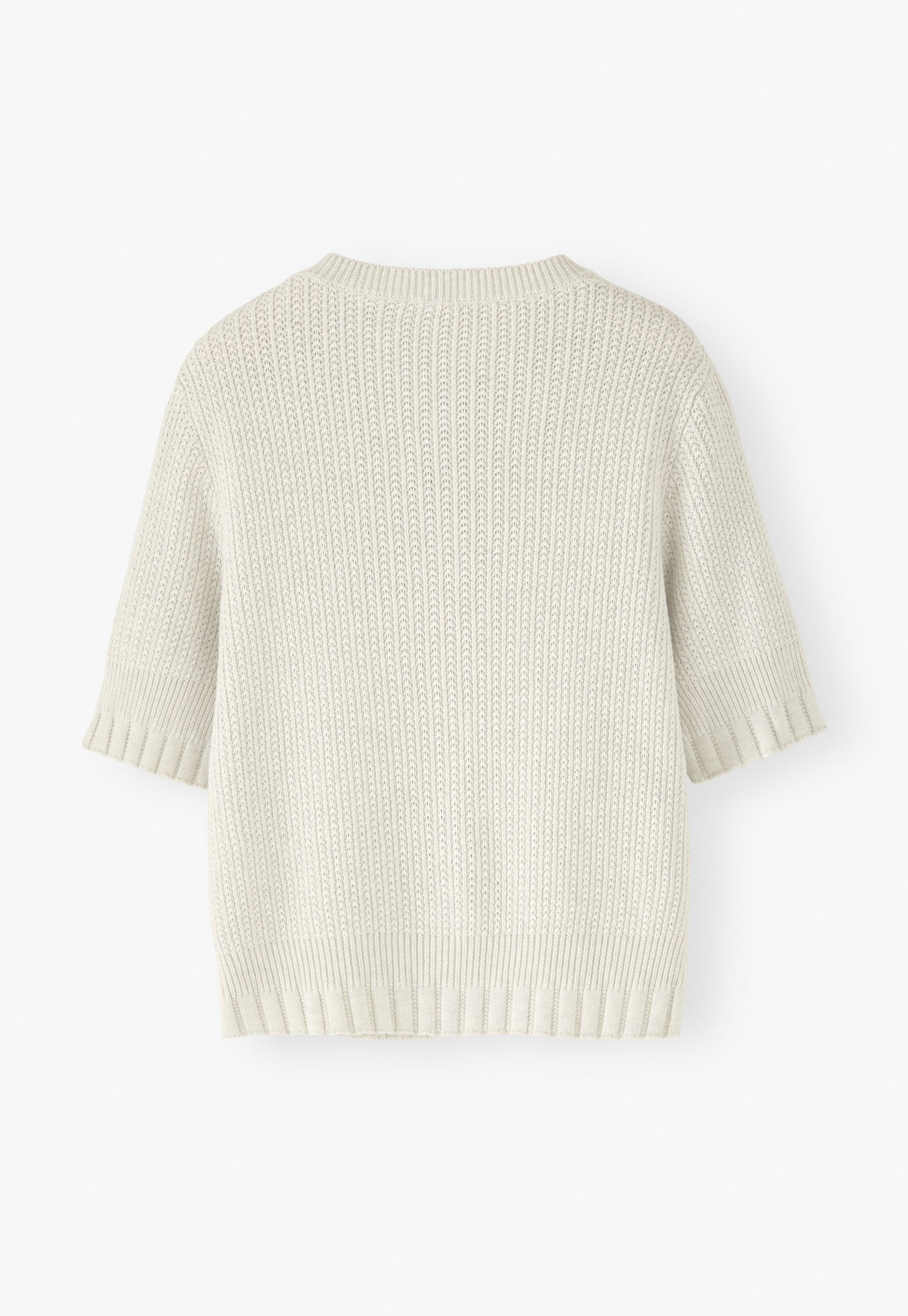 - Rib-stitch details at cuffs and hem