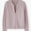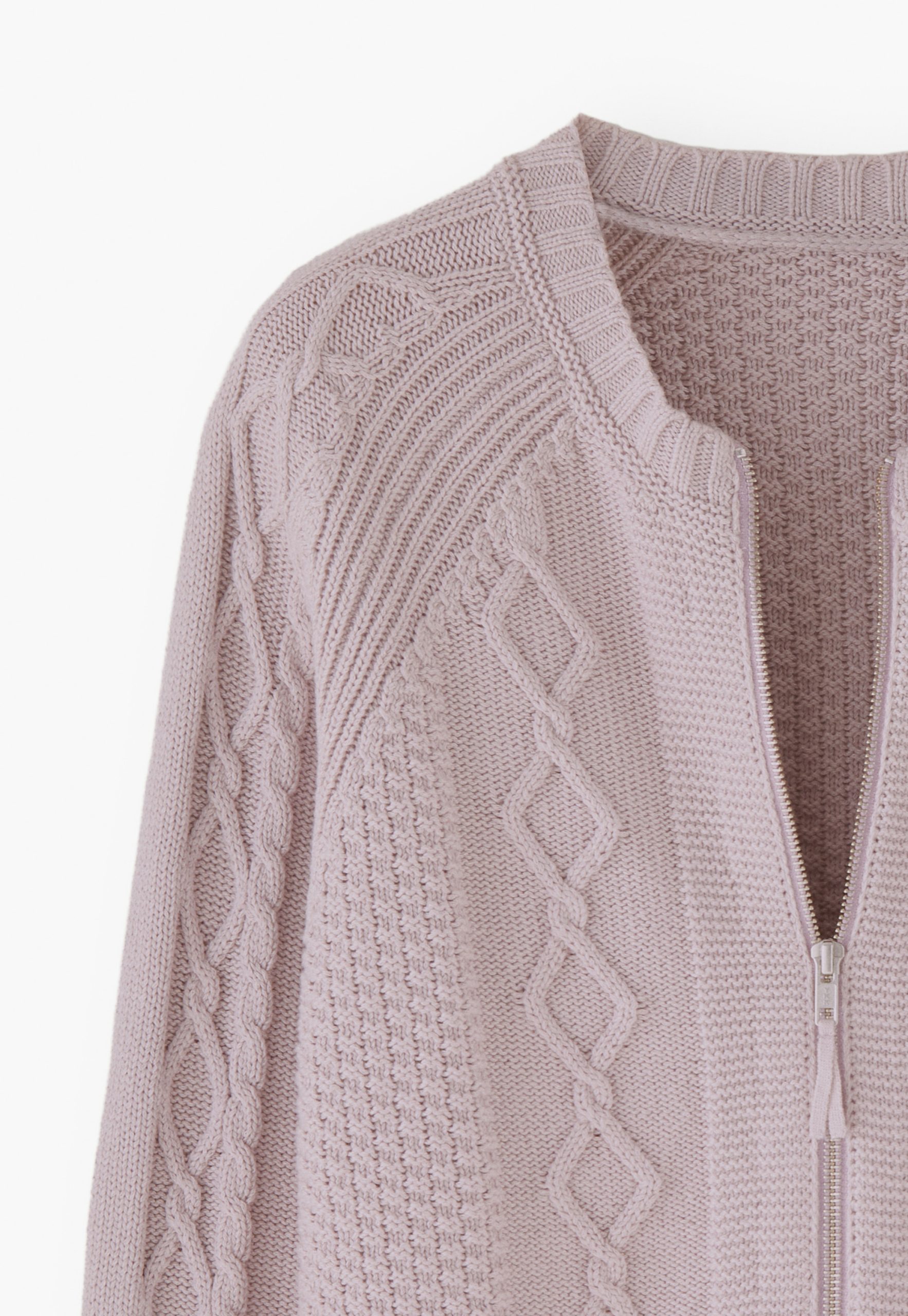 - Cable-stitch detail on front body and sleeves