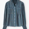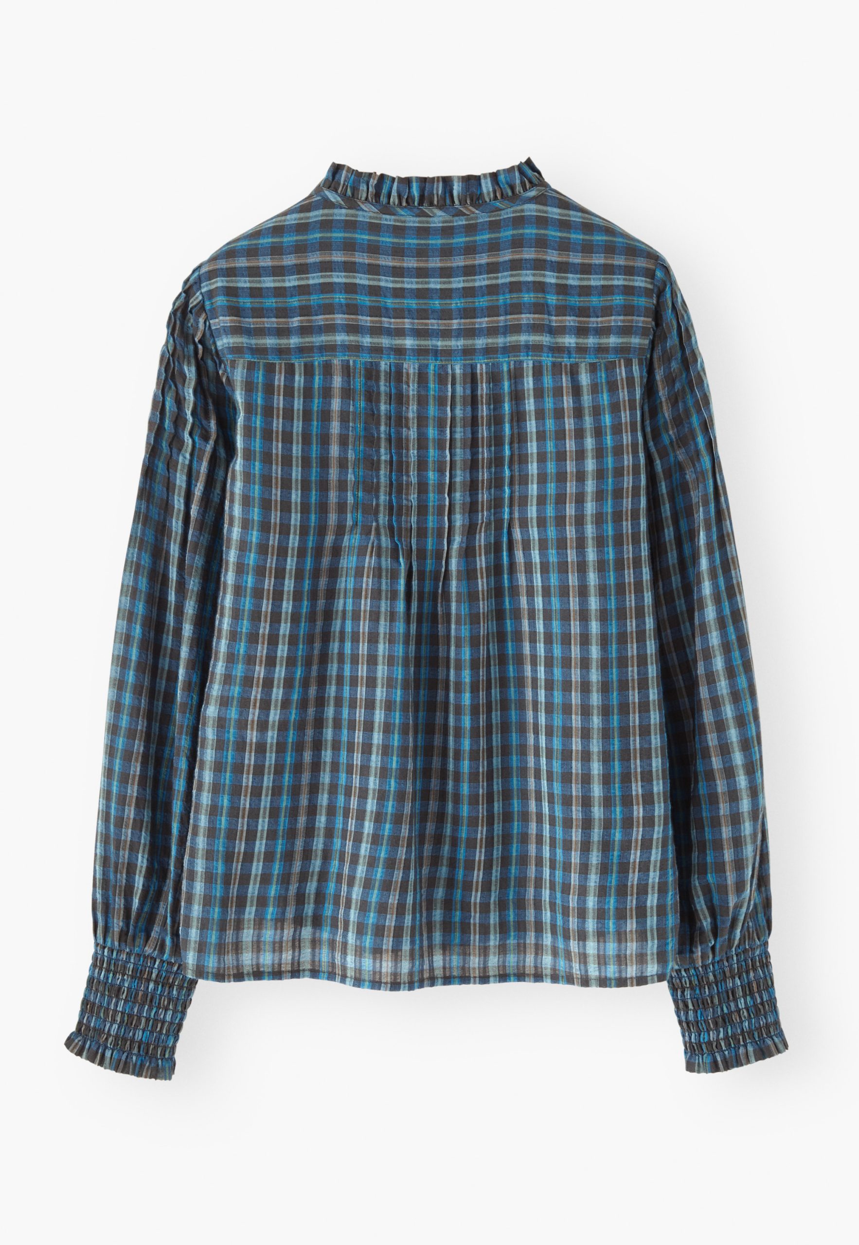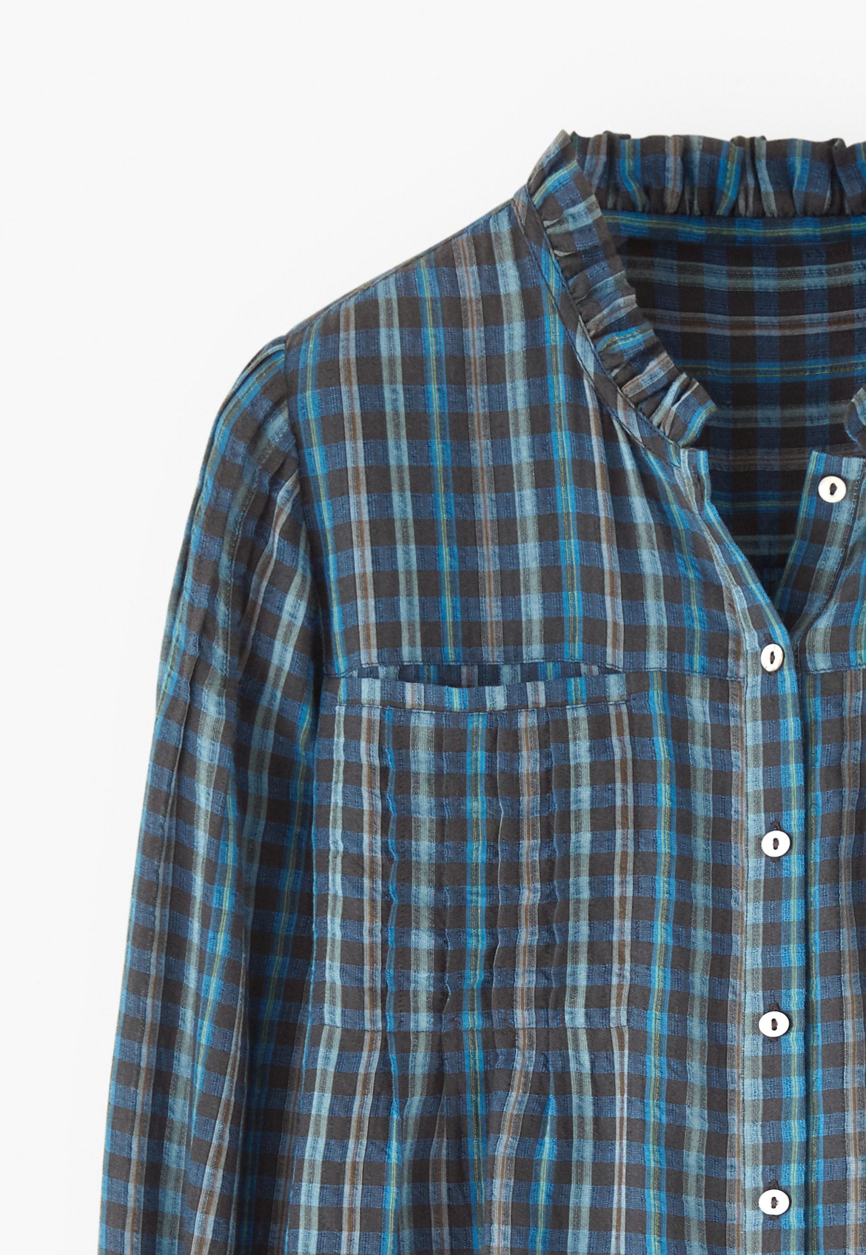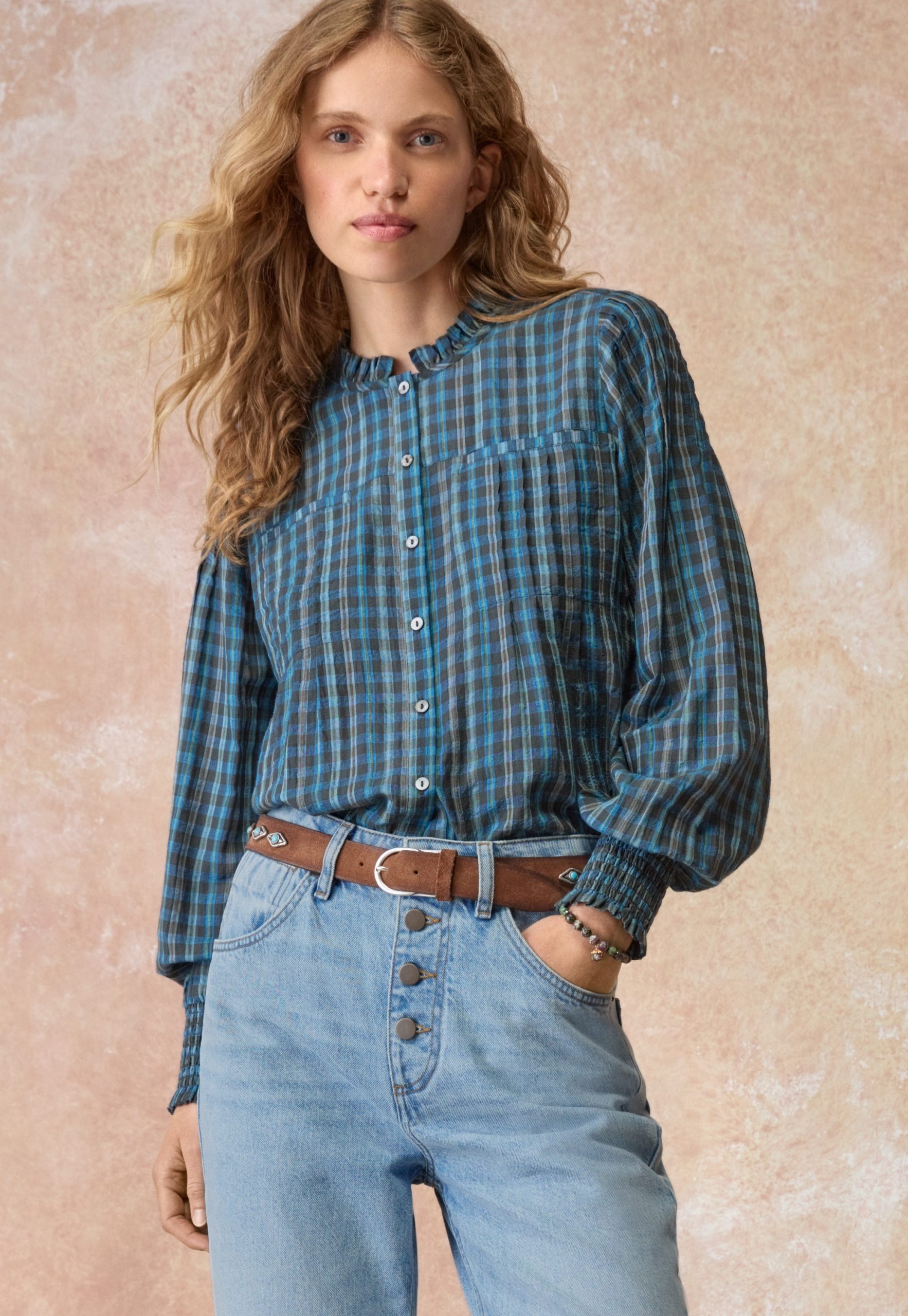 A soft and light relaxed fit checked blouse that’s more contemporary than cowboy. Neat pintucks at the shoulders and pockets add a distinctive detail and the full-length sleeves finish with gathered, shirring cuffs.