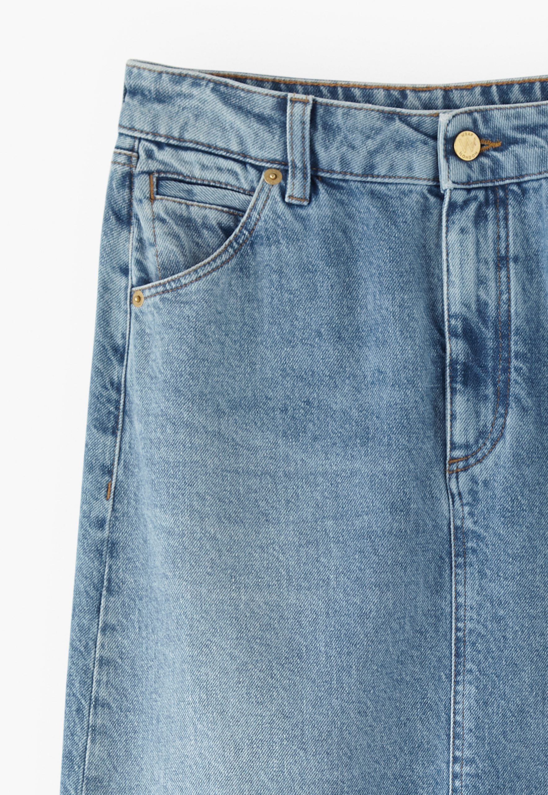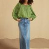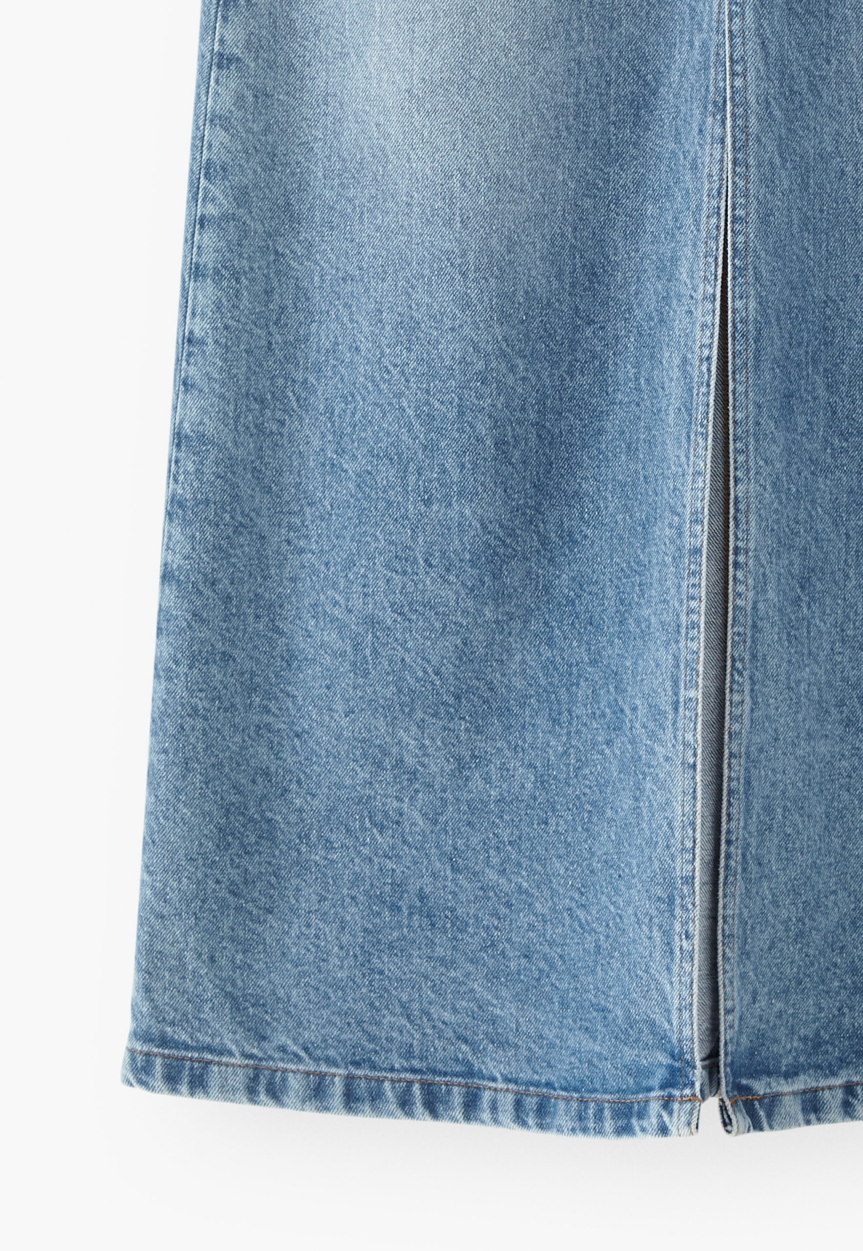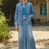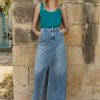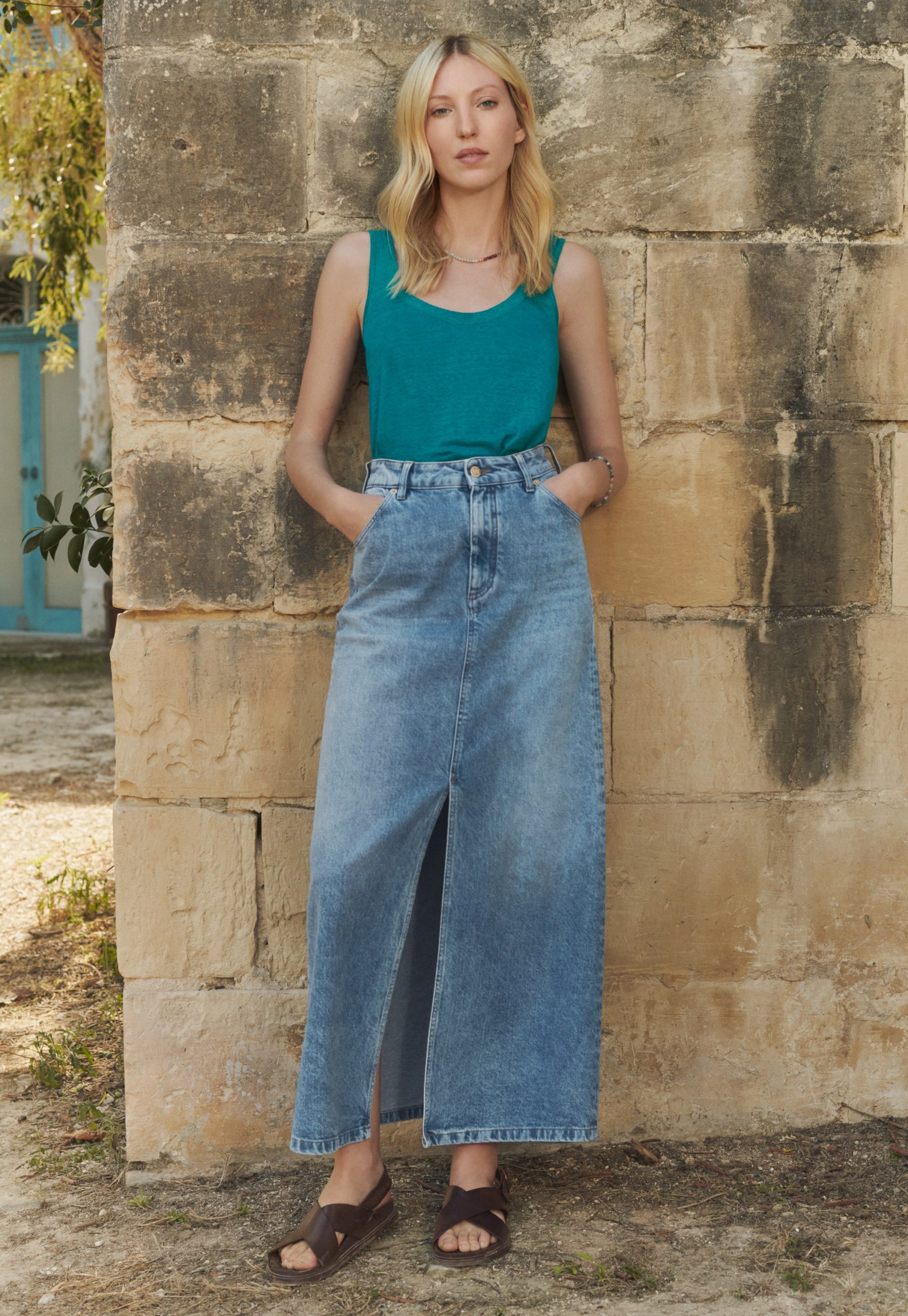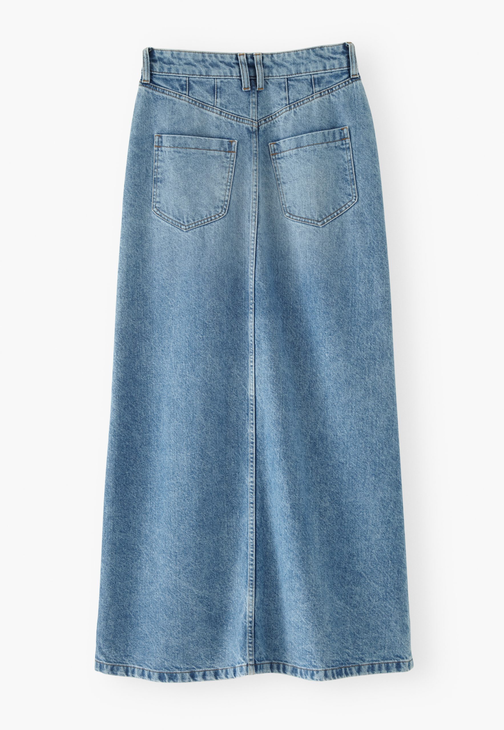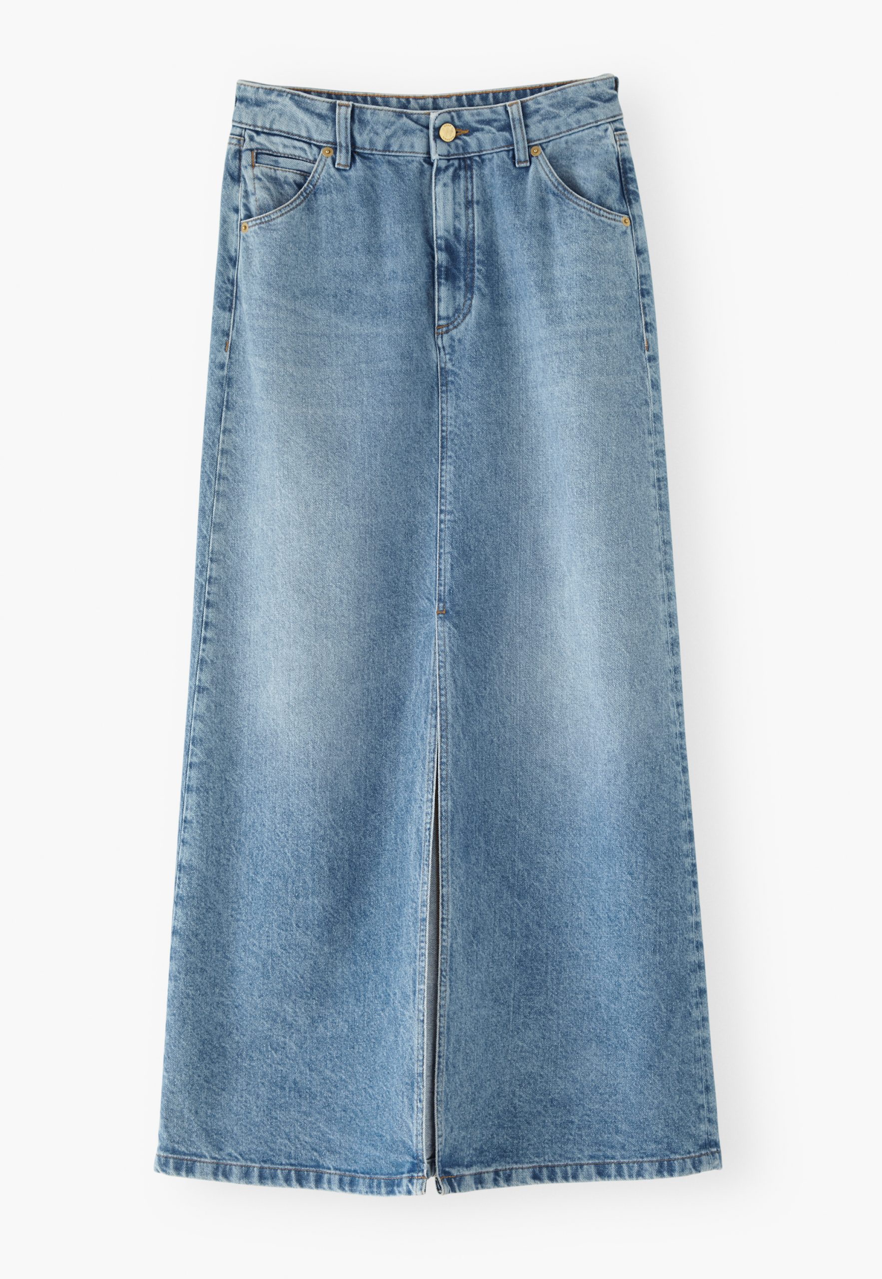 A denim skirt taken to the max. With classic jeans styling at the waist, the long skirt has a deep split in the front hem so you can stride through the summer with ease.