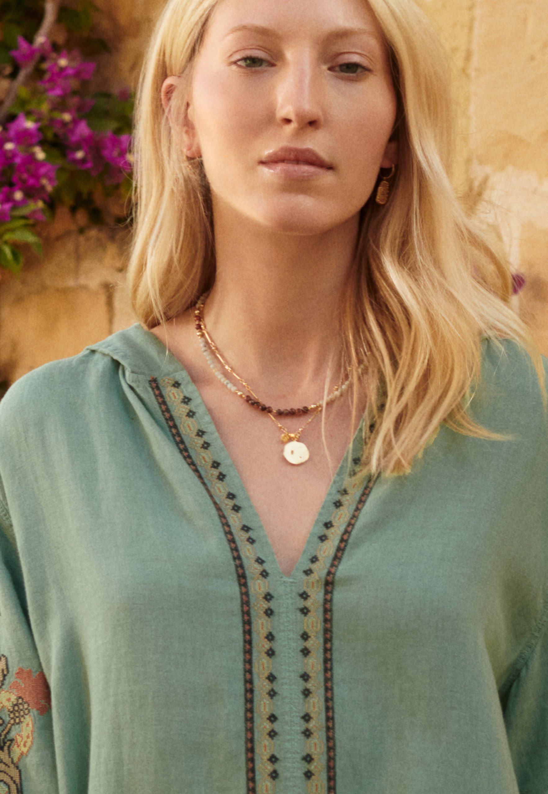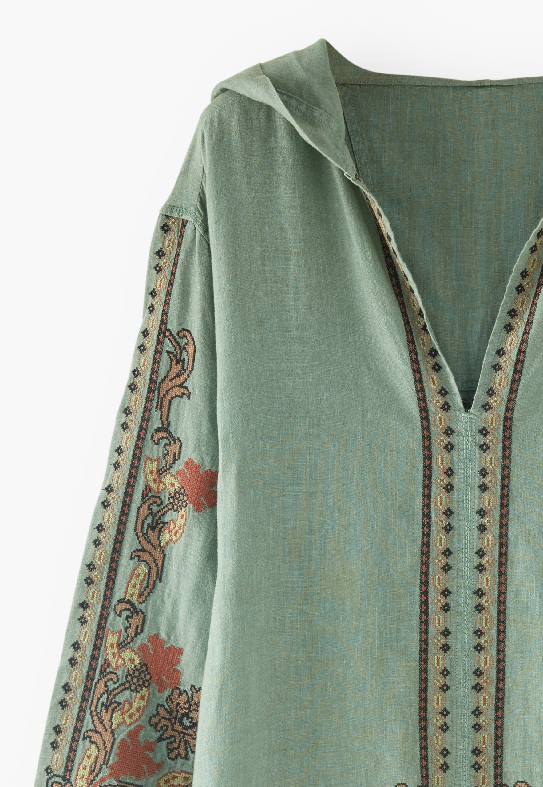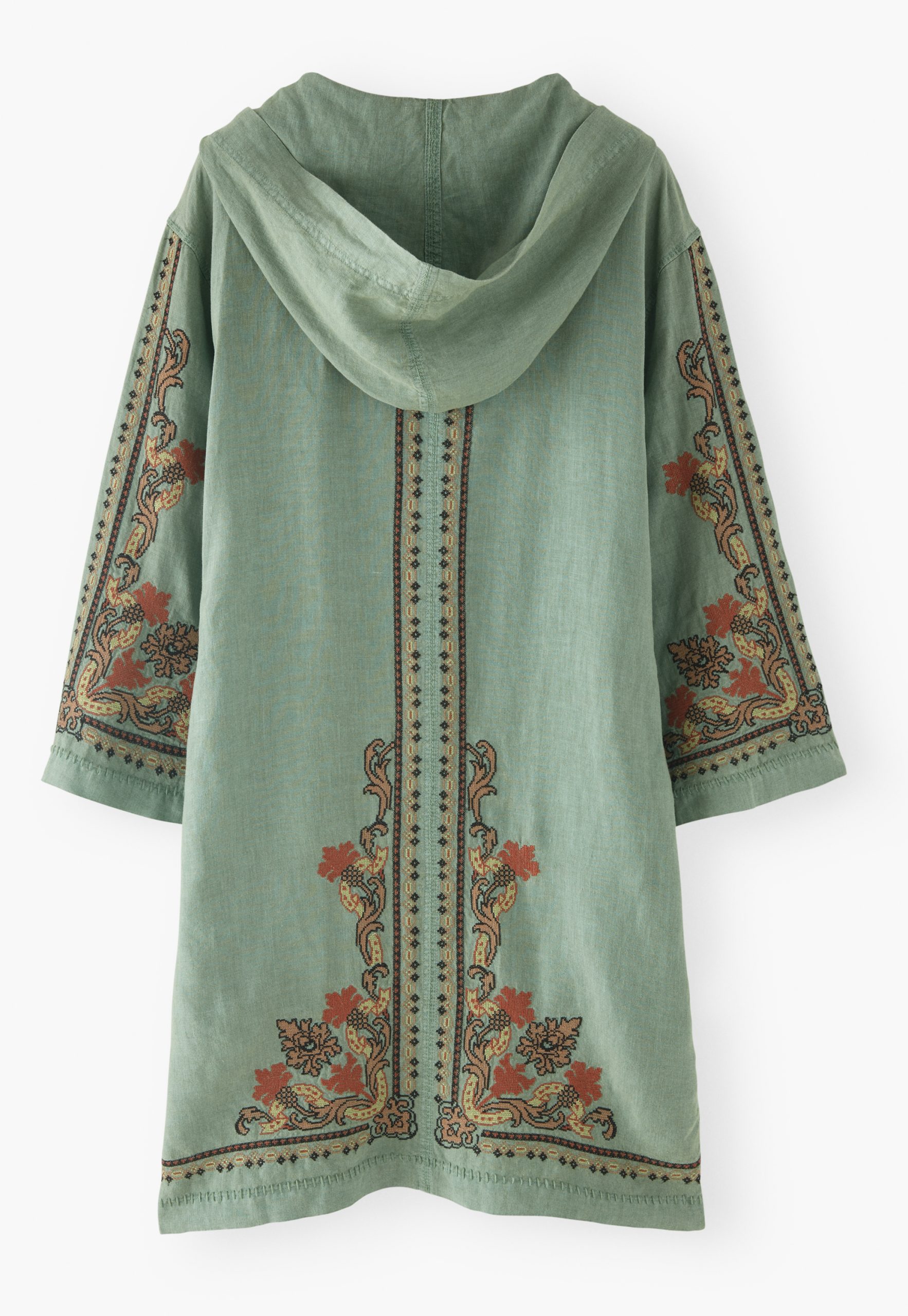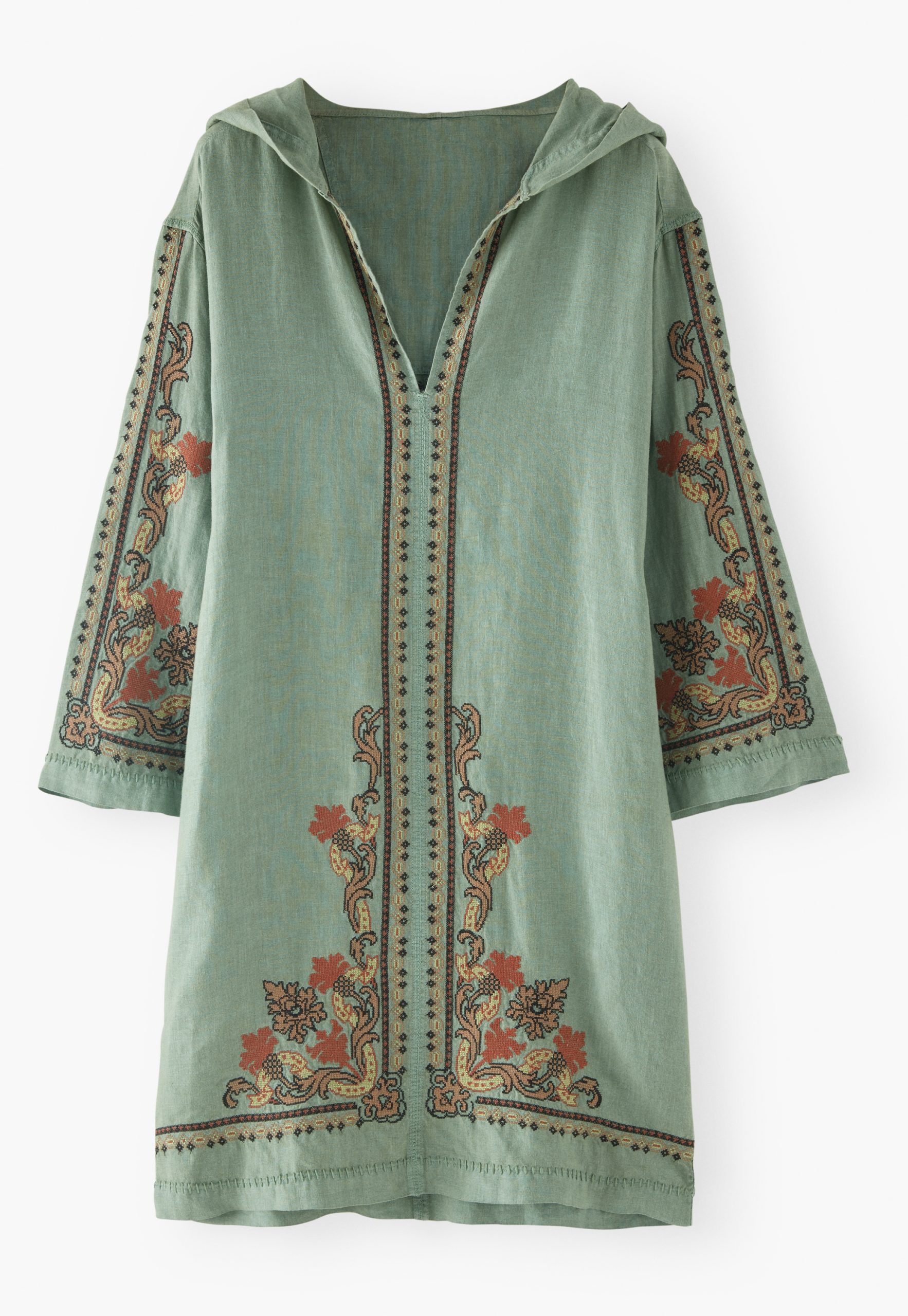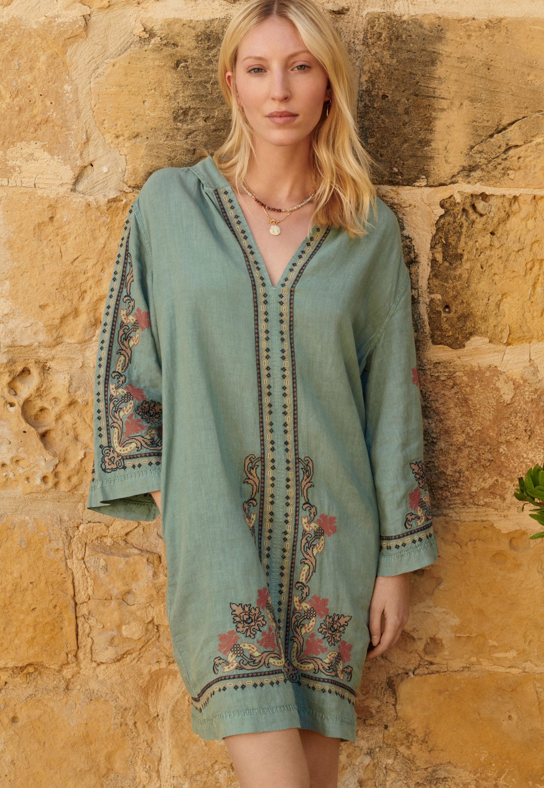 Beautifully boho hooded linen dress embellished with an exceptional cross-stitch design. Slip on your sandals and you’re ready for a walk around the markets or coffee al fresco.