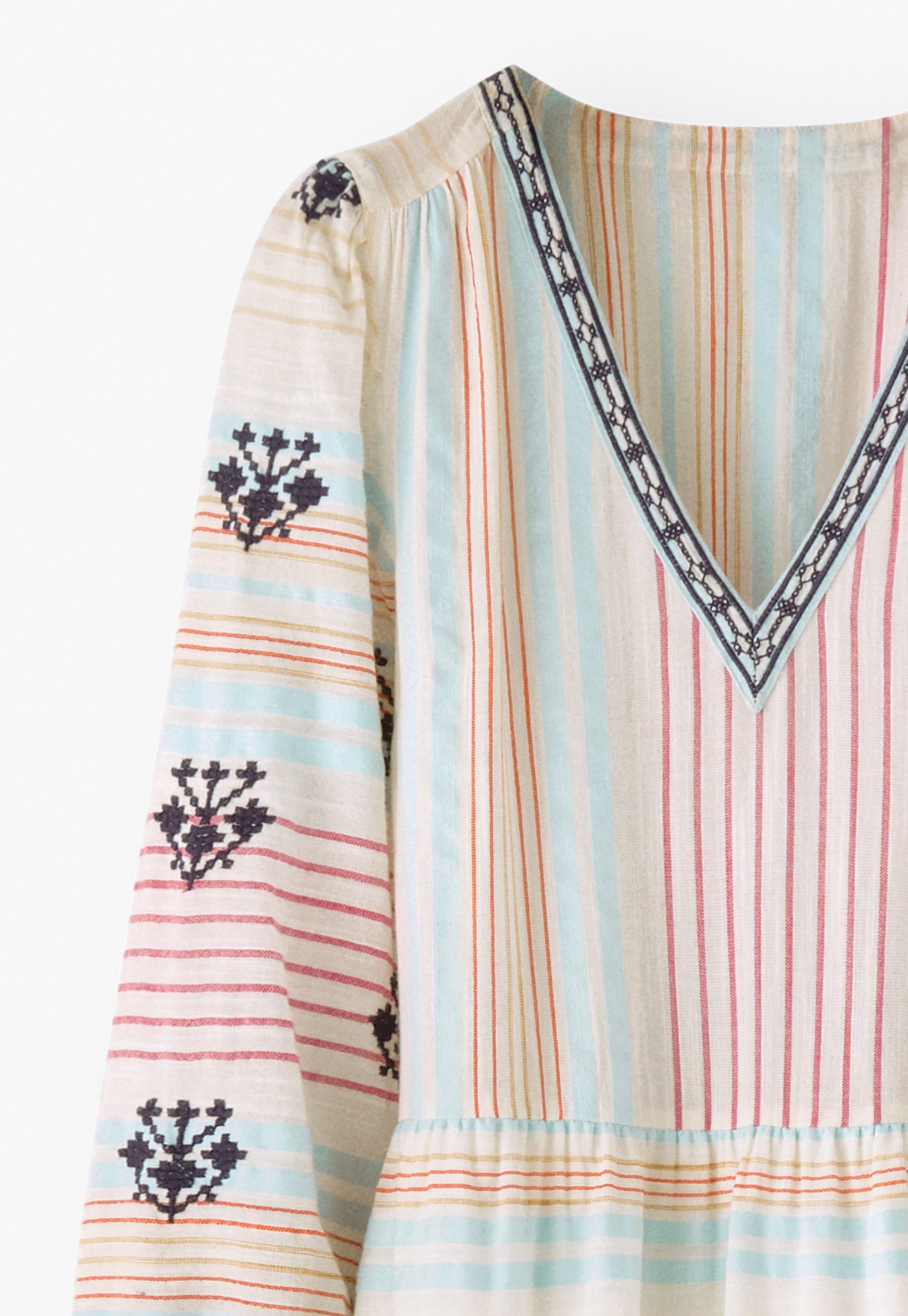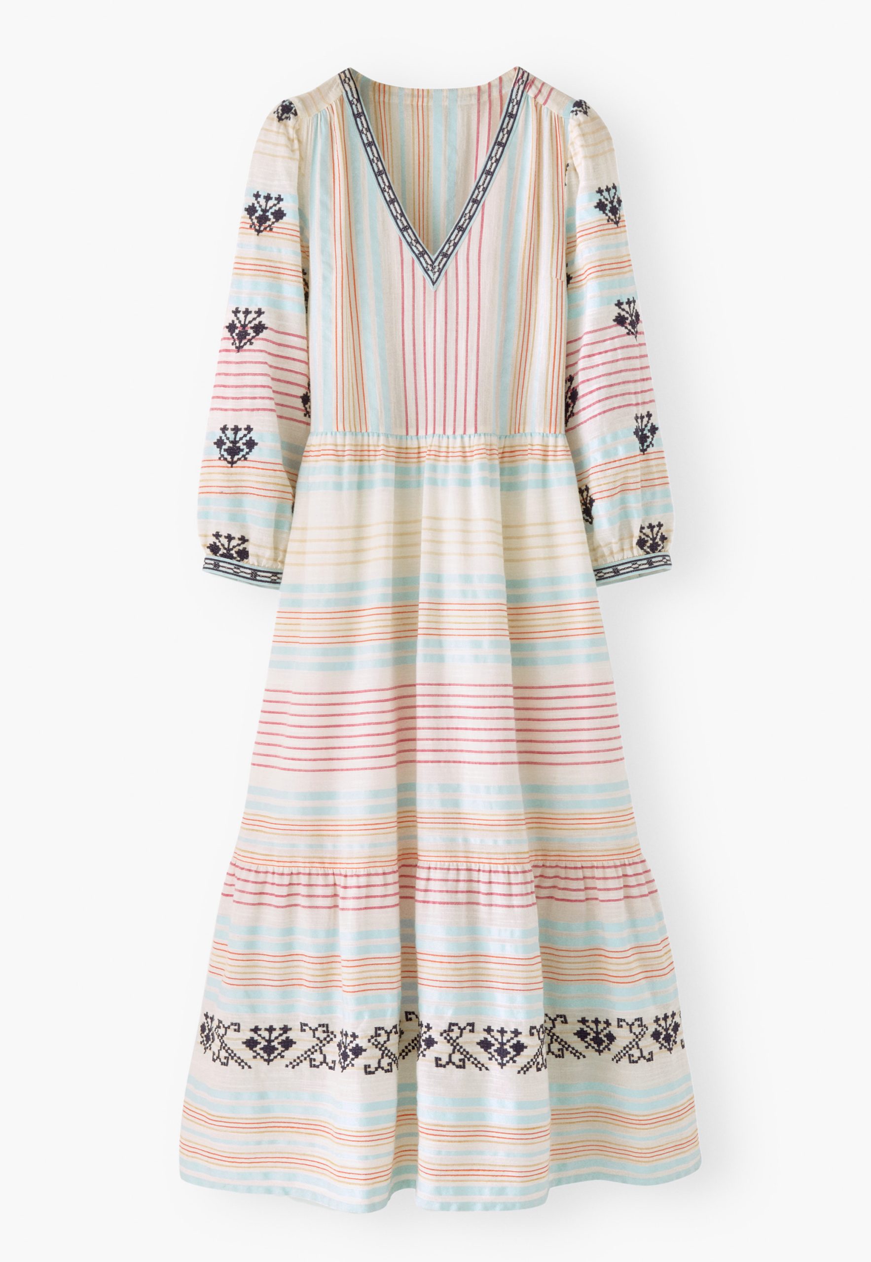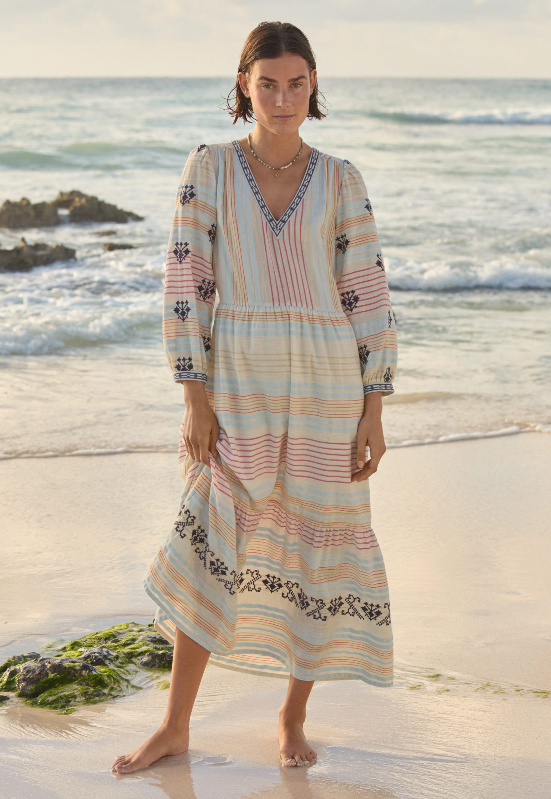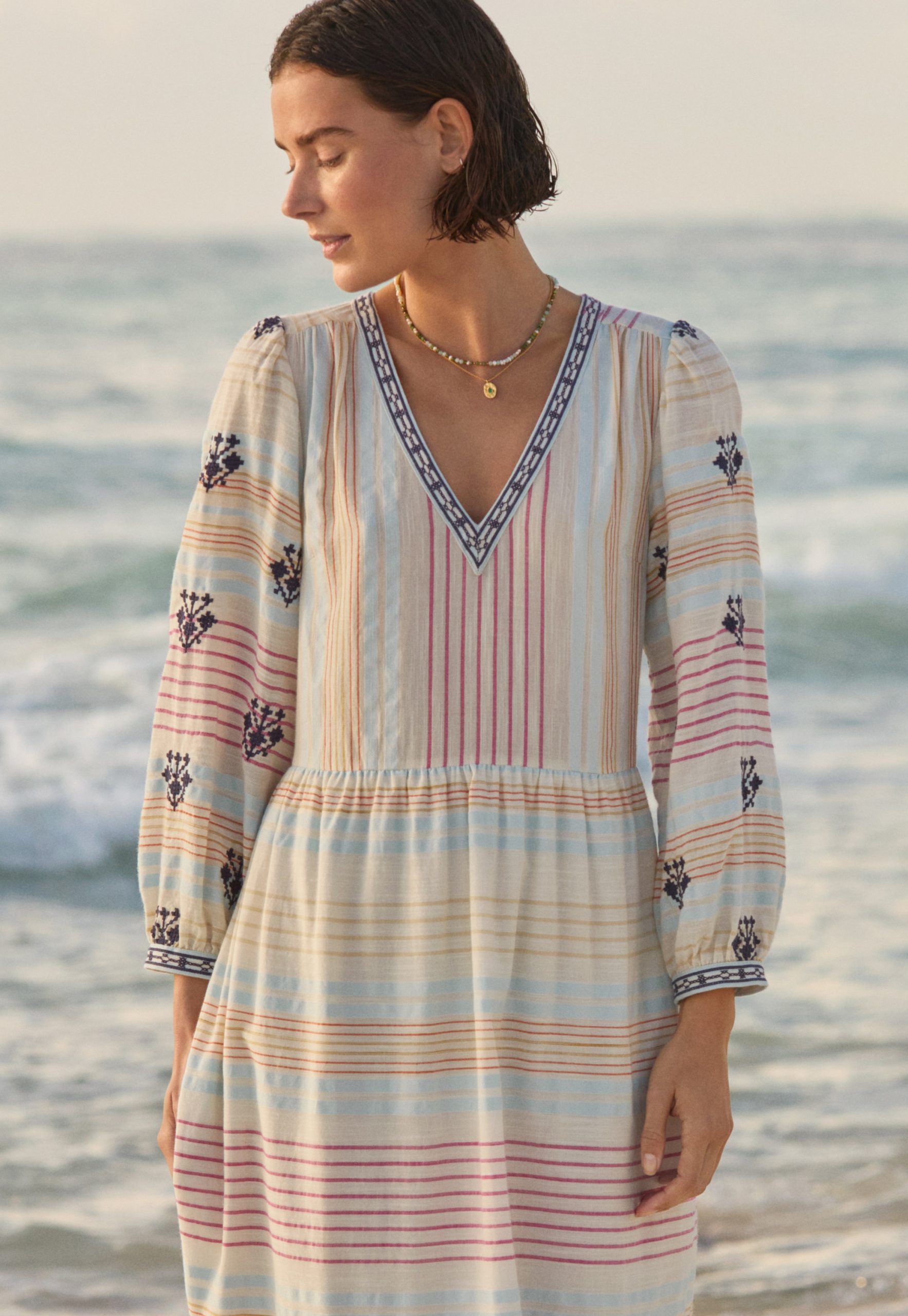 Fresh stripes and lightweight cotton meet to create this relaxed-fit v-neck dress. The bracelet-length sleeves and lower tier are scattered with bold embroidery details for a pop of contrast.