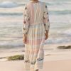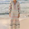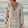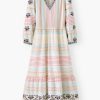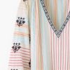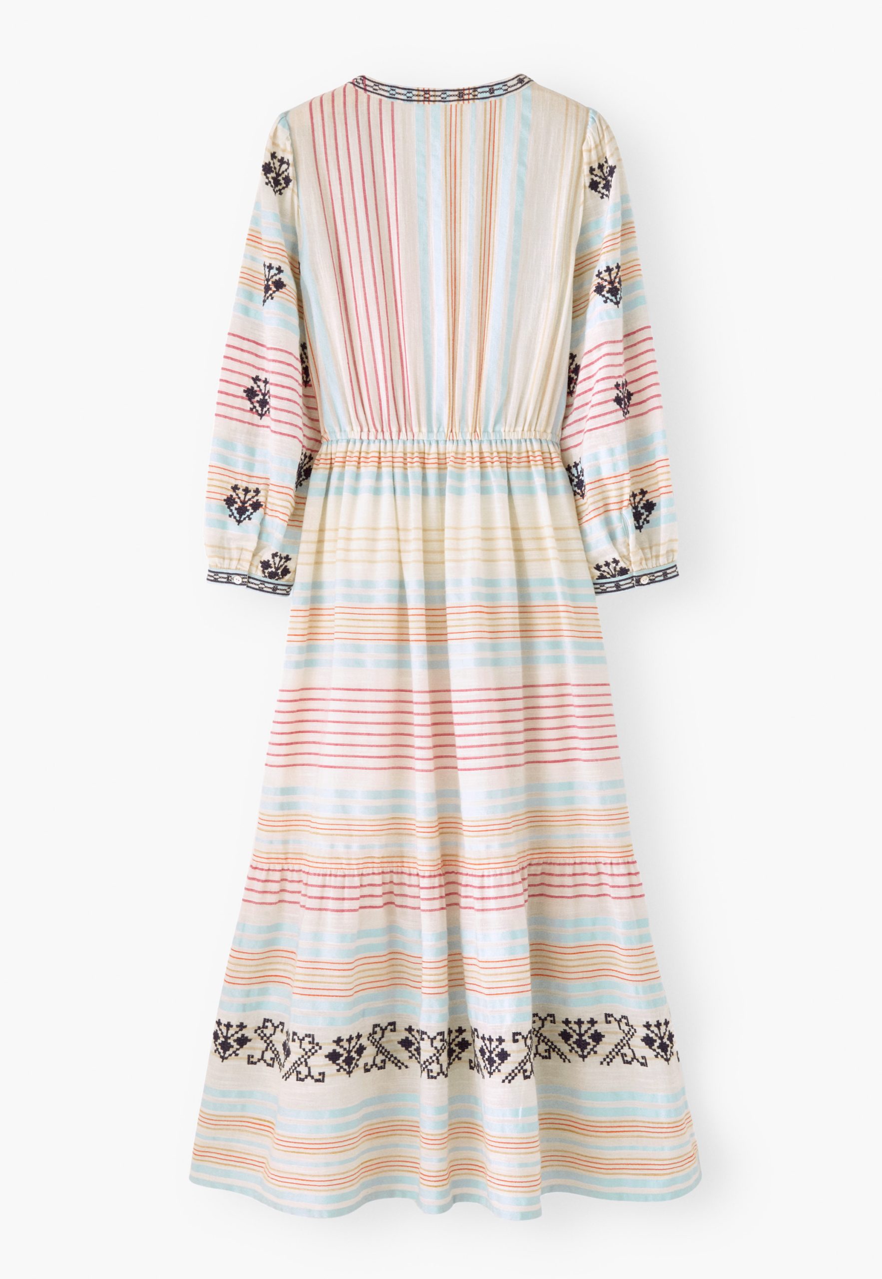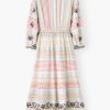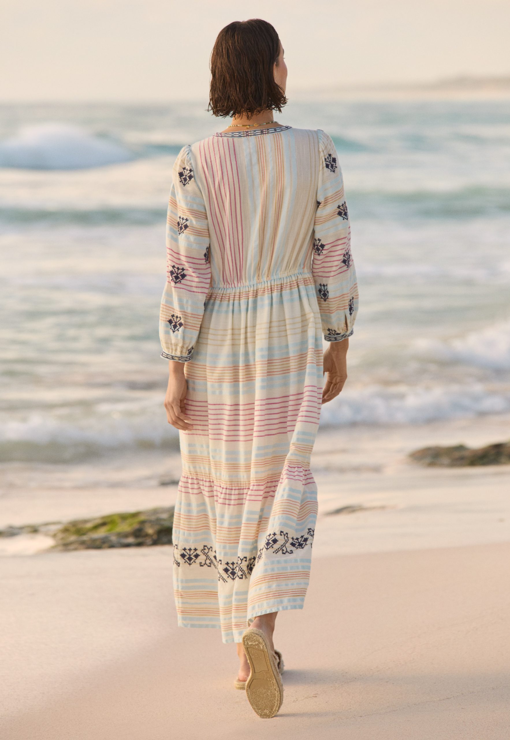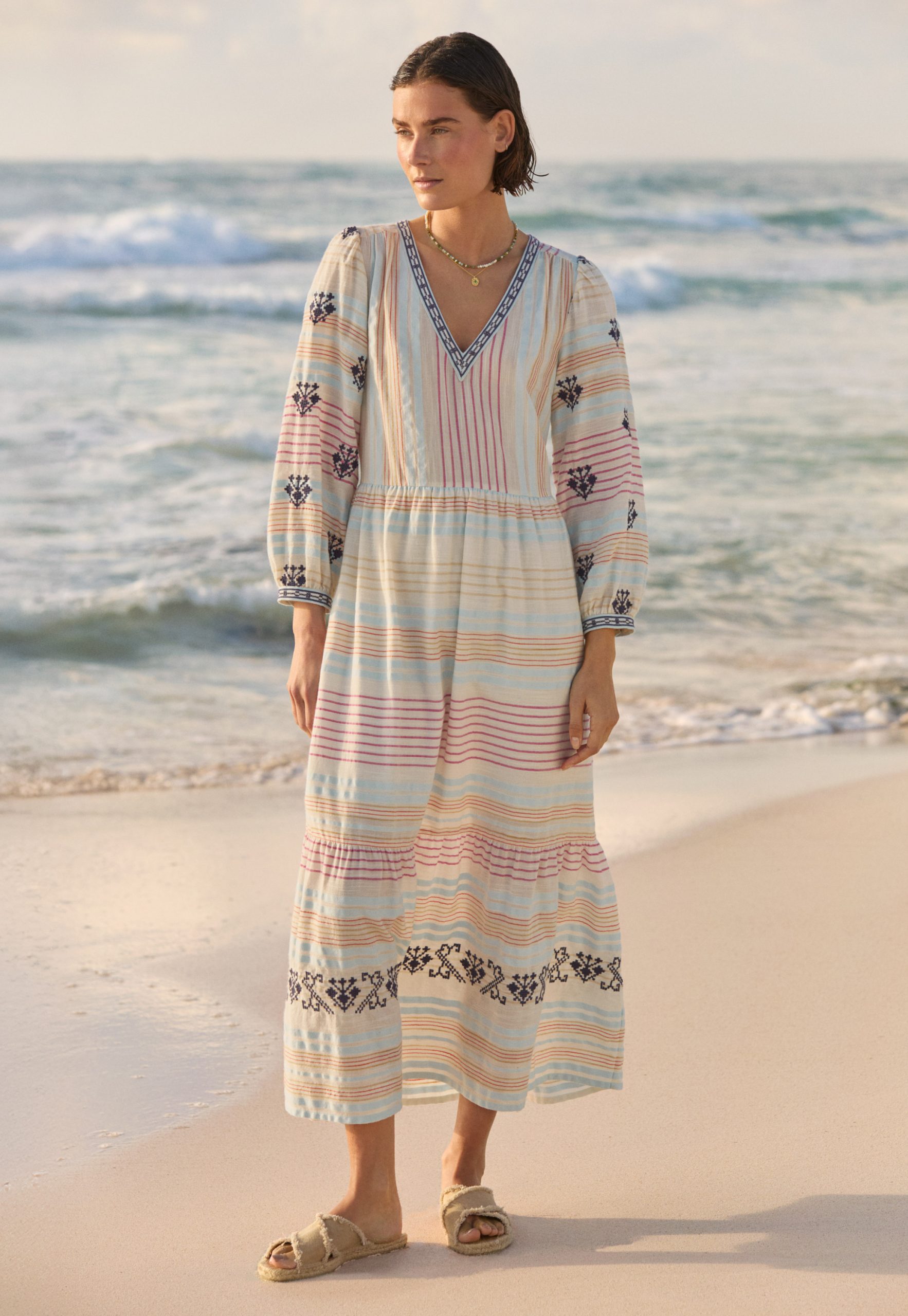 Fresh stripes and lightweight cotton meet to create this relaxed-fit v-neck dress. The bracelet-length sleeves and lower tier are scattered with bold embroidery details for a pop of contrast.