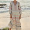 Fresh stripes and lightweight cotton meet to create this relaxed-fit v-neck dress. The bracelet-length sleeves and lower tier are scattered with bold embroidery details for a pop of contrast.