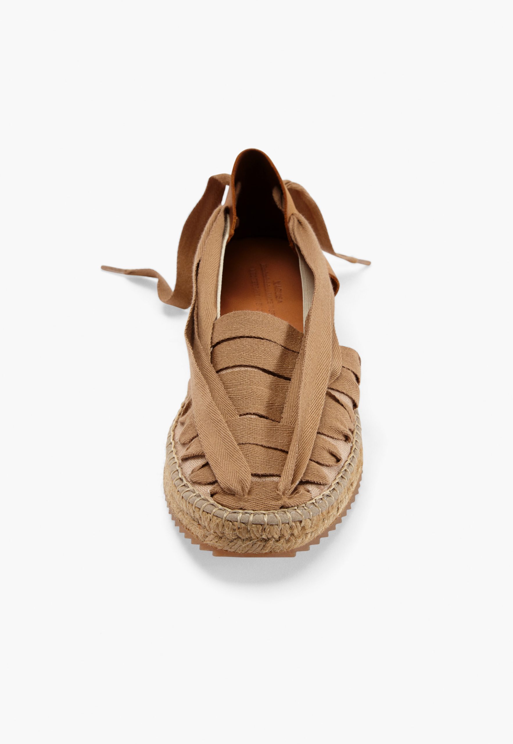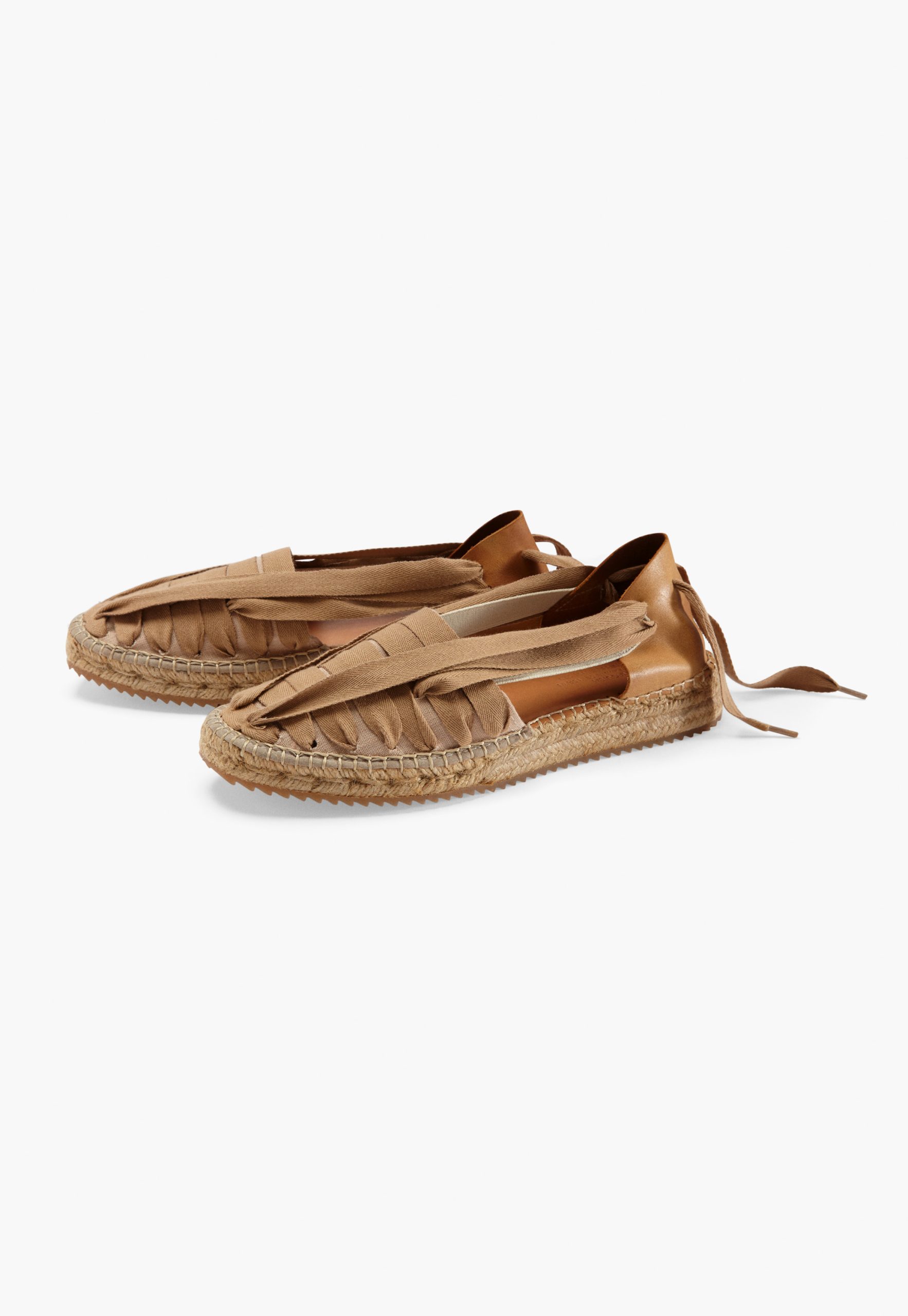 Summer espadrilles with a leather and cotton upper with elegant cotton ribbons at the toe and a cotton ribbon ankle fastening for a secure fit. With a leather footbed for comfort, and a jute and rubber sole for that classic espadrille look.