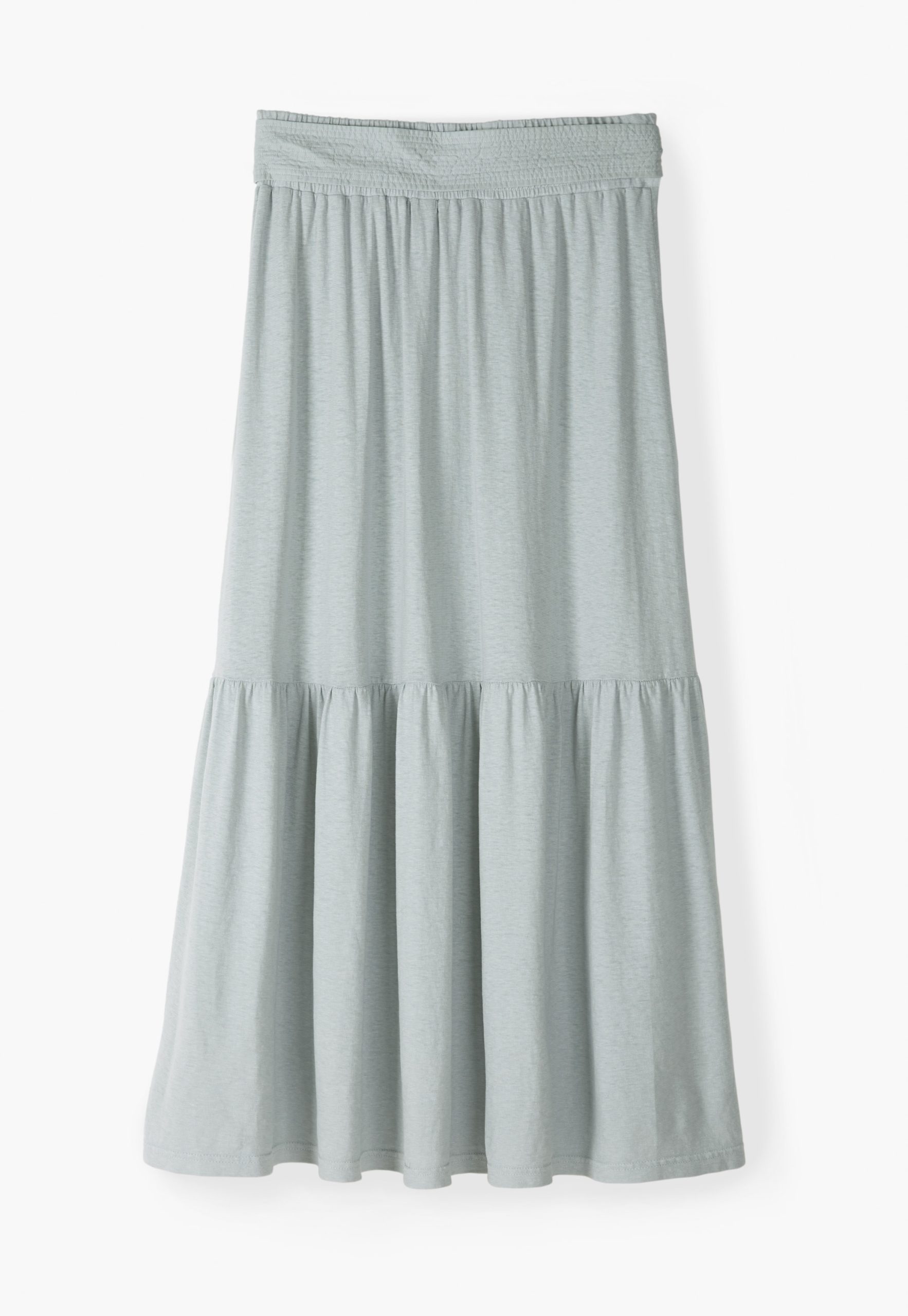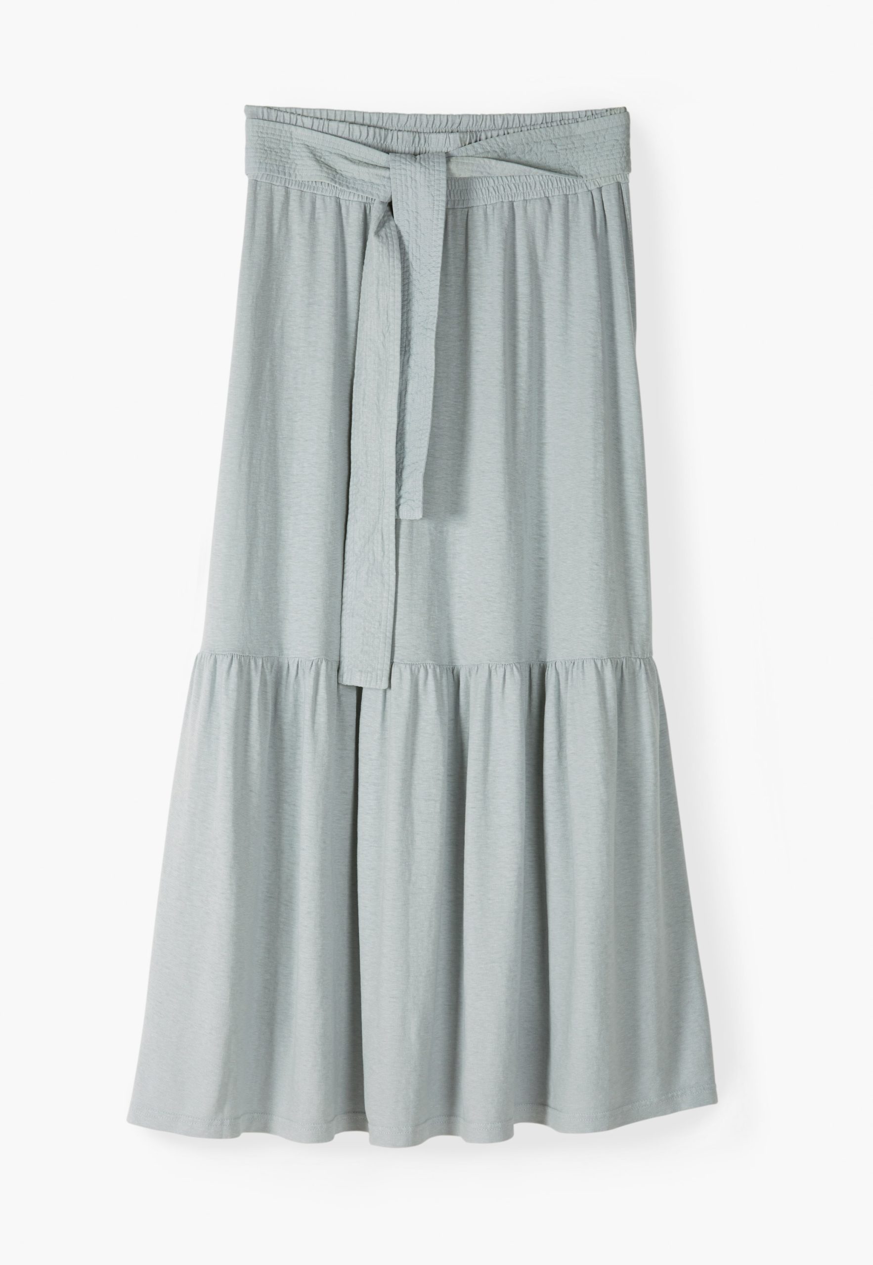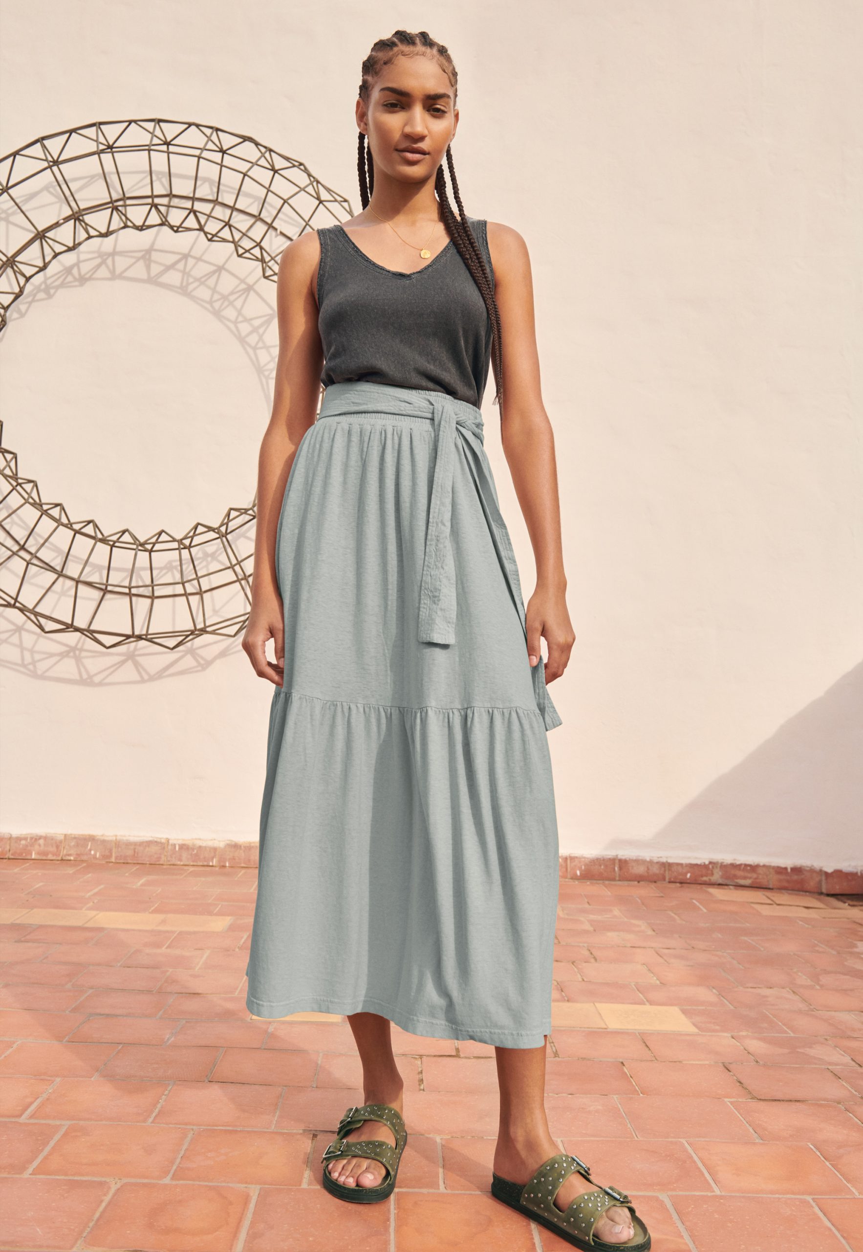 Swish into the season in this hemp and organic cotton tiered skirt. The deep elasticated waistband has gentle gathers to create an A-line silhouette and is finished with a removable tie belt. The perfect base for so many outfits.
