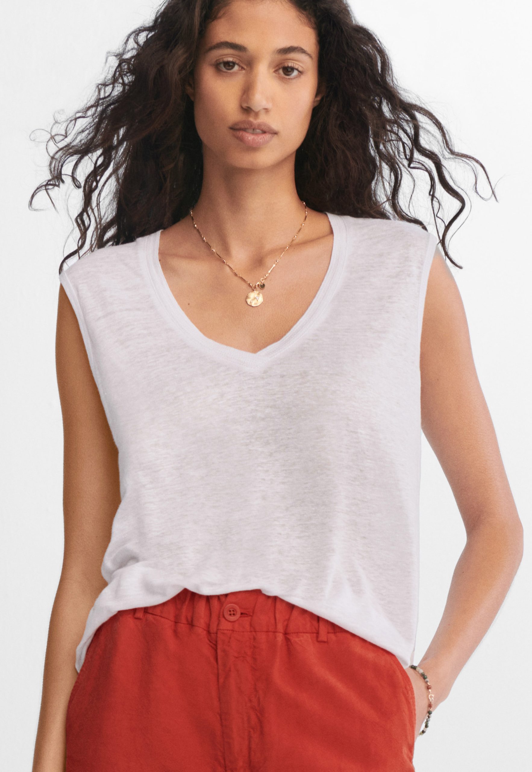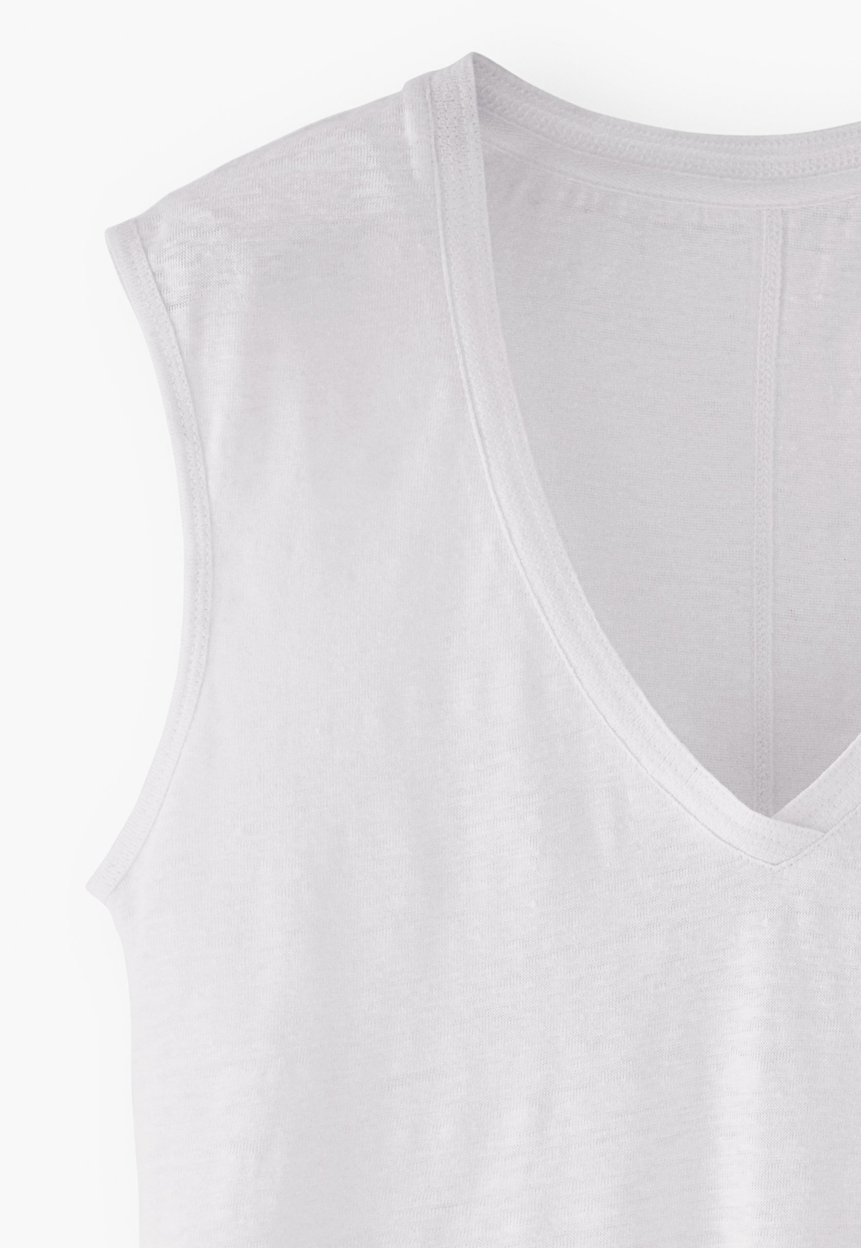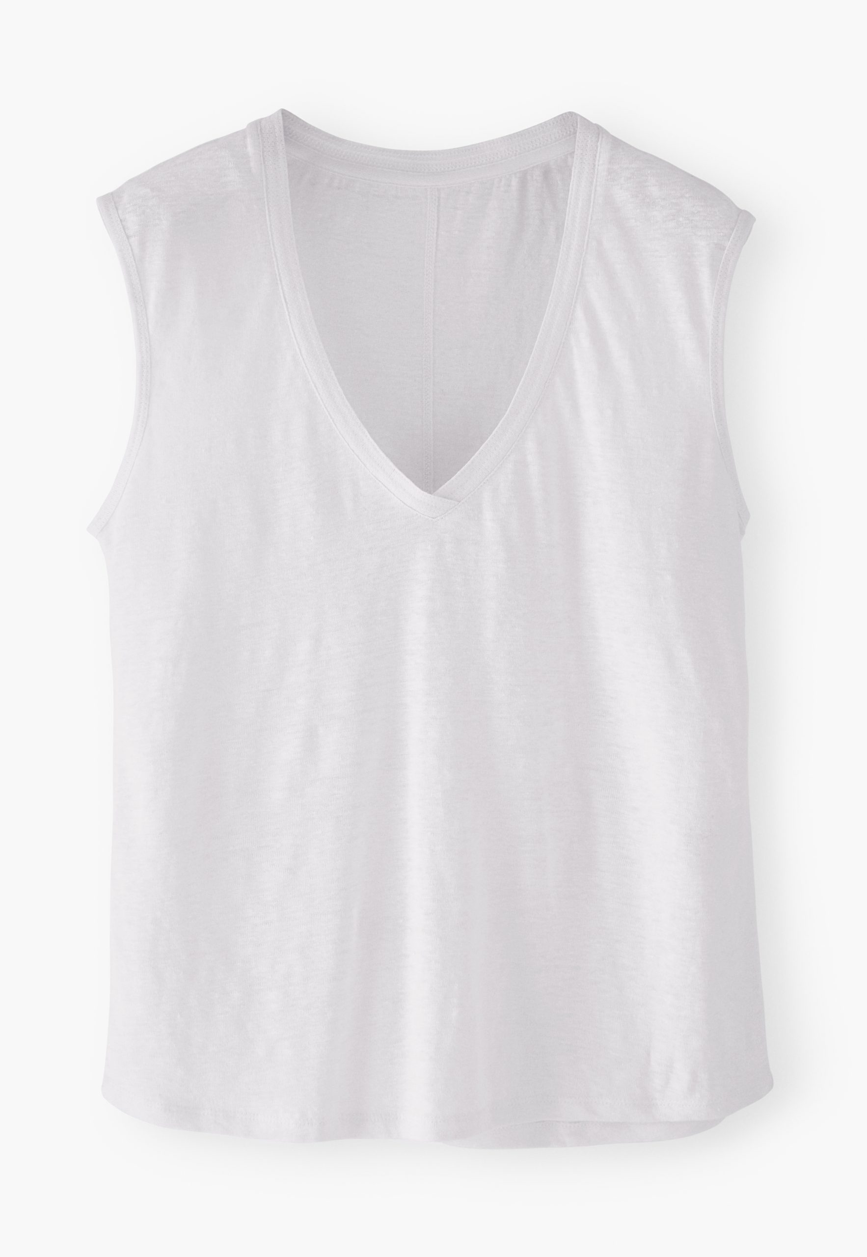 Tank-top styling in fine pure linen jersey. With wide shoulder straps, a v-neckline and a curved hem that is slightly longer at the back.