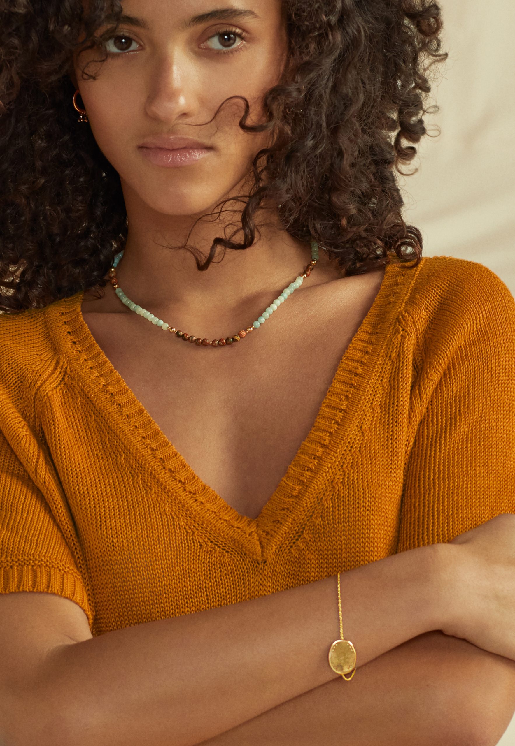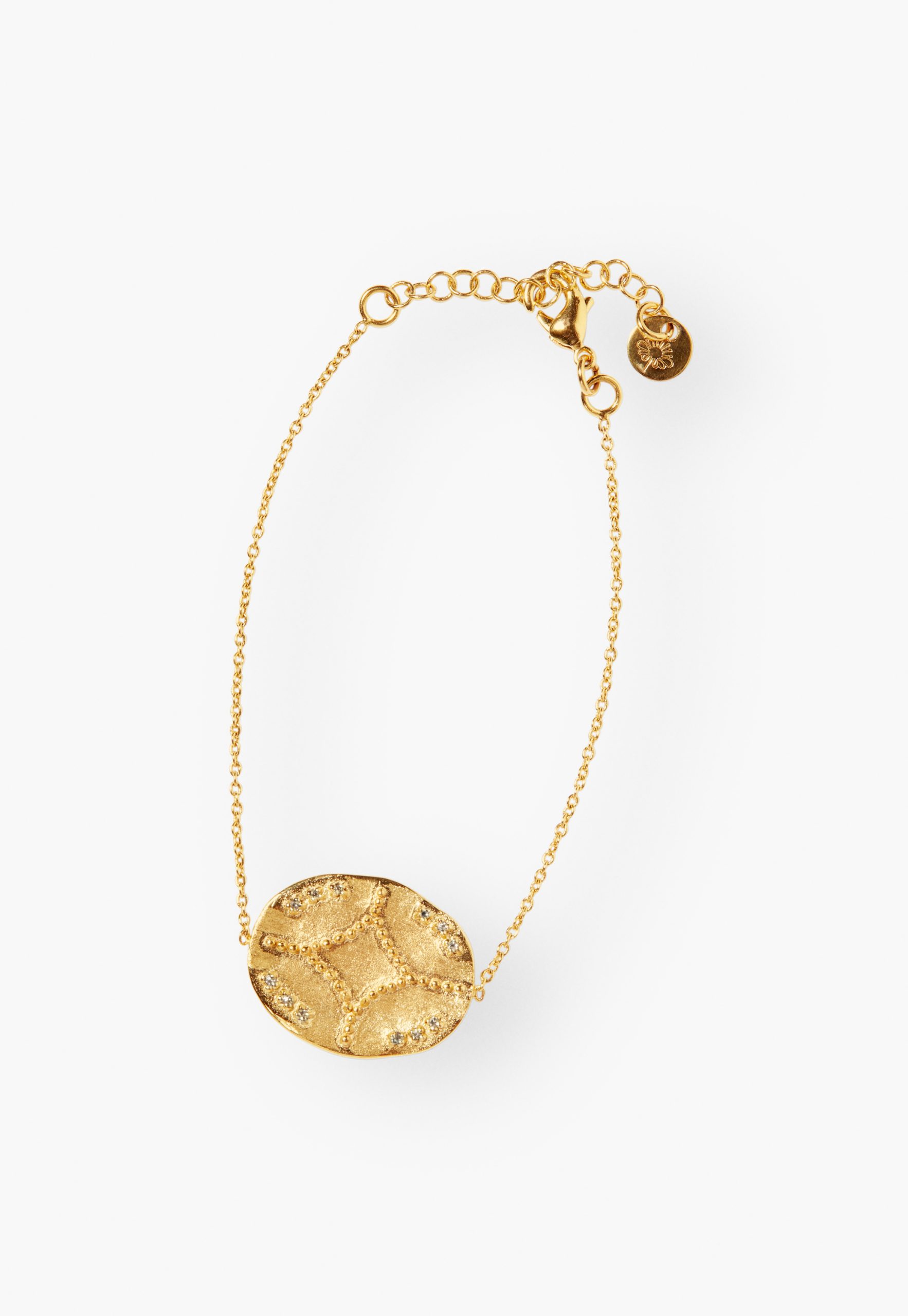 Urban jewellery with a travelling soul from designer Louise Kendricks. A beautiful fine-gold chain bracelet with a brushed gold pendant engraved paved with mini zircons to catch the light.