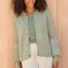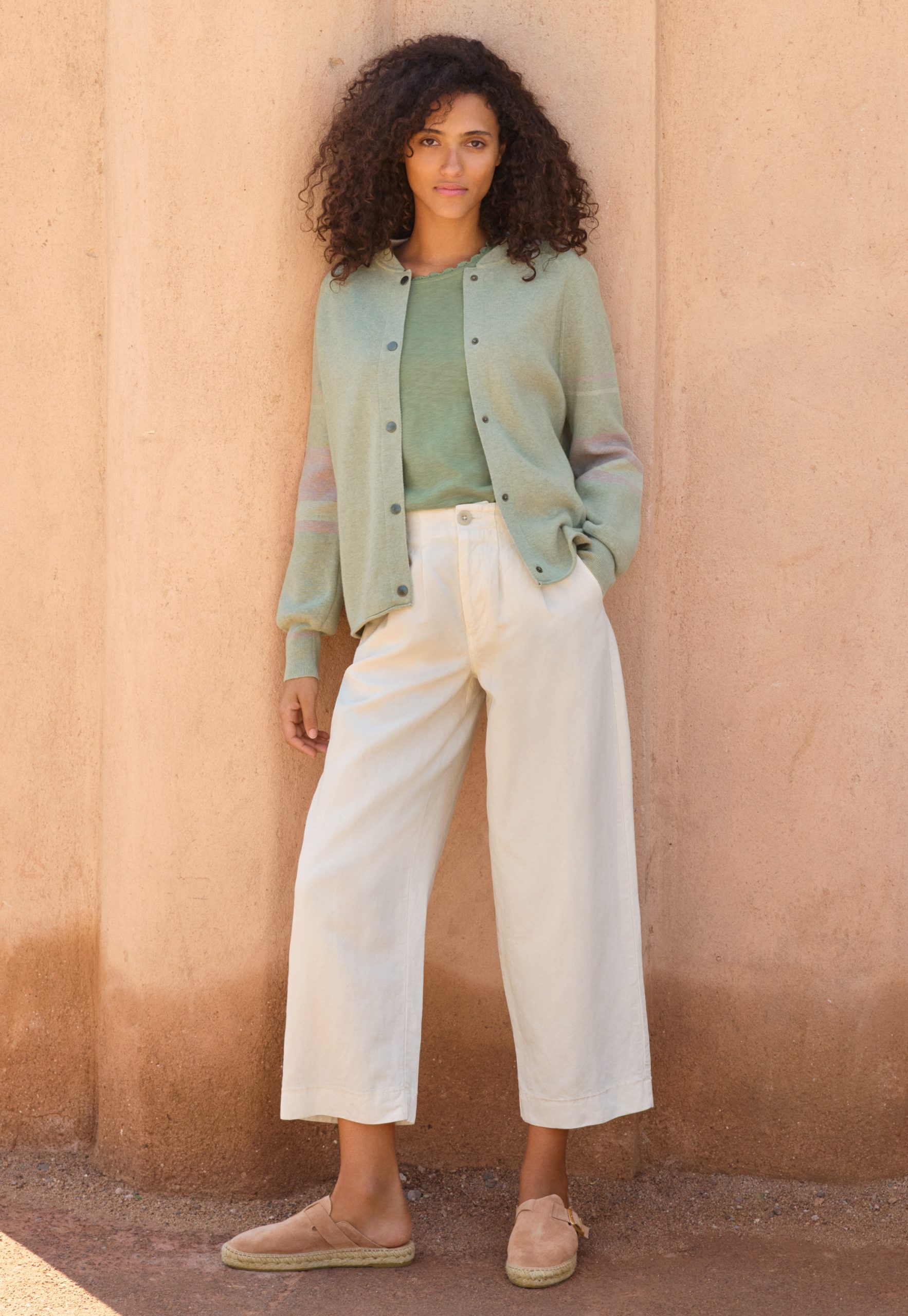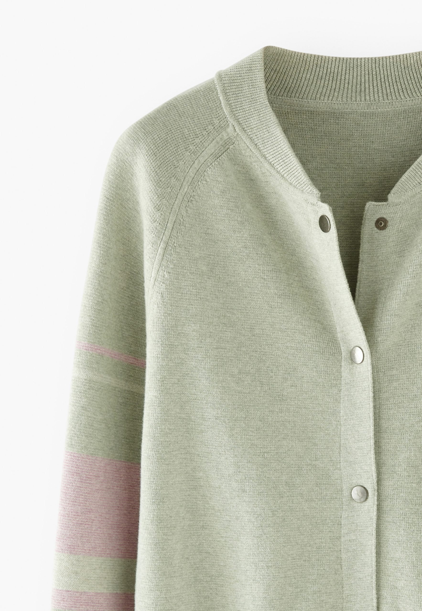 There’s a touch of bomber jacket styling with this smooth knitted cotton jacket. It’s beautifully finished with neat stripy rib cuffs and a roll-back detail at the hem.