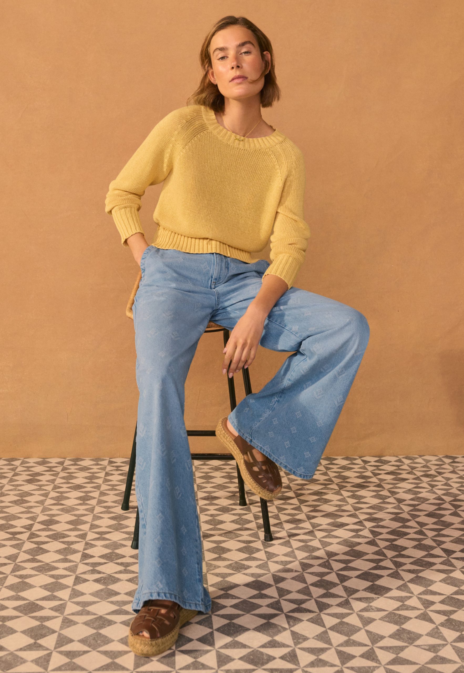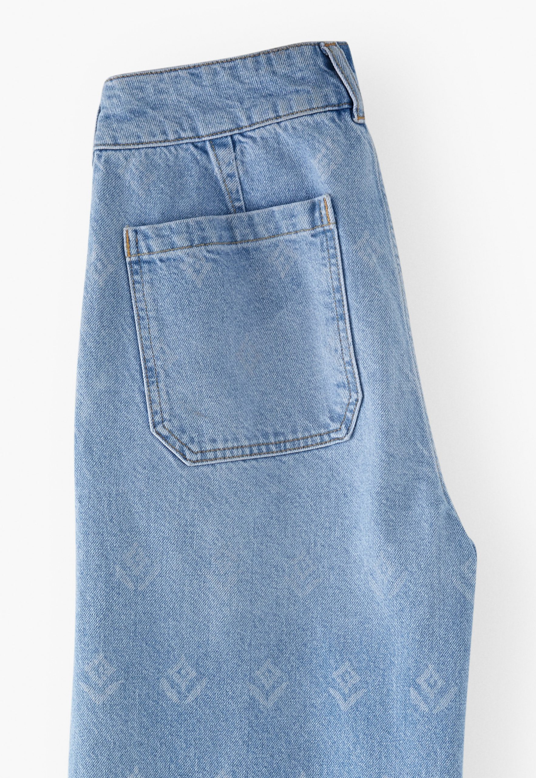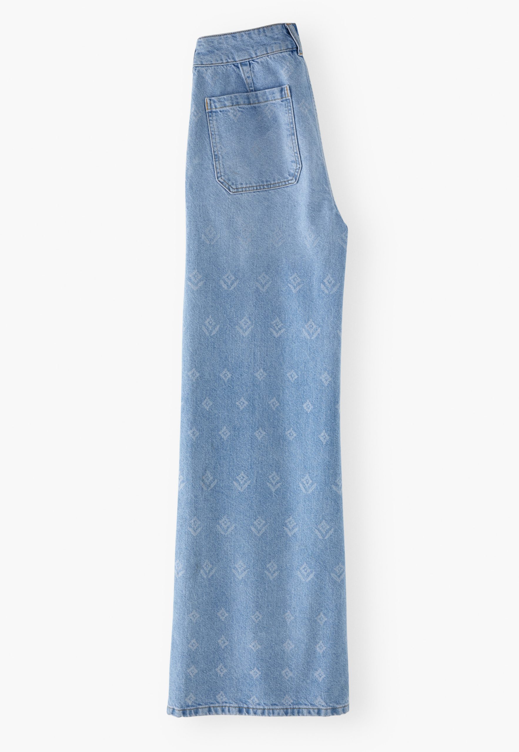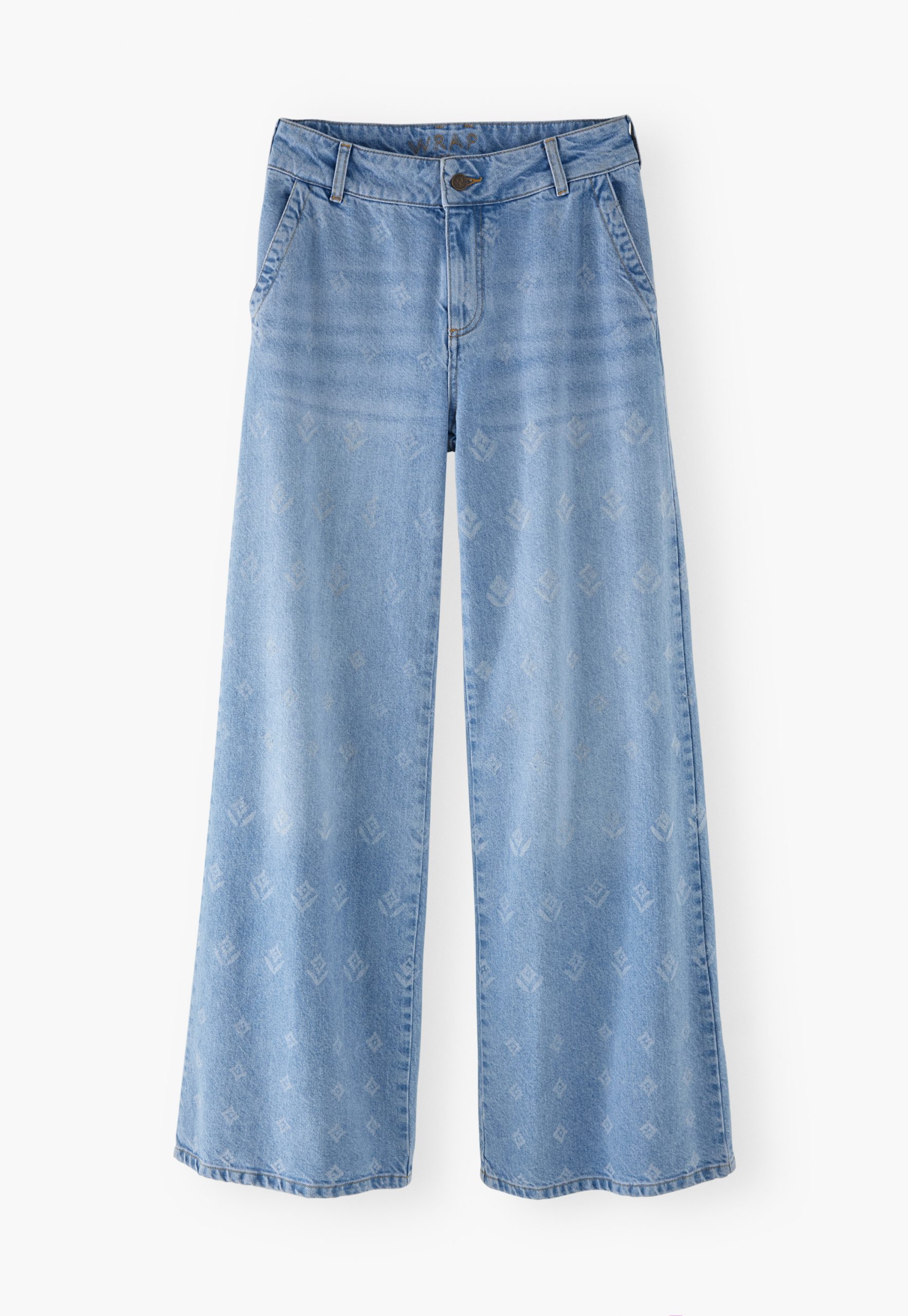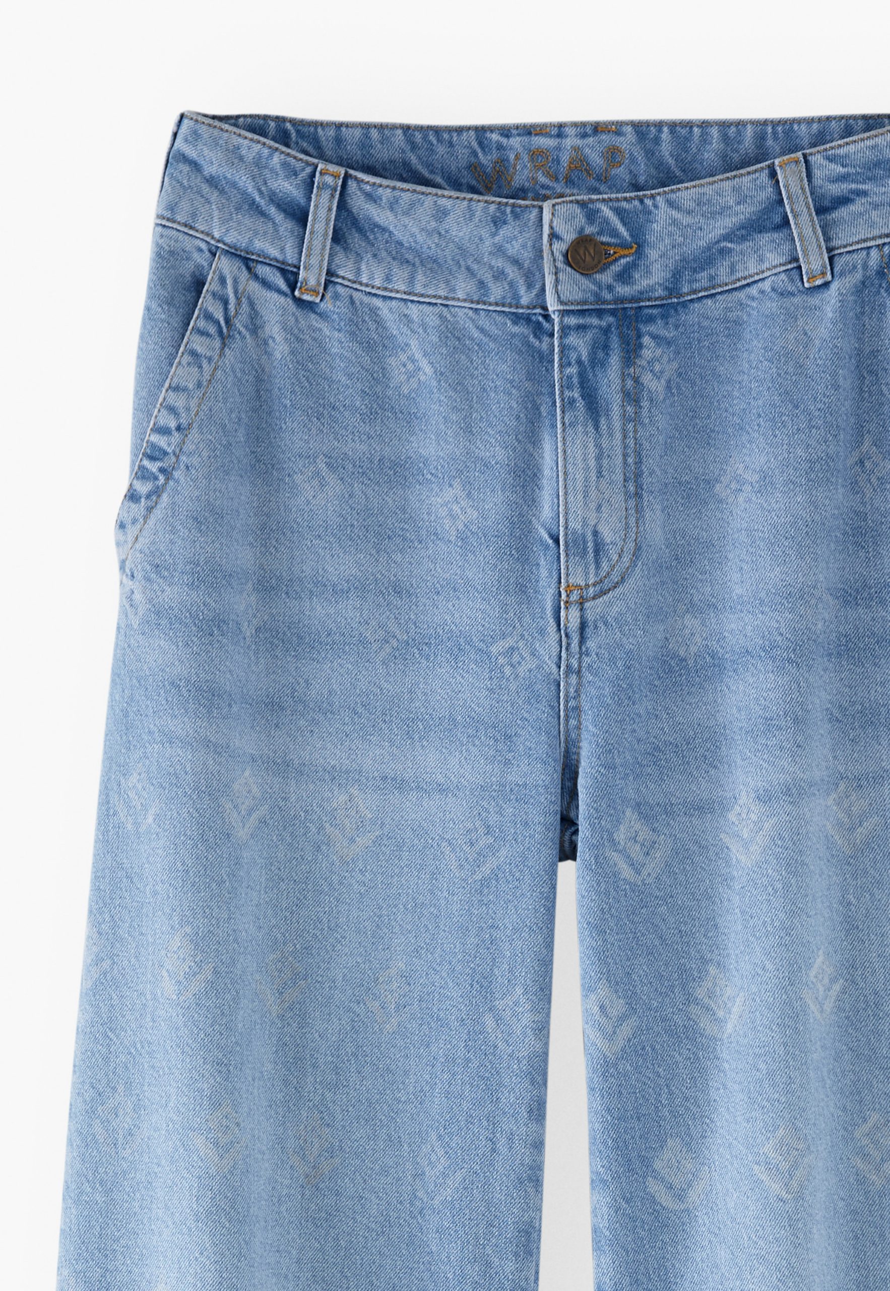 Bringing a new look for your jeans this season, these high-waisted wide-leg jeans in substantial blue denim have been lasered to reveal an exclusive Wrap London abstract repeat motif that’s subtle yet striking.