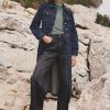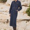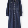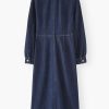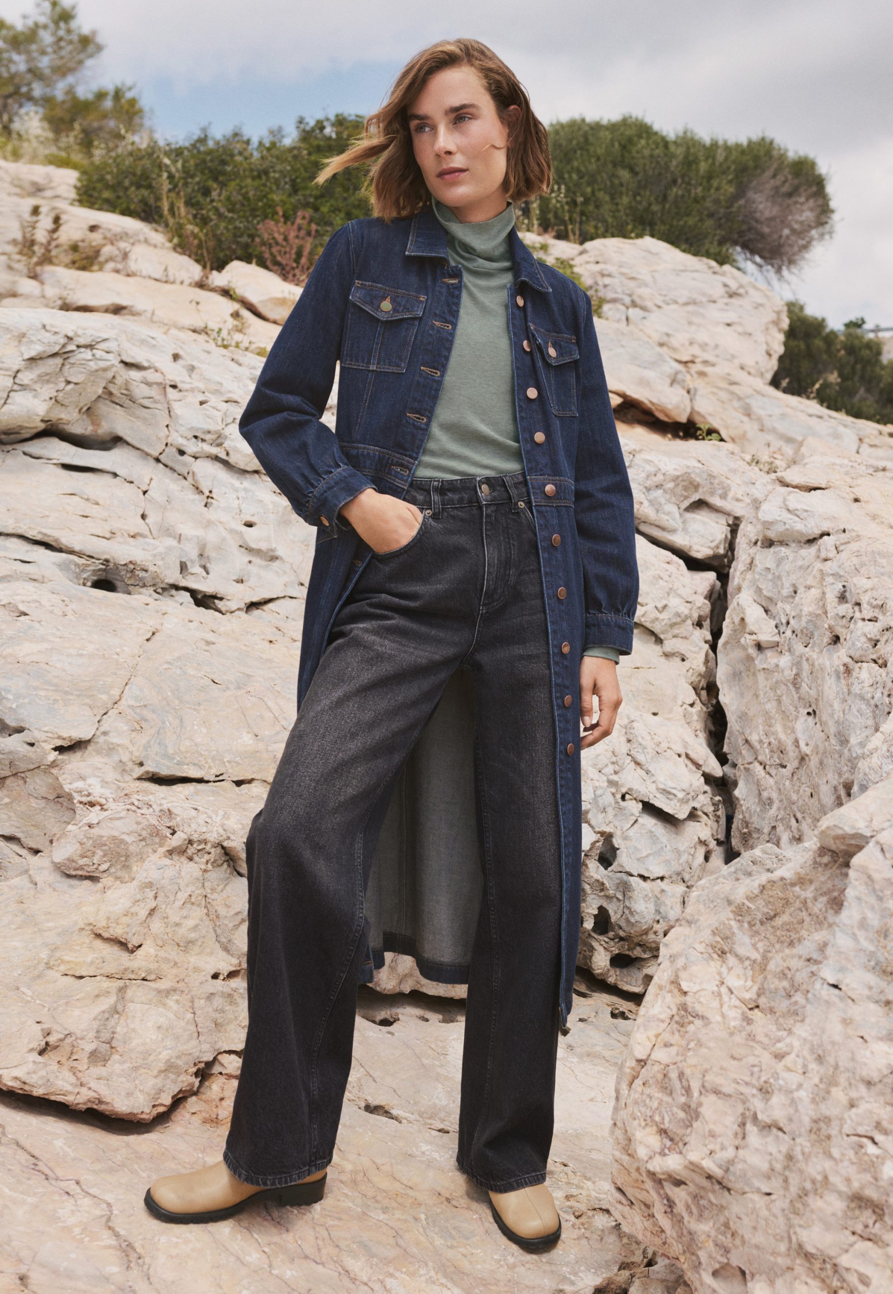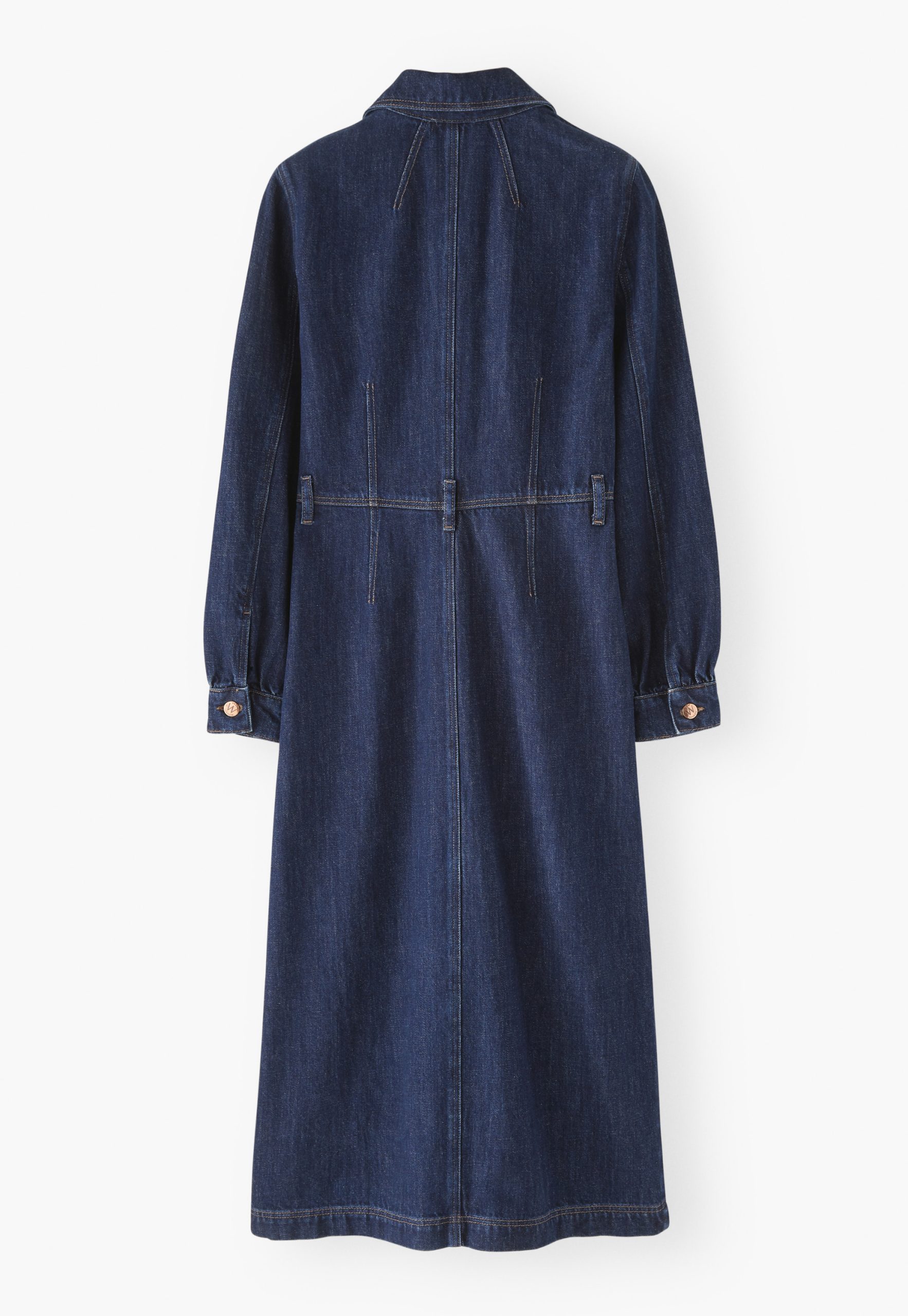A deep indigo shirtdress made from substantial cotton and hemp denim. In a straight, regular fit with utility styling – copper hardware and contrast stitching. Wear with bare legs and trainers until the temperature drops.