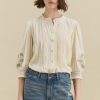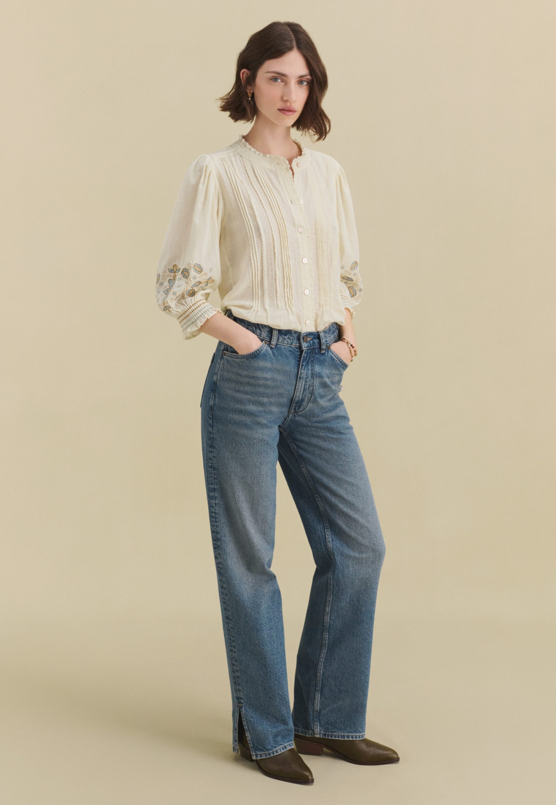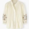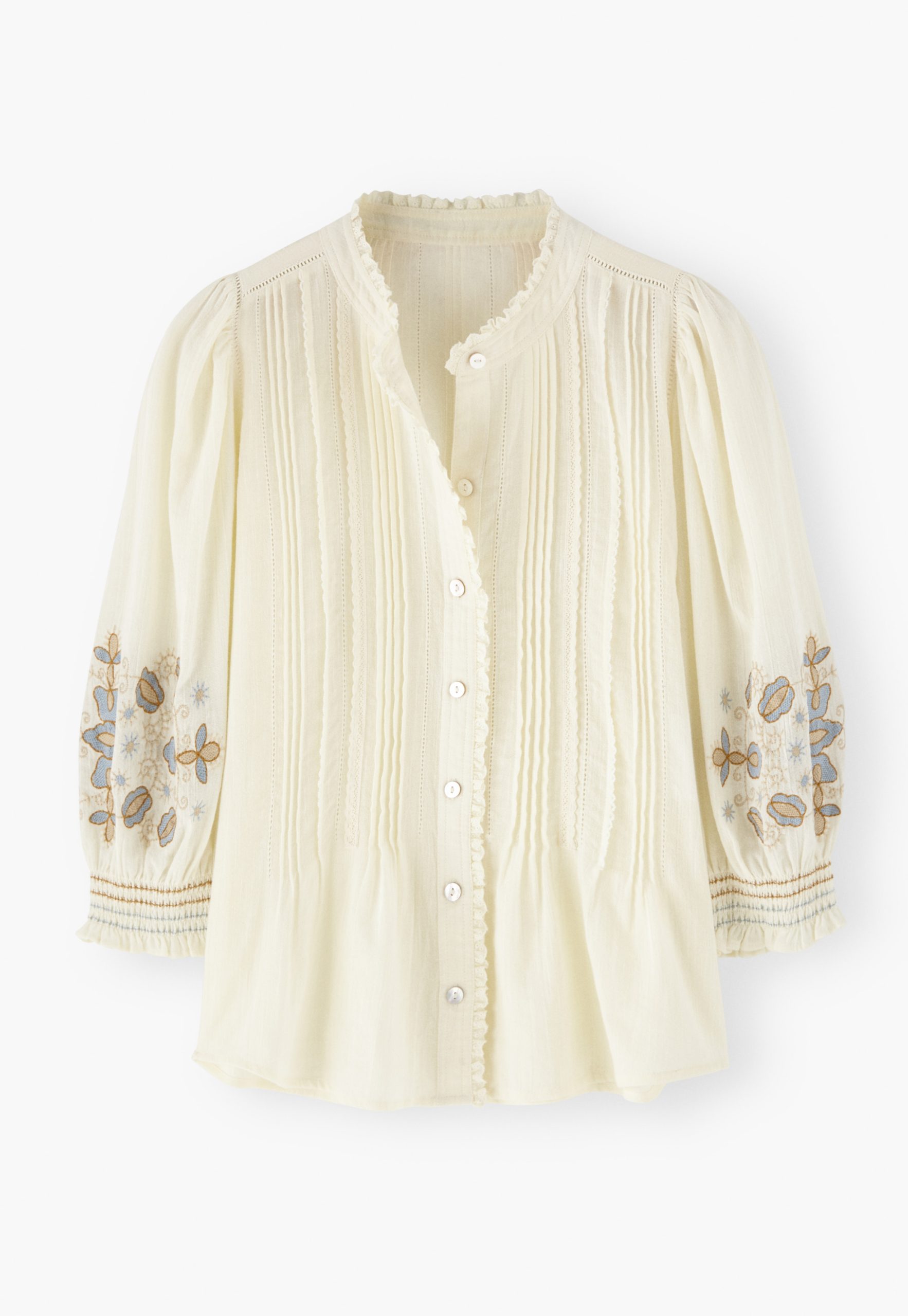 A breezy cotton blouse with intricate abstract floral embroidery on the blouson sleeves. In a relaxed fit with lace and pintuck details front and back, it’s perfect weekend brunch wear.
