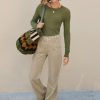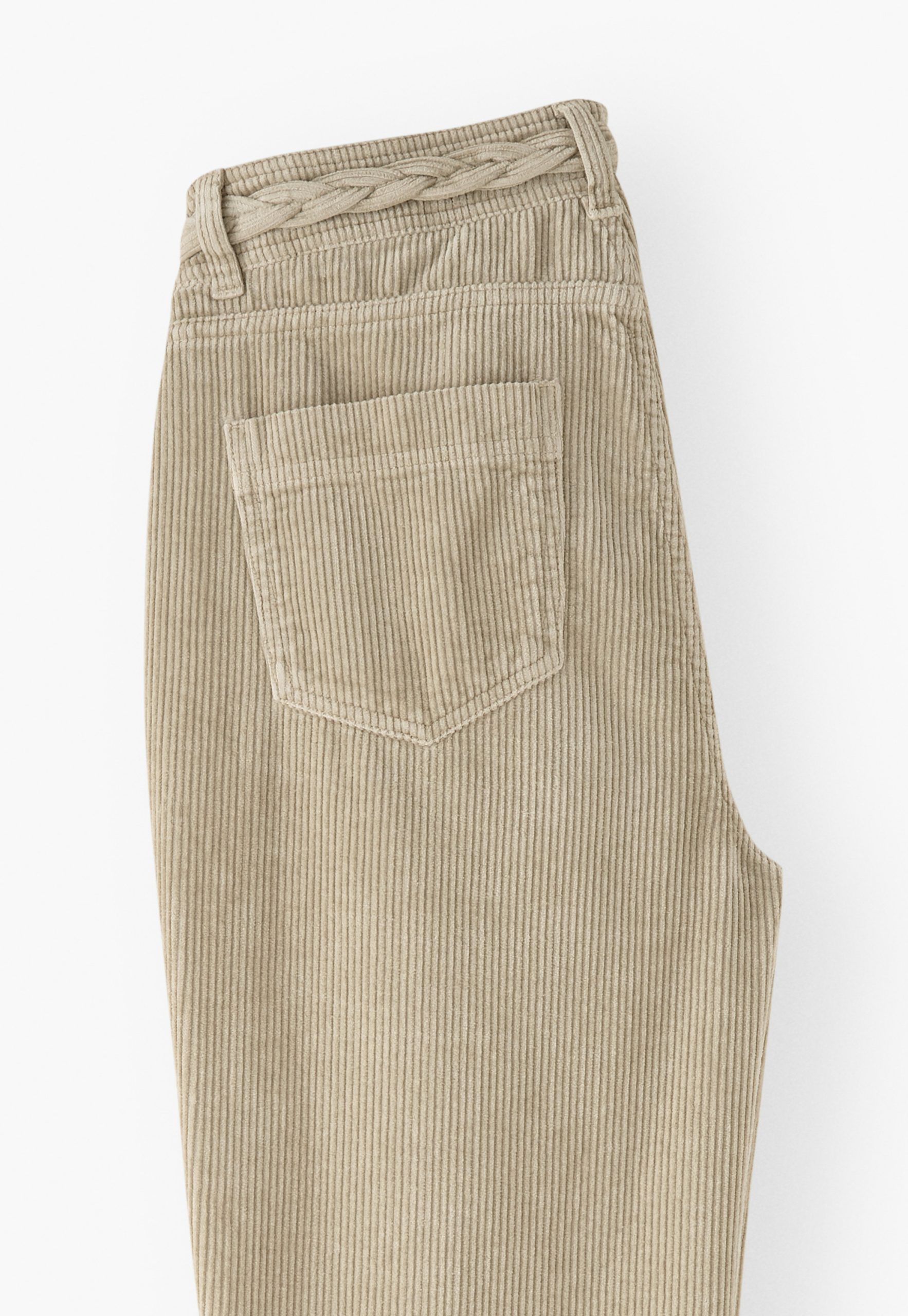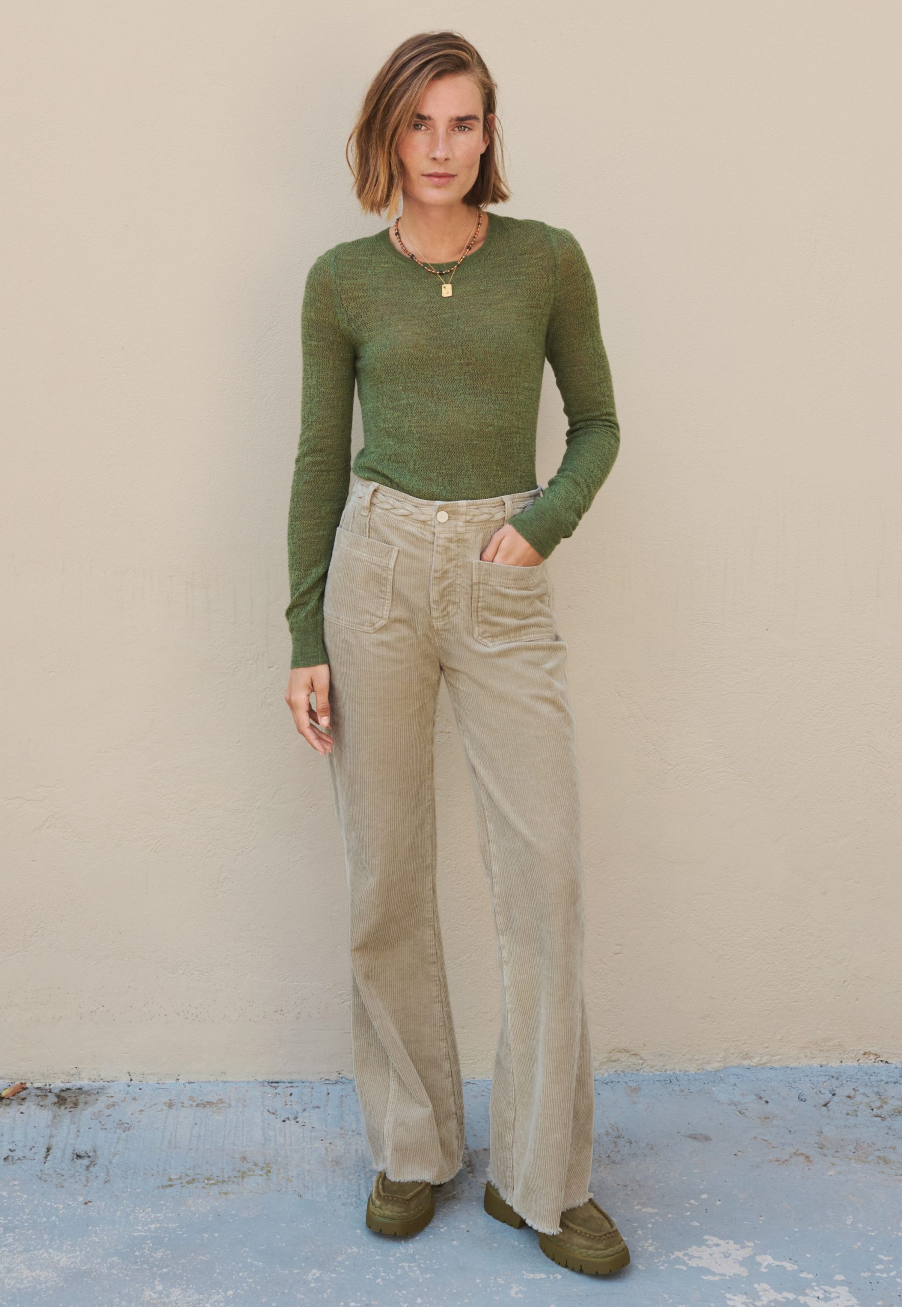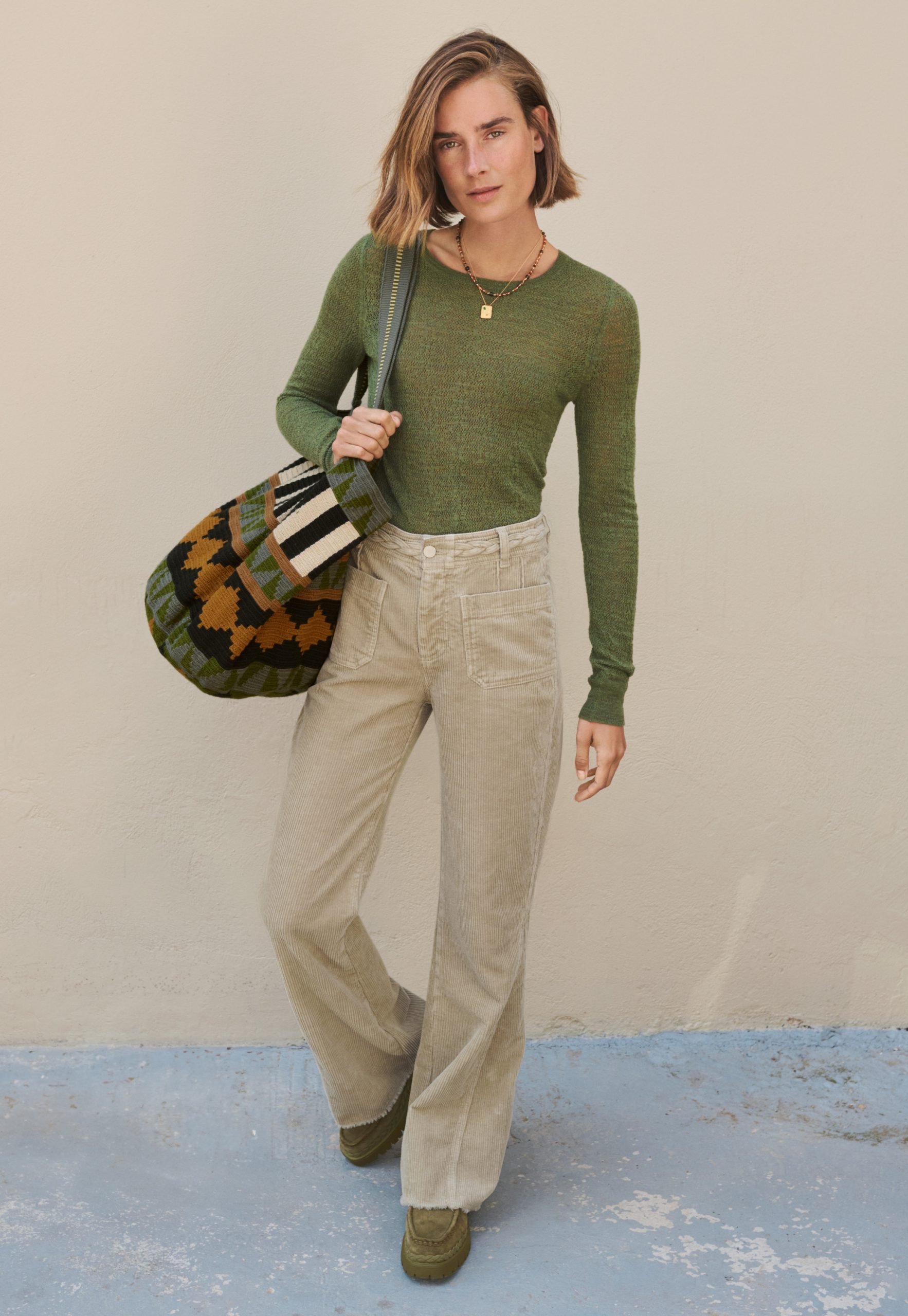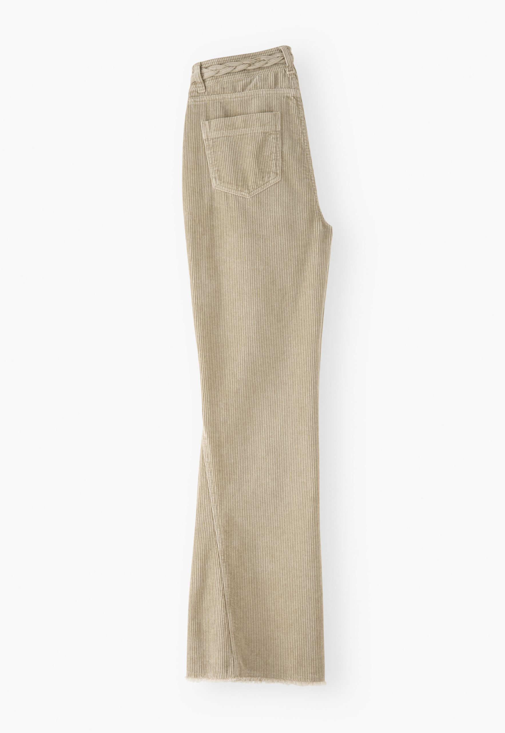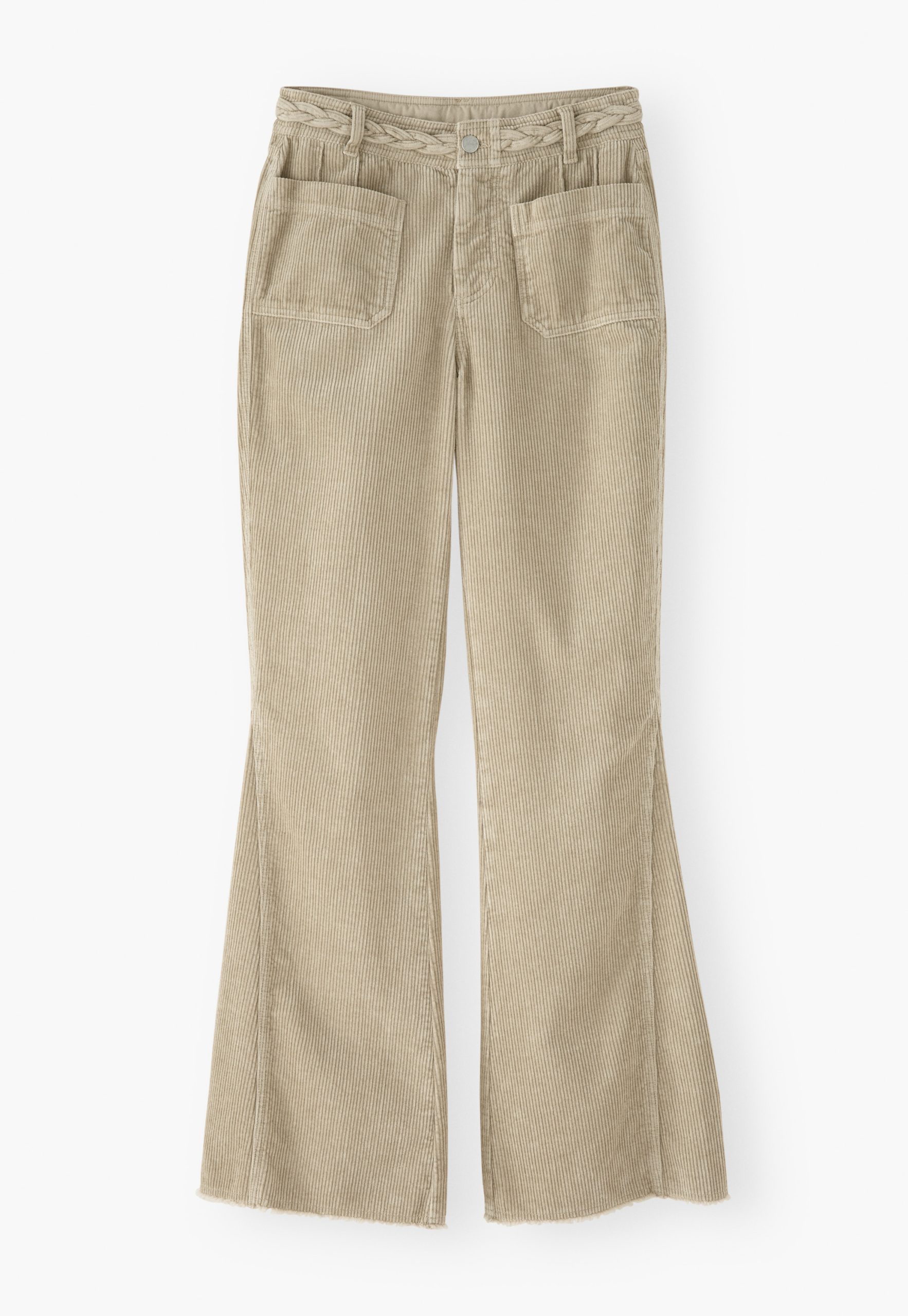 In autumn’s favourite fabric, these high-waist fine-wale cord trousers have a leg-lengthening flare shape and a fab plait detail at the waistband. Seventies spirit is referenced with the raw hem-finish and neat patch-pockets.