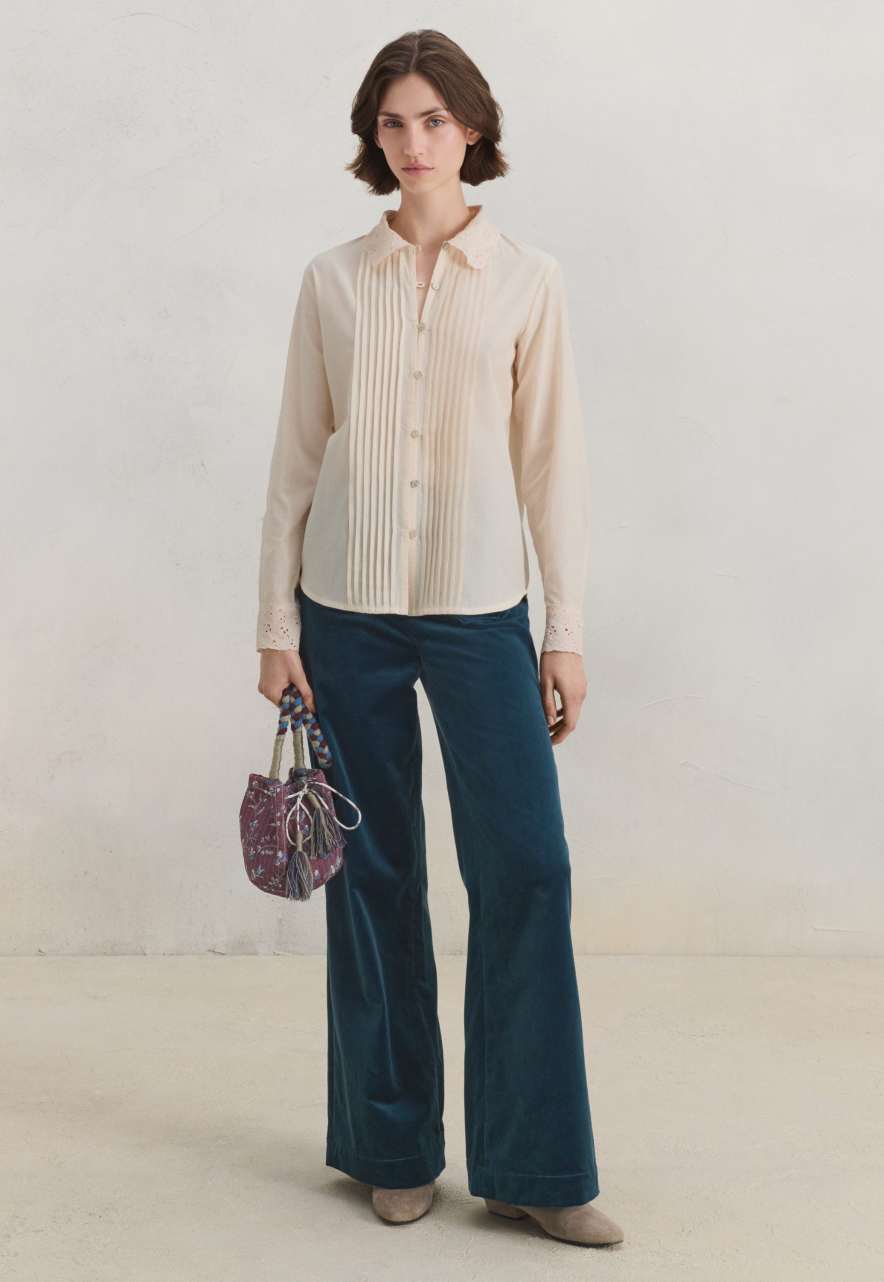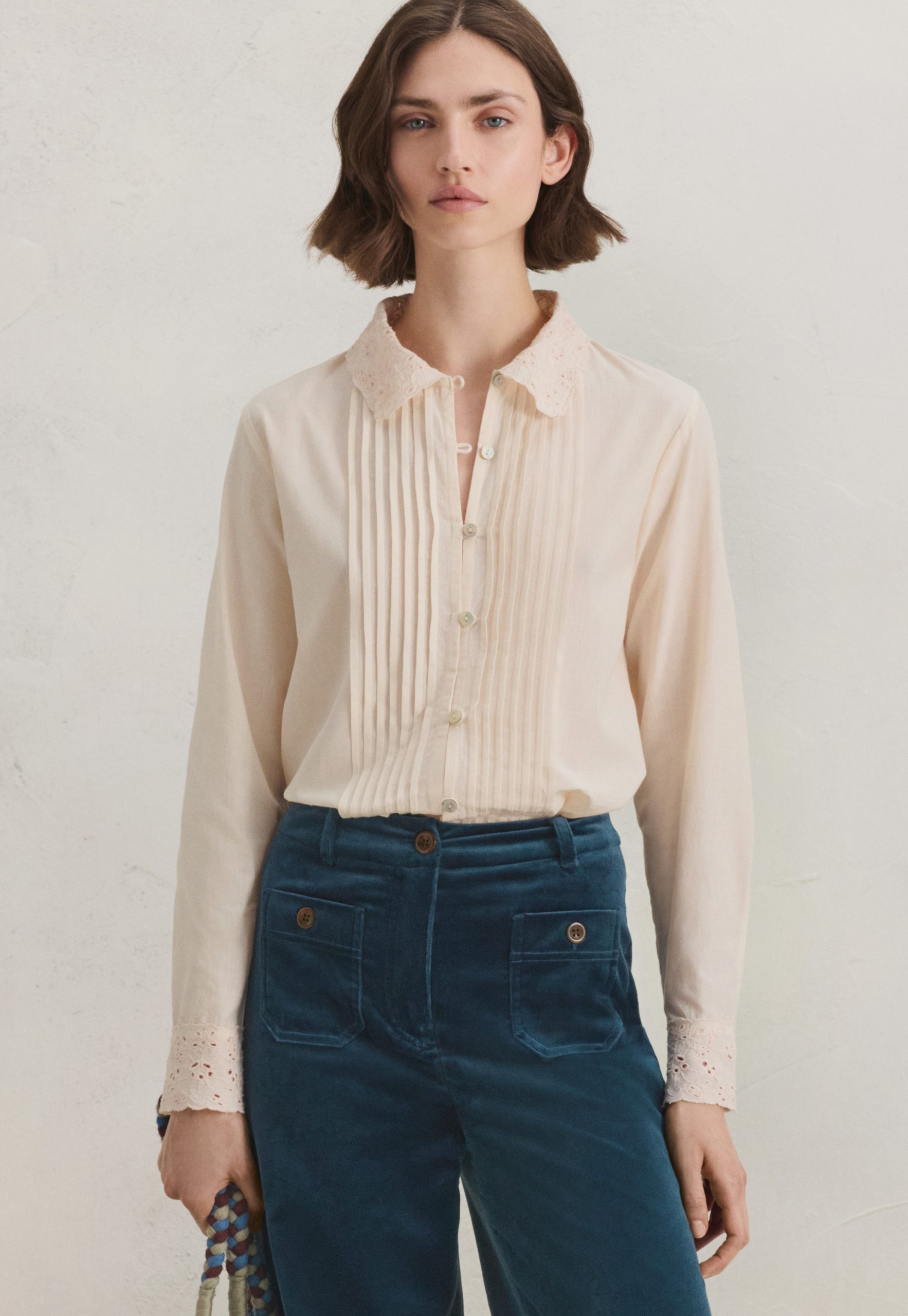 - Embroidery cutwork at cuffs
