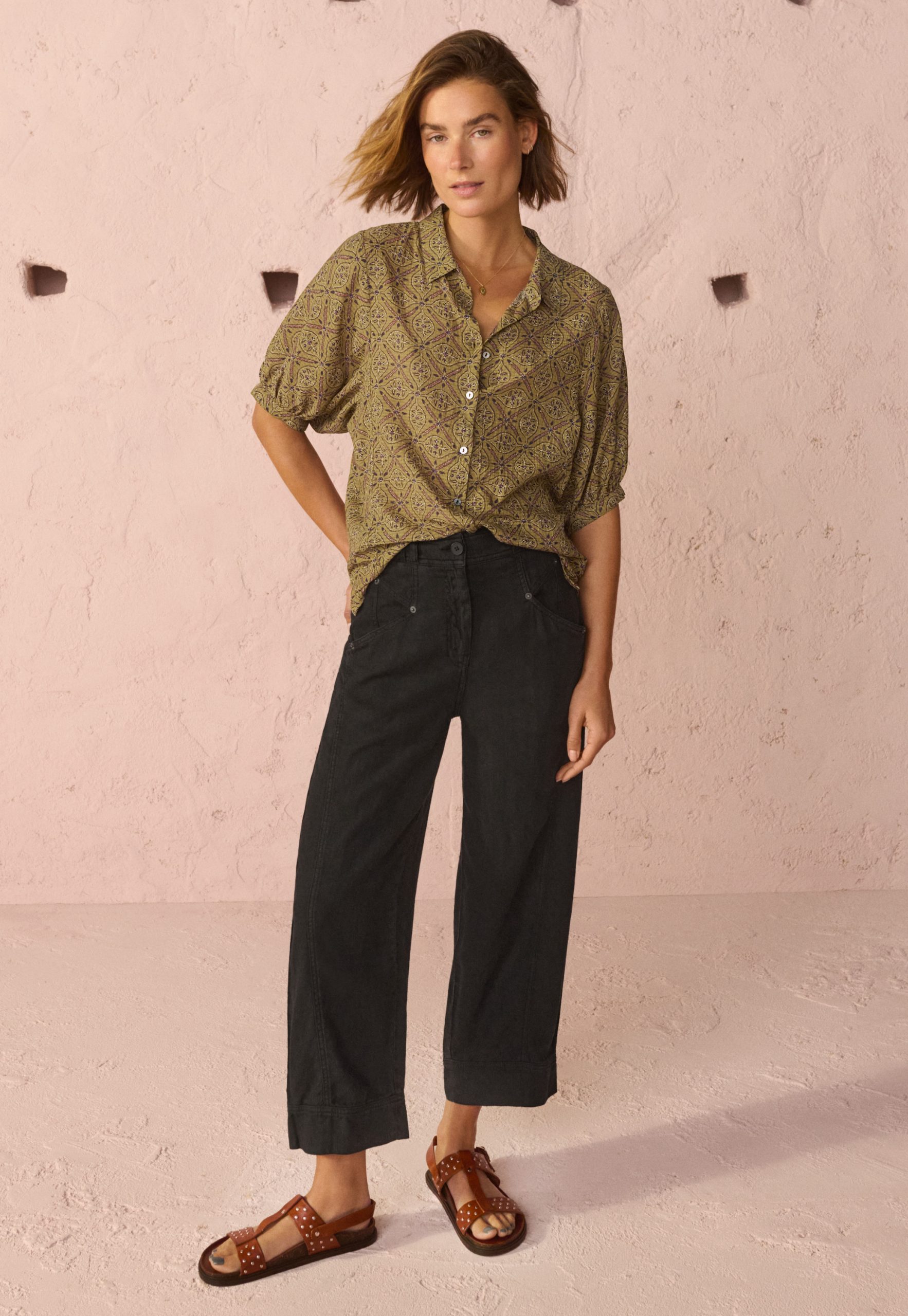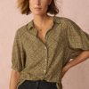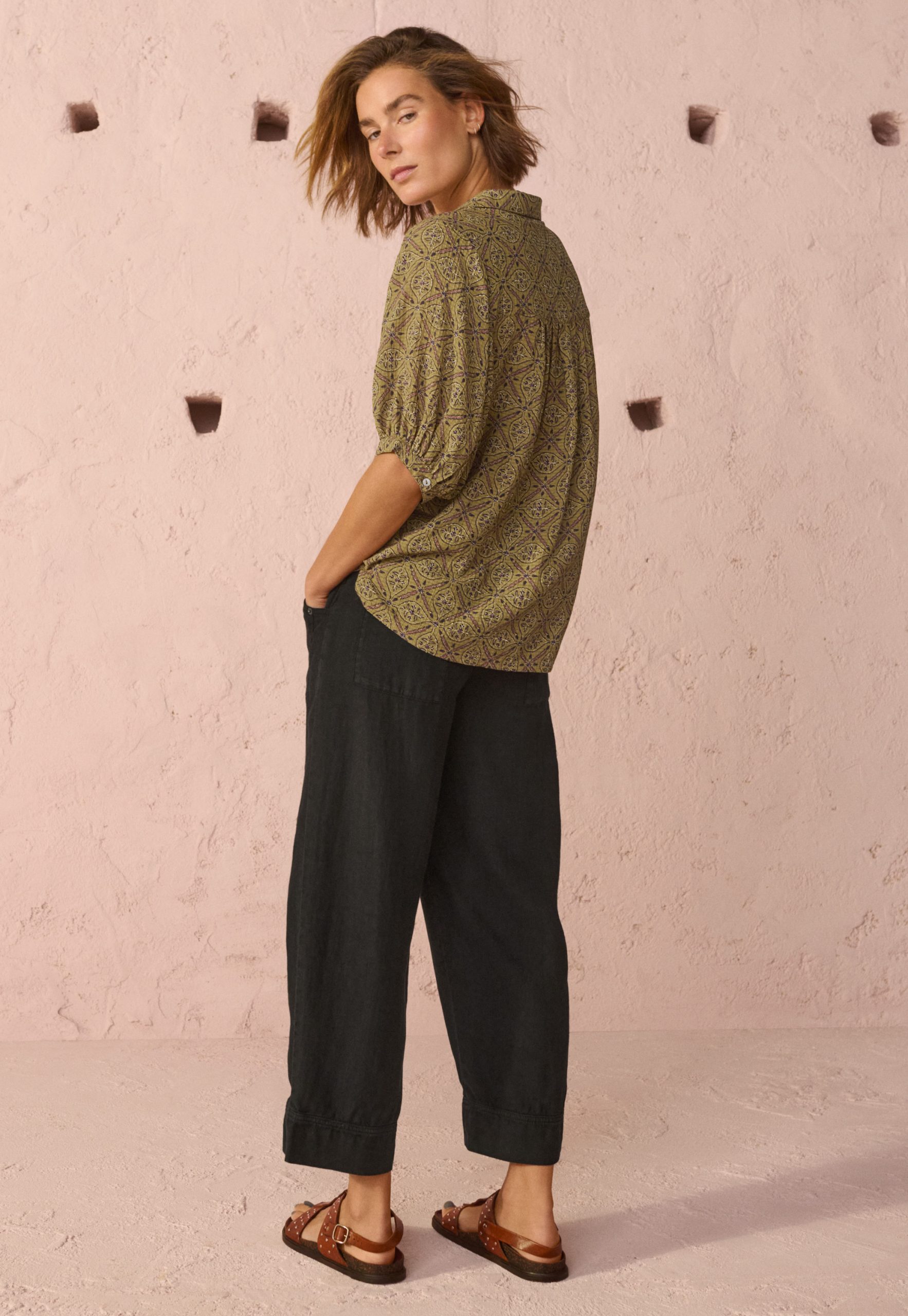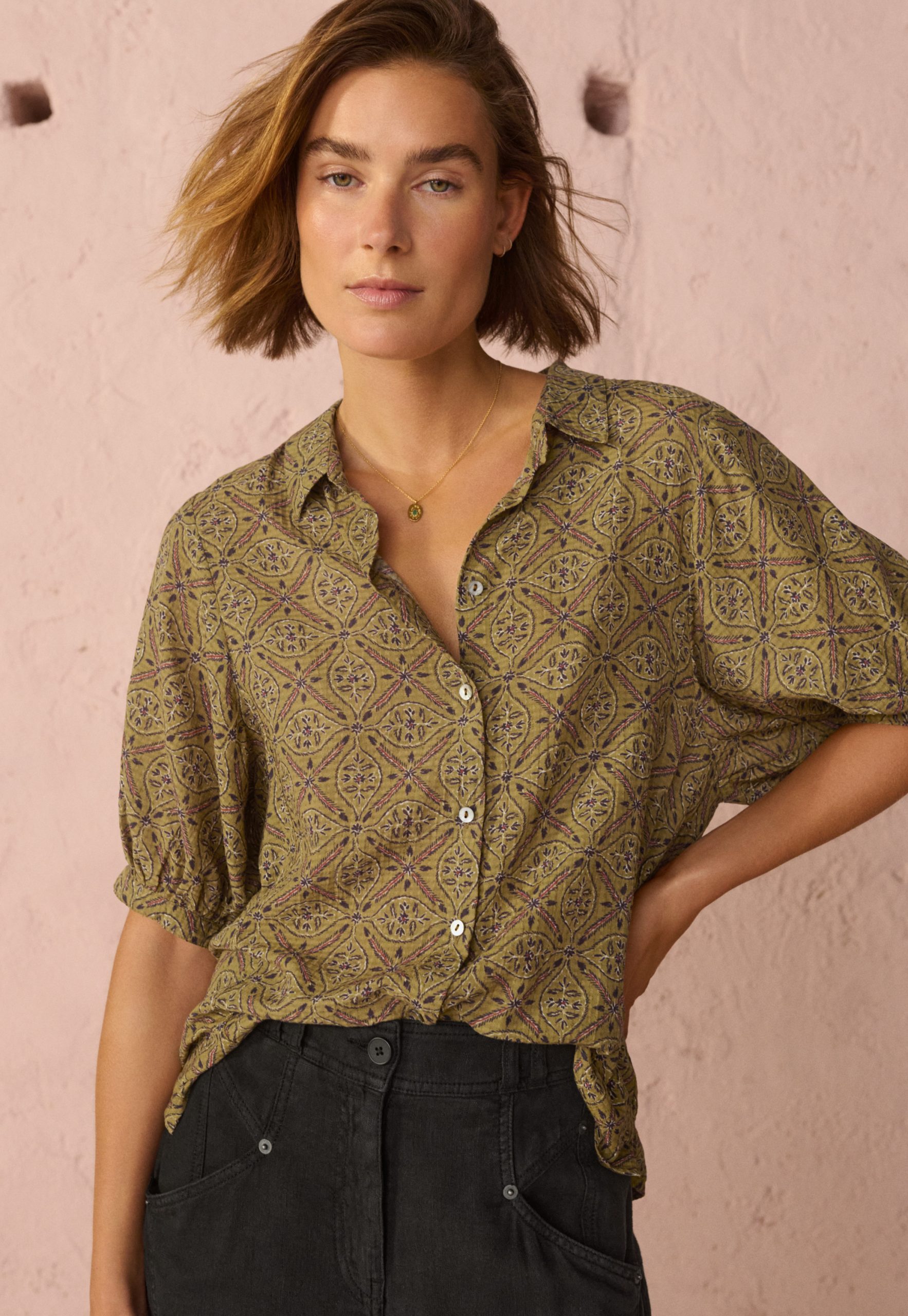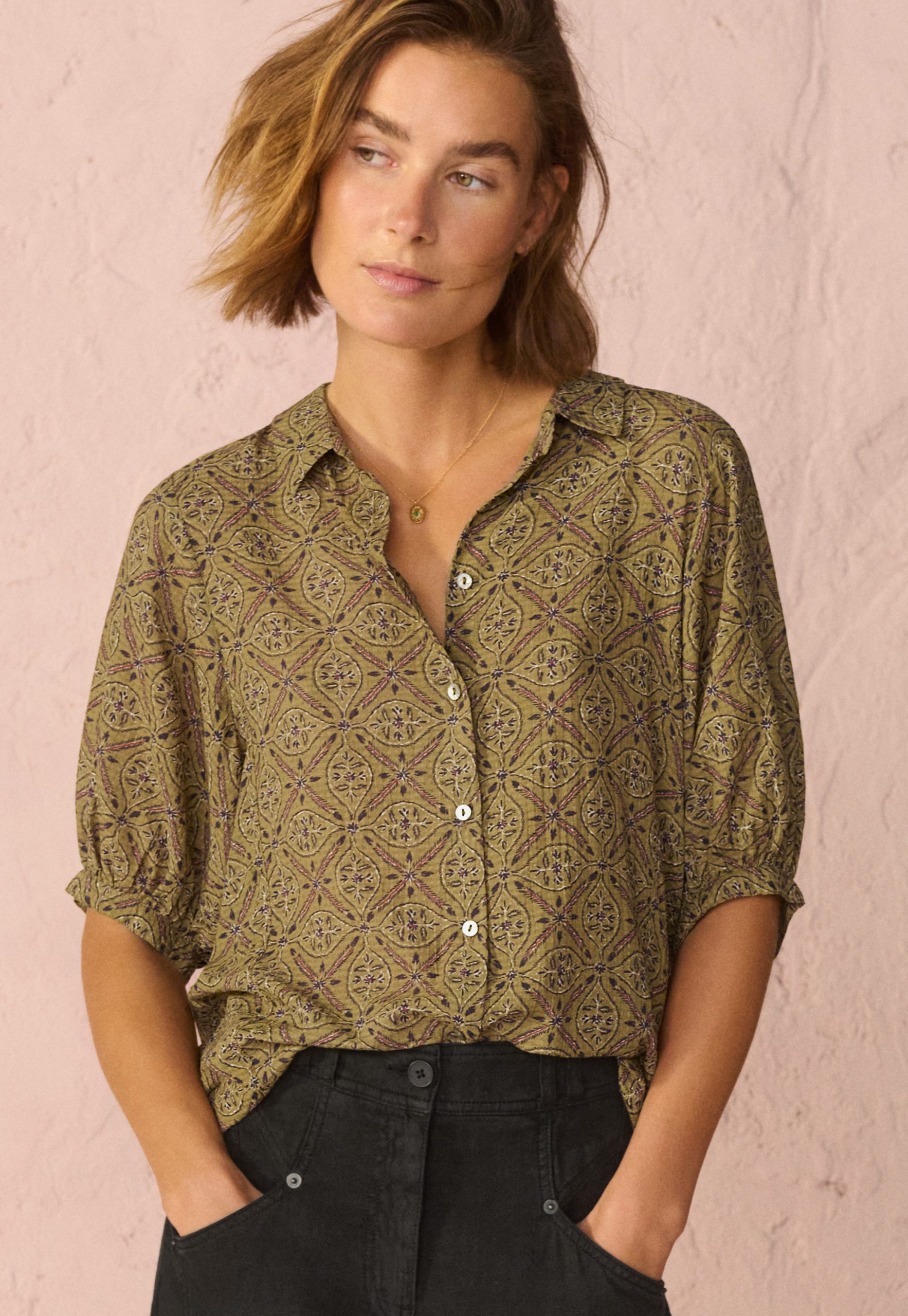 A soft and drapey lightweight cotton modal button-through blouse featuring an exclusive Wrap London print. Relaxed and roomy with breezy elbow-length blouson sleeves that gather to finish with a neat cuff.