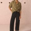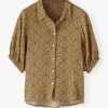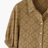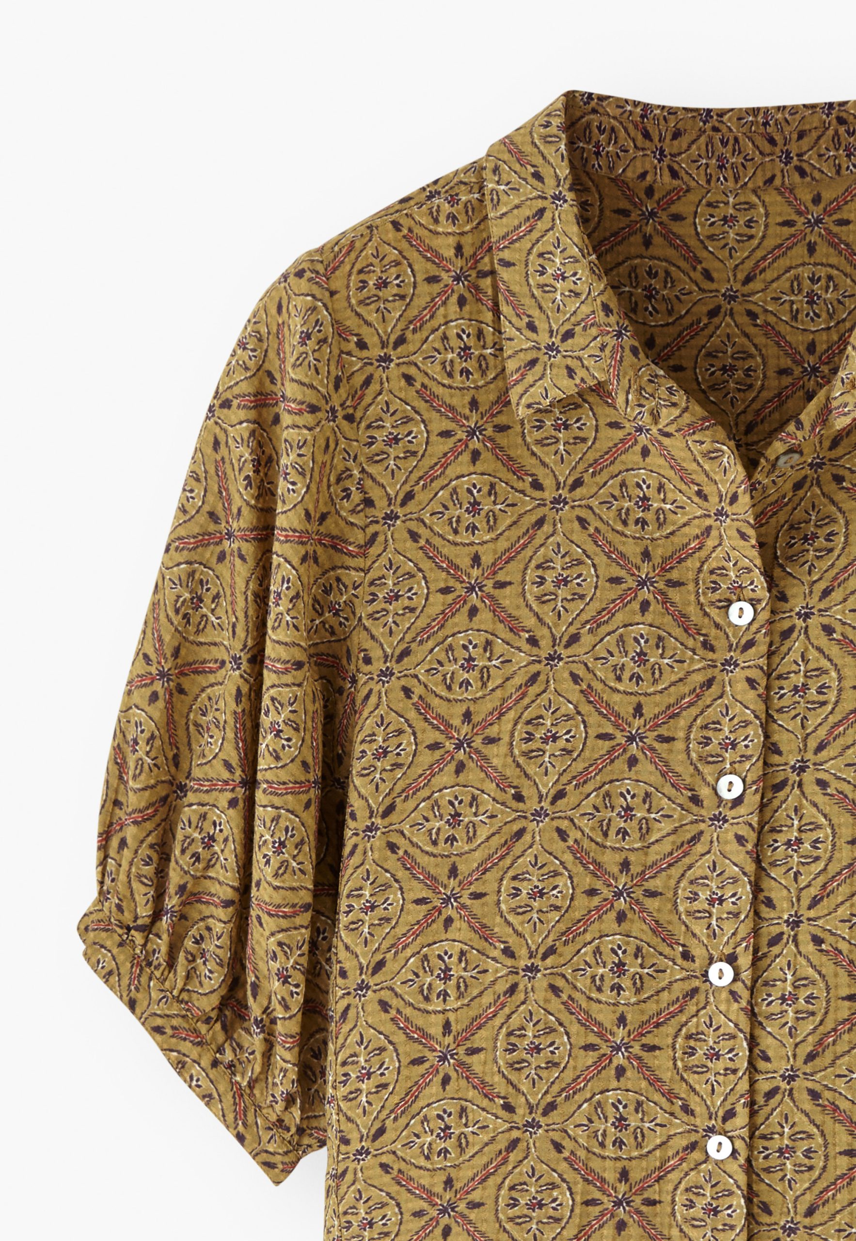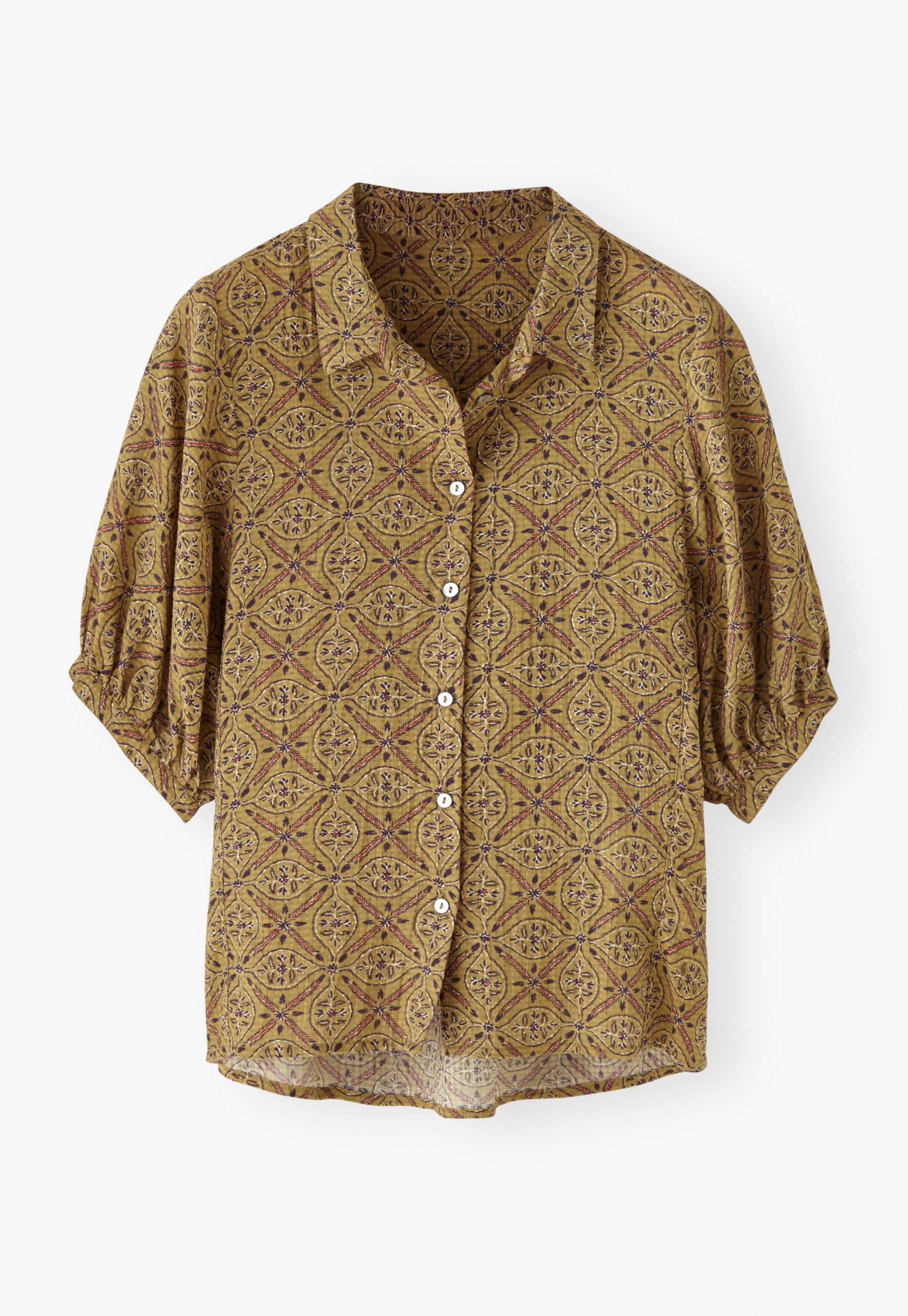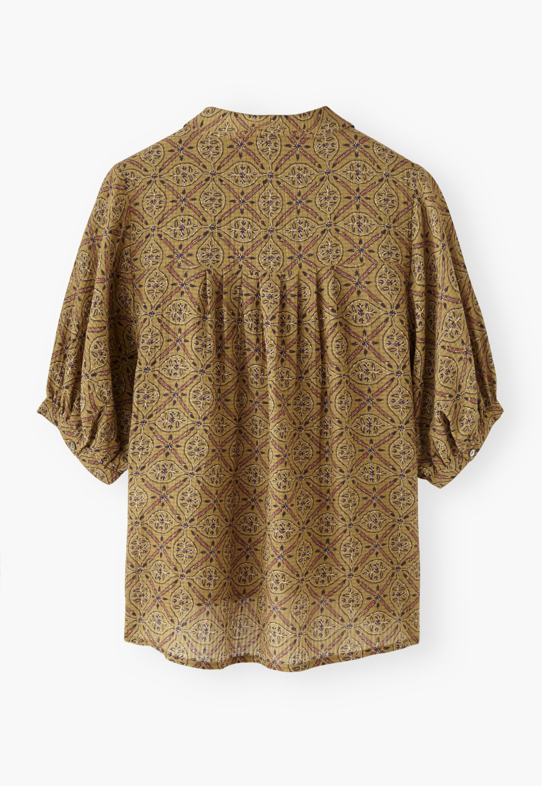 A soft and drapey lightweight cotton modal button-through blouse featuring an exclusive Wrap London print. Relaxed and roomy with breezy elbow-length blouson sleeves that gather to finish with a neat cuff.