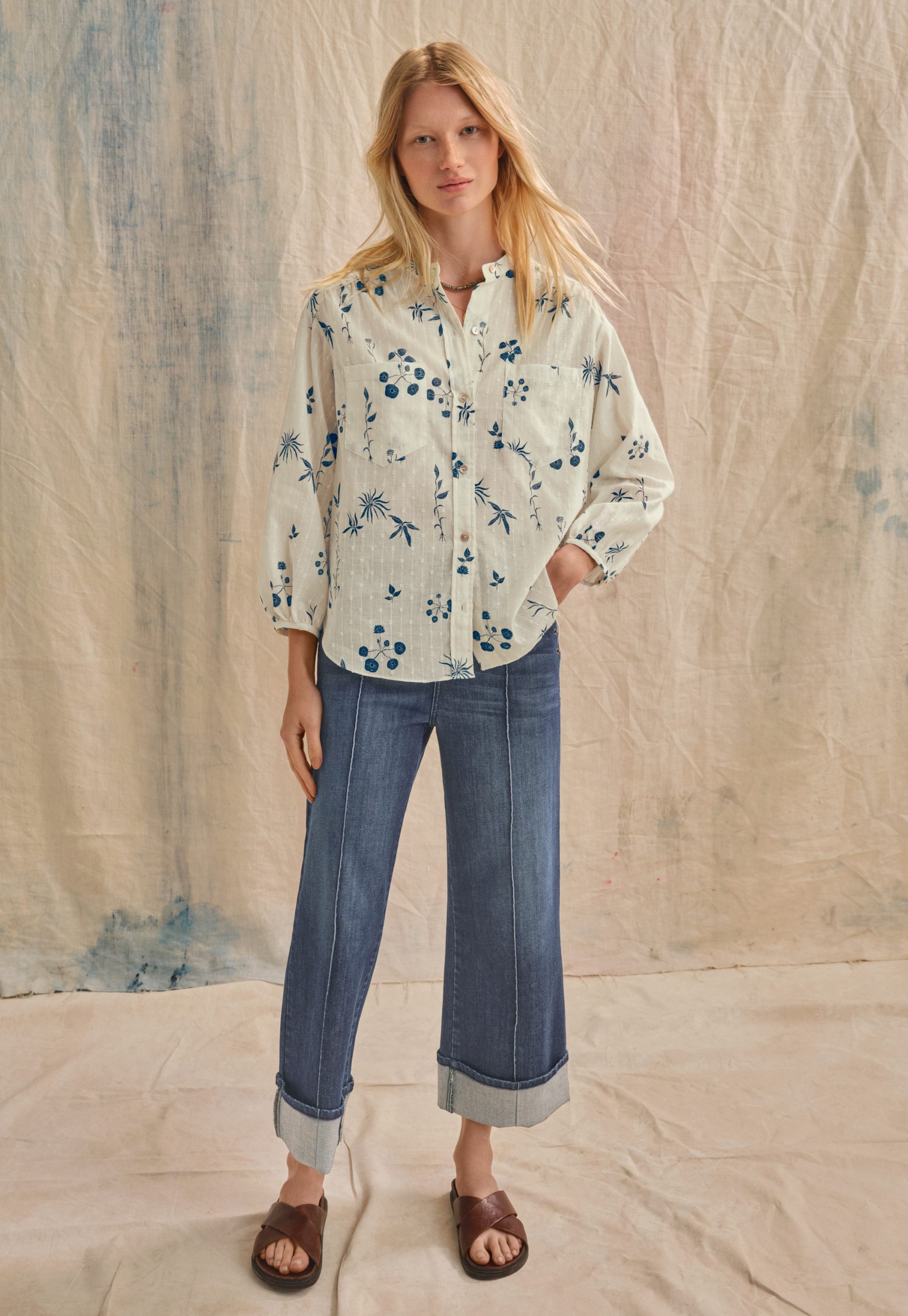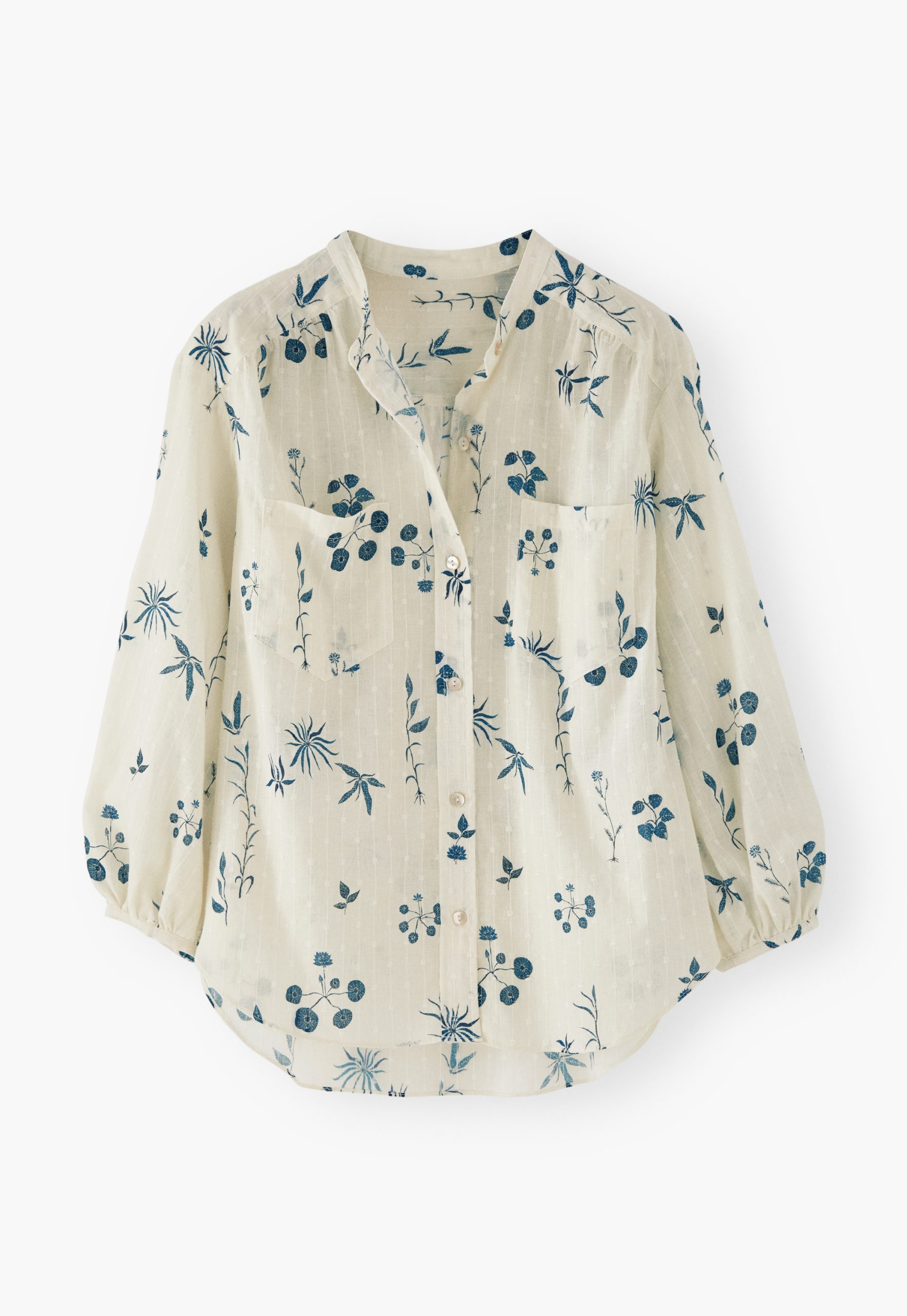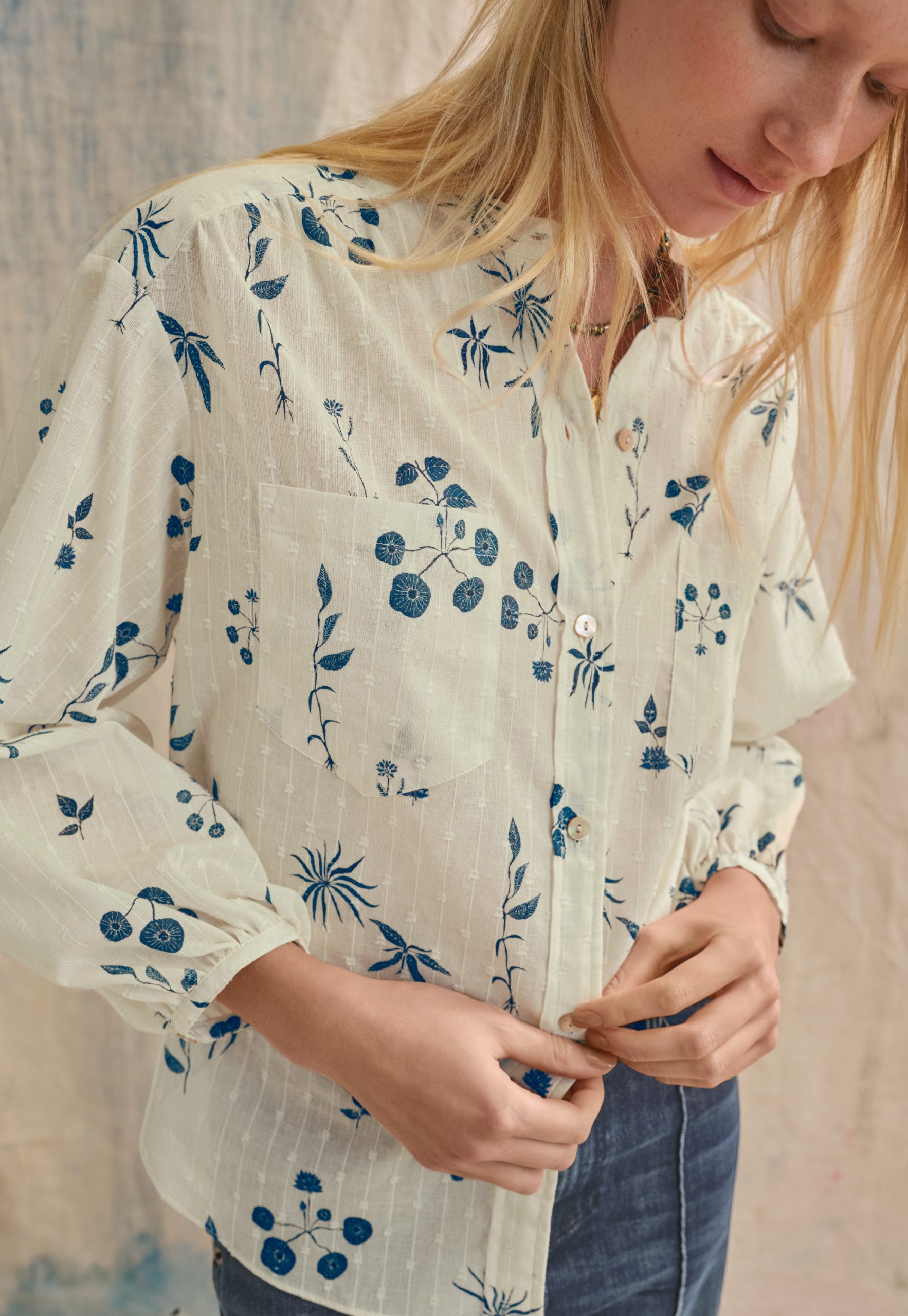 Lightweight Swiss-dot cotton shirt featuring an exclusive Wrap London botanical print. With a curved hem that’s slightly longer at the back, perfect to tuck into your jeans or shorts.