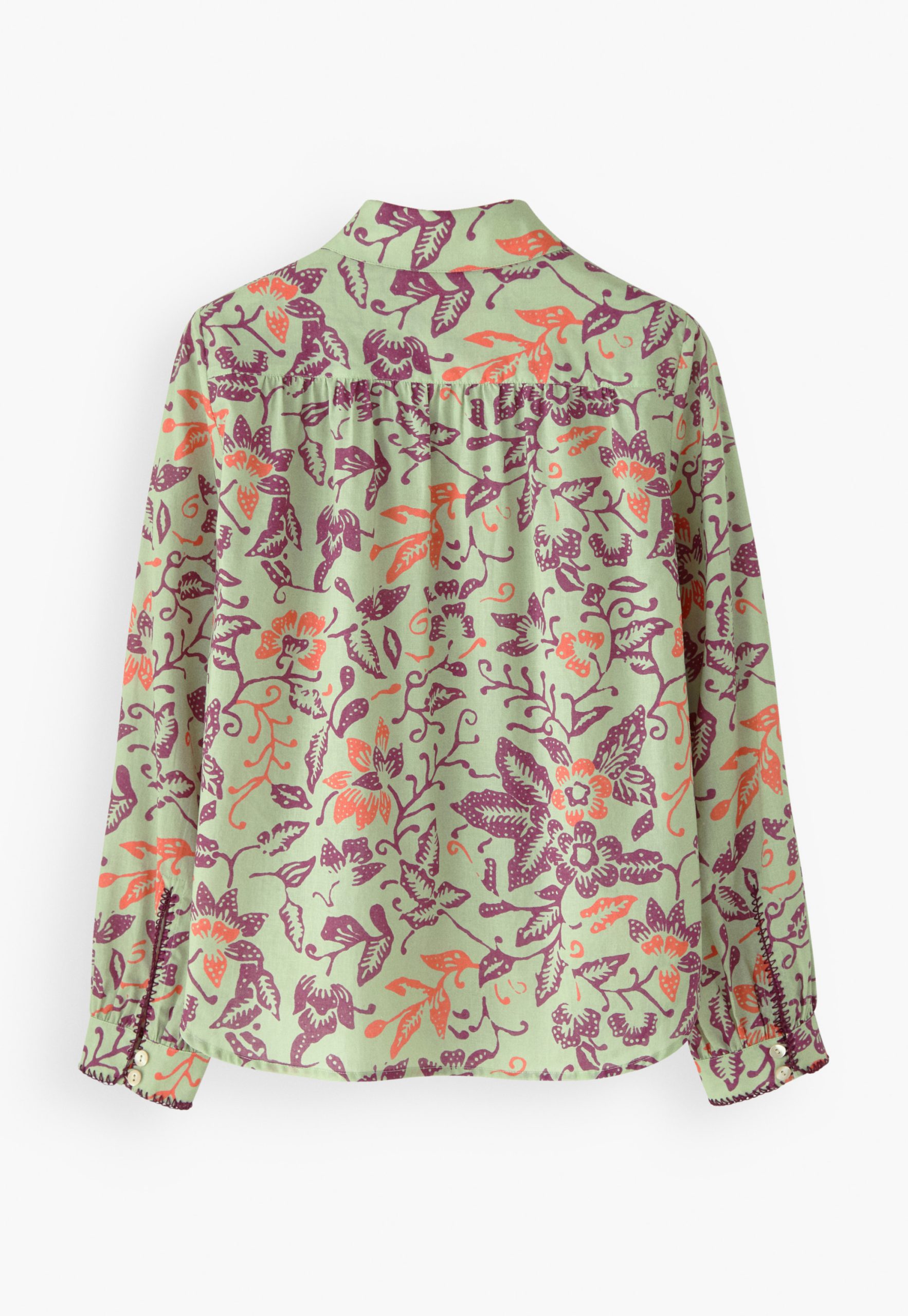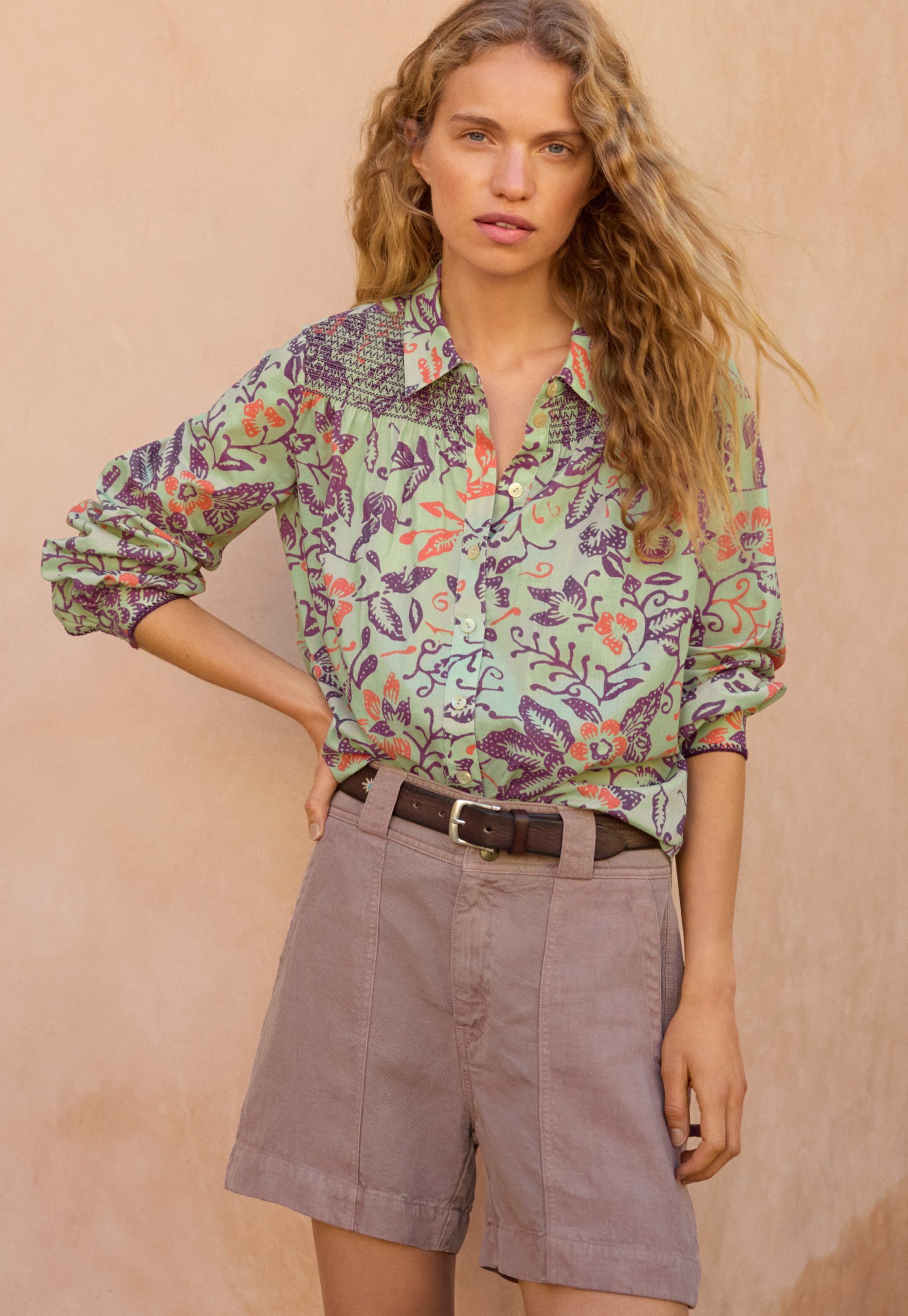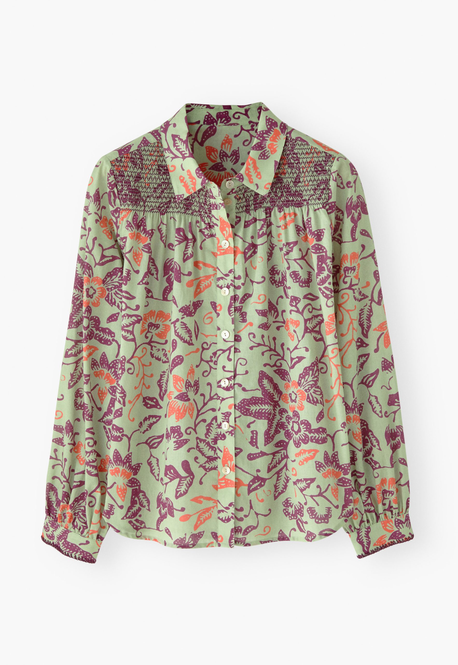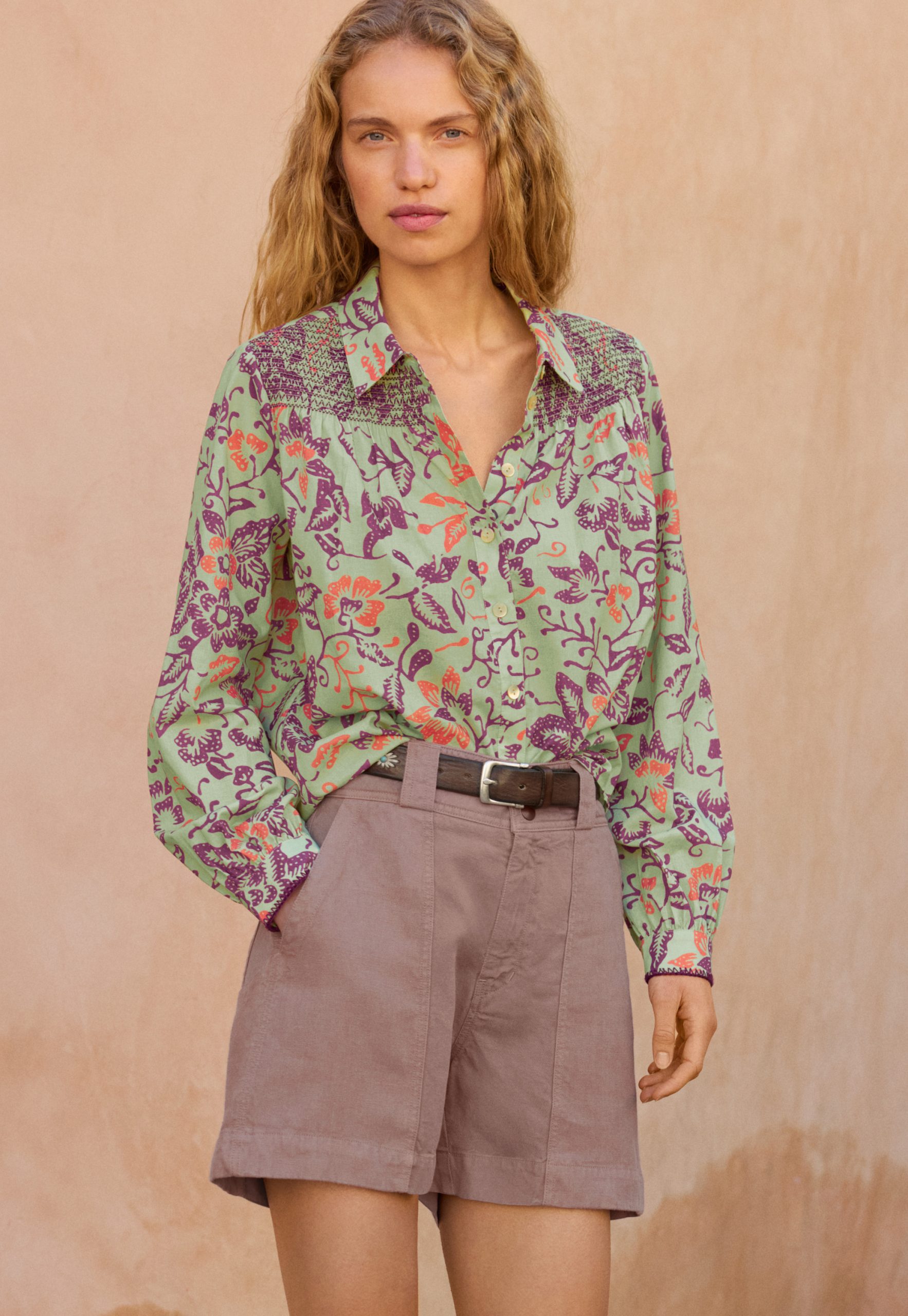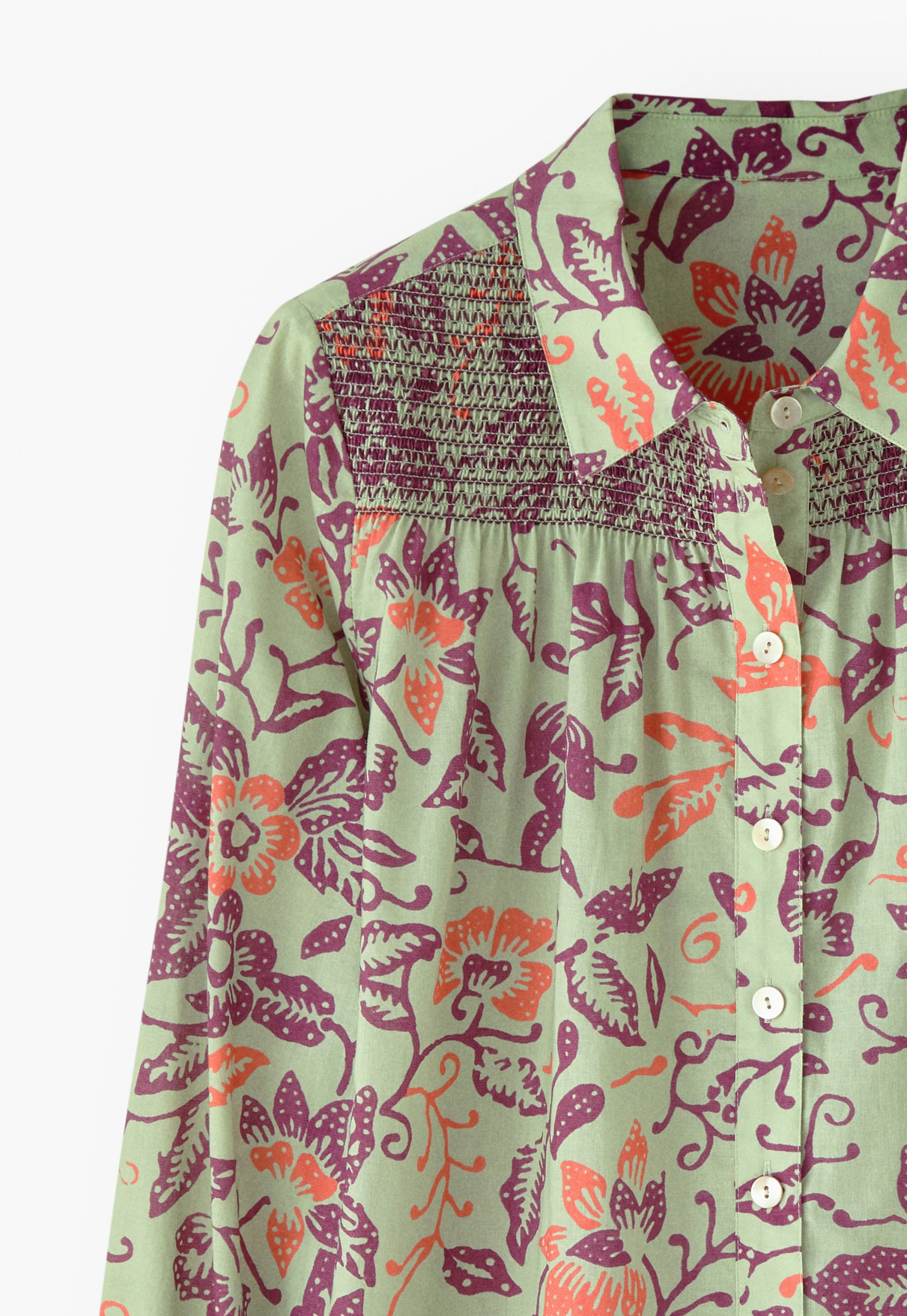 Fresh prints for the sunshine season. A lightweight cotton blouse shirt featuring a batik-inspired exclusive Wrap London print. The embroidered shirring at the front yoke adds the distinctive signature detail.