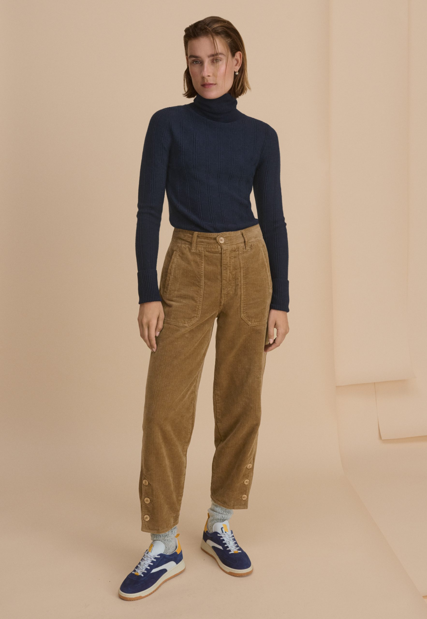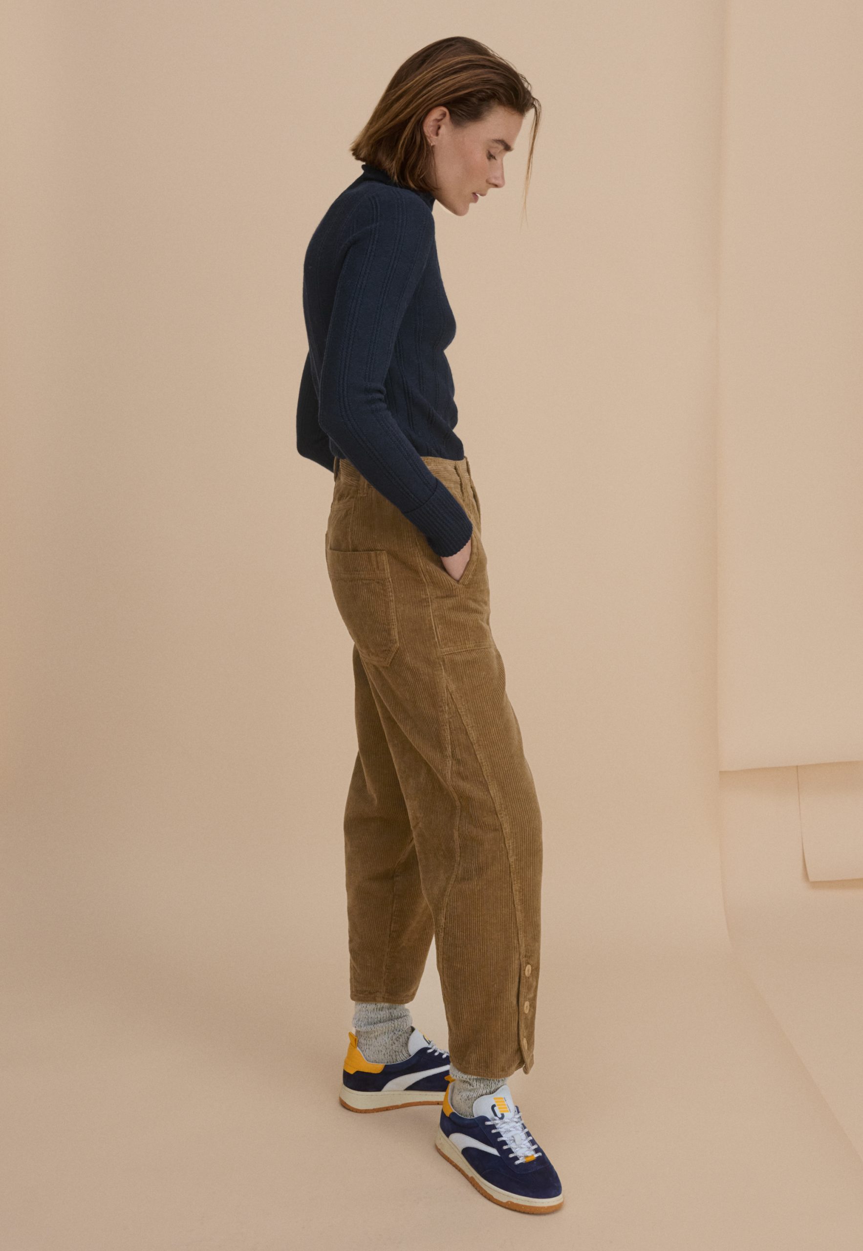 A fresh silhouette in fine-wale cord featuring a tapered leg that finishes with three buttons fastening at the ankle. Tailored for a neat fit at the mid-rise waist, these comfortable trousers meet the smart-yet-casual brief.