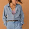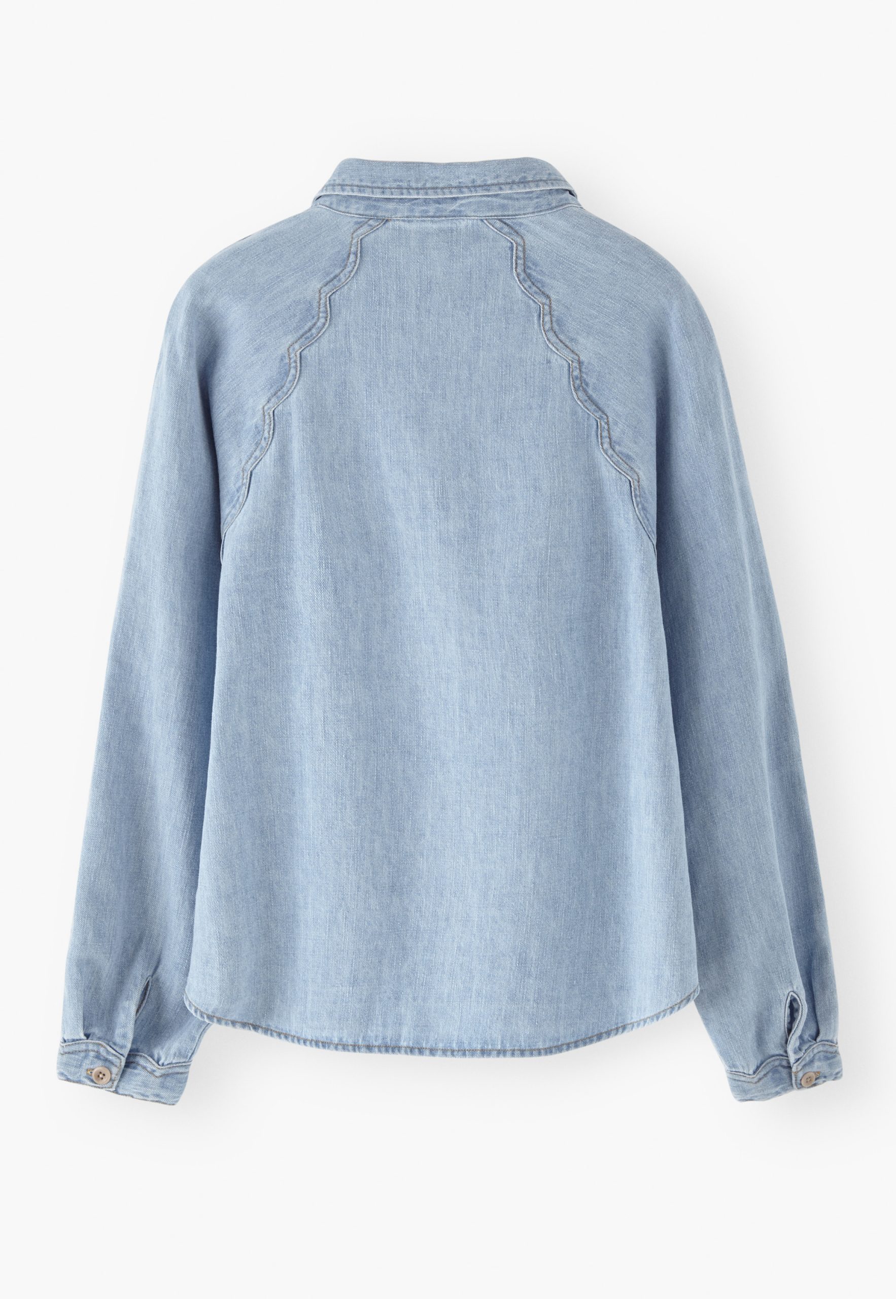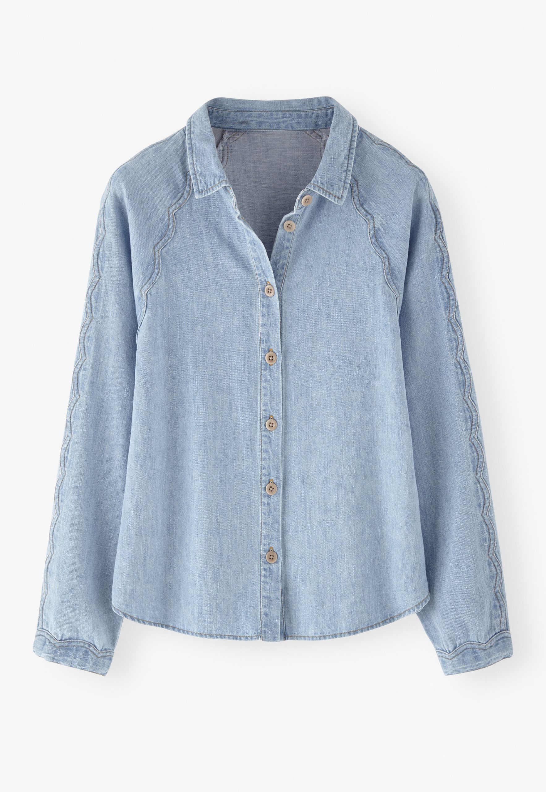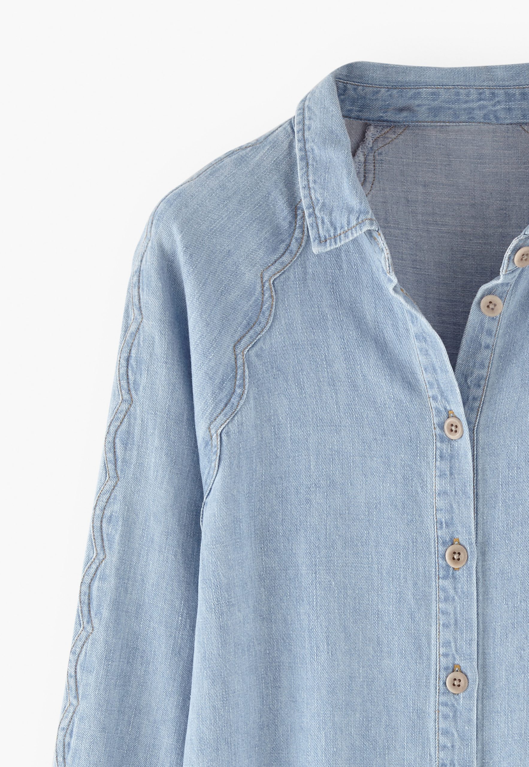 A lightweight denim shirt given a Wrap London twist with the addition of a special scallop seam detail at the sleeves. Made in soft hemp and organic cotton, in a pale indigo wash for a well-loved look.
