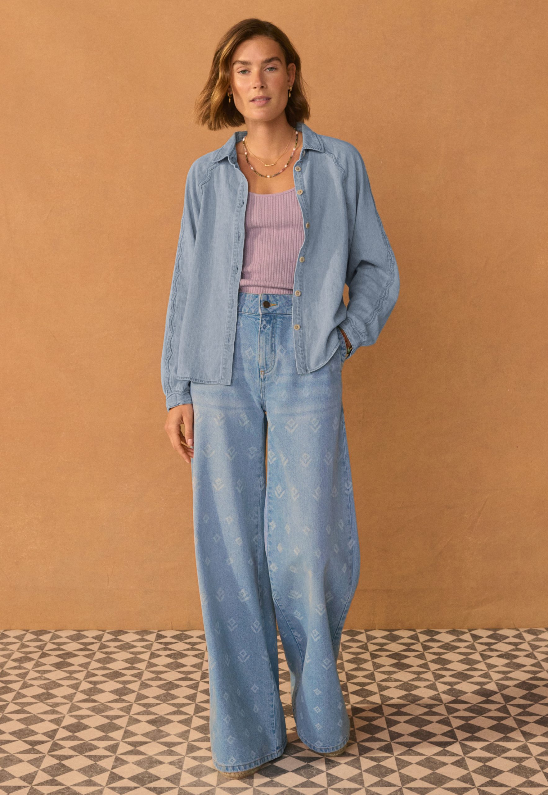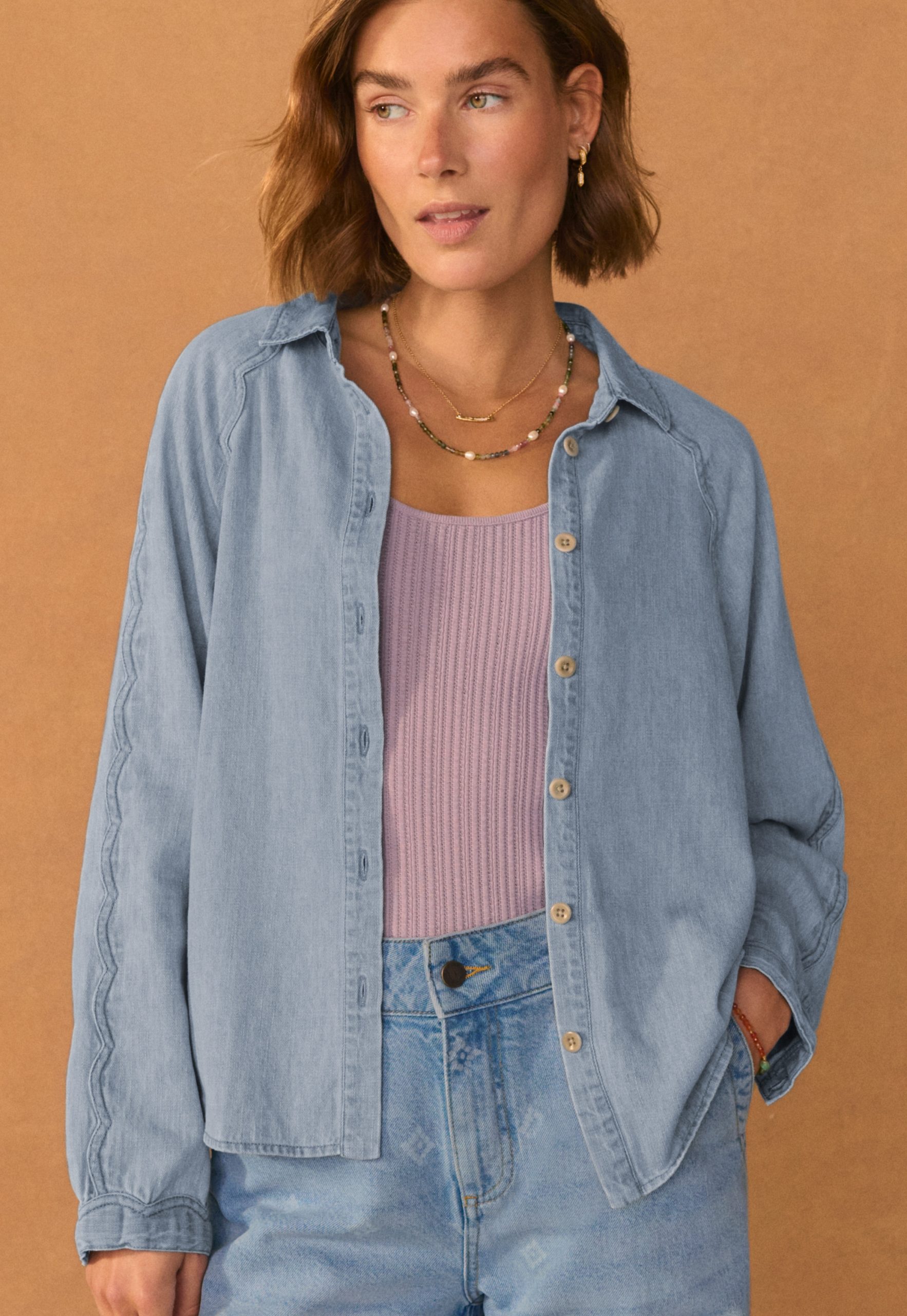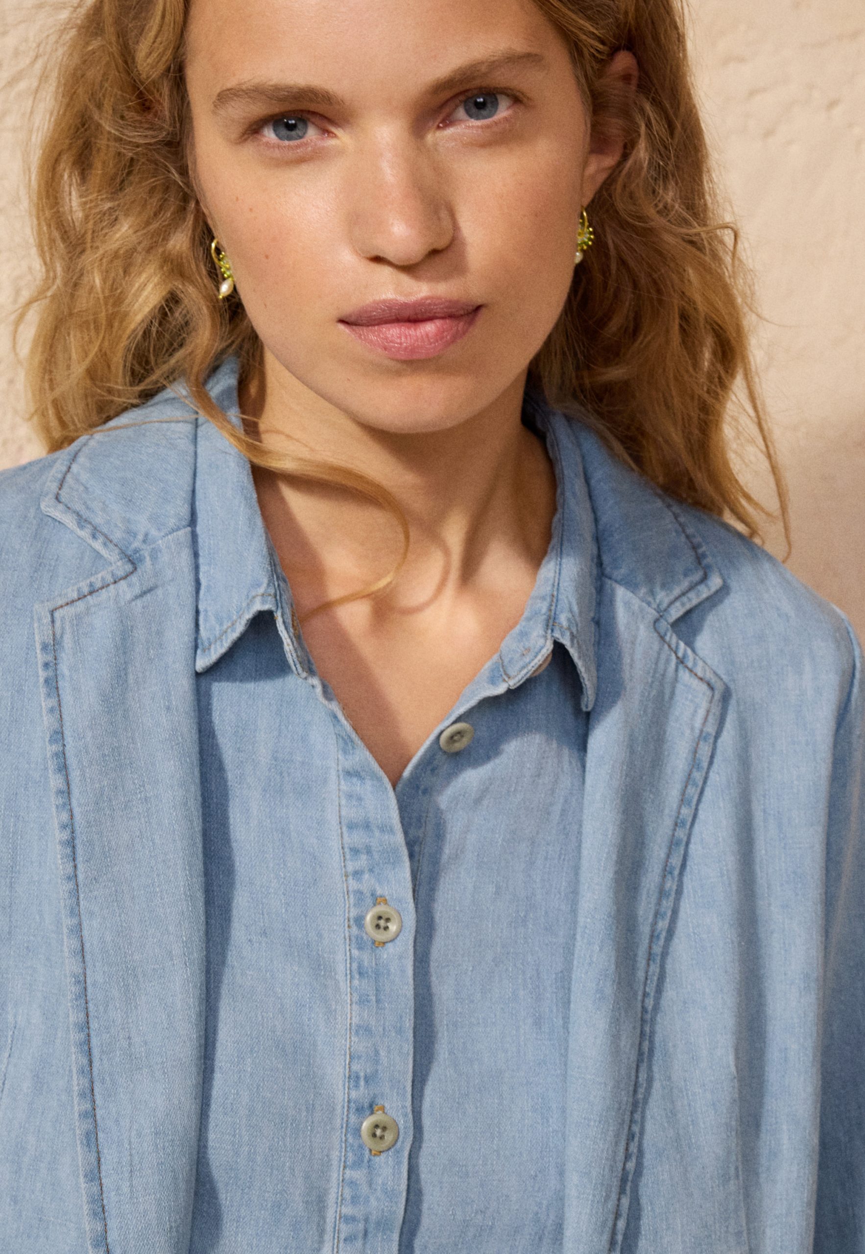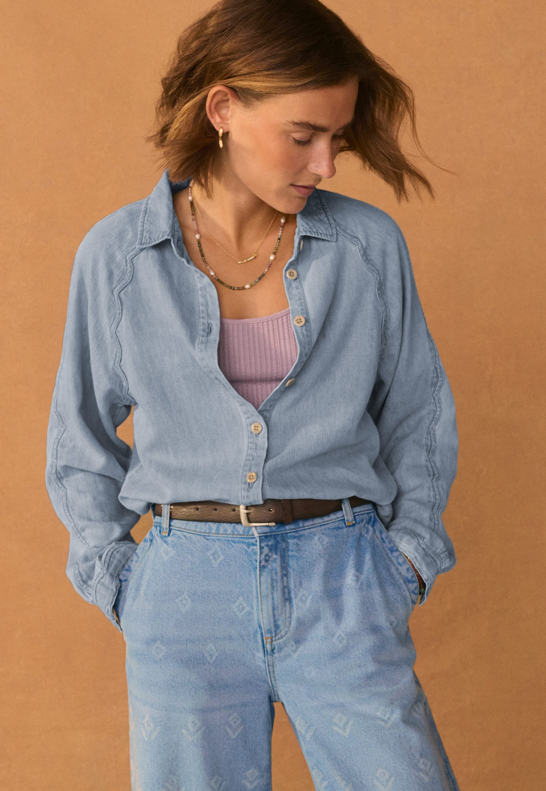 A lightweight denim shirt given a Wrap London twist with the addition of a special scallop seam detail at the sleeves. Made in soft hemp and organic cotton, in a pale indigo wash for a well-loved look.