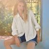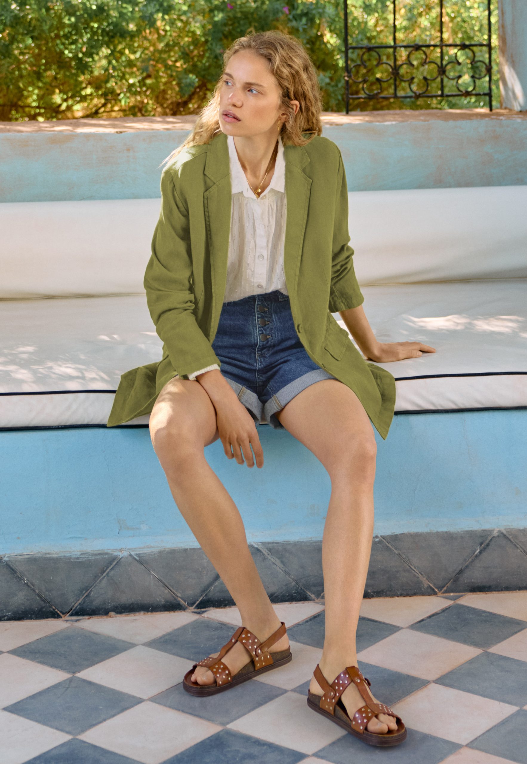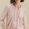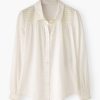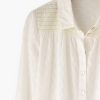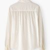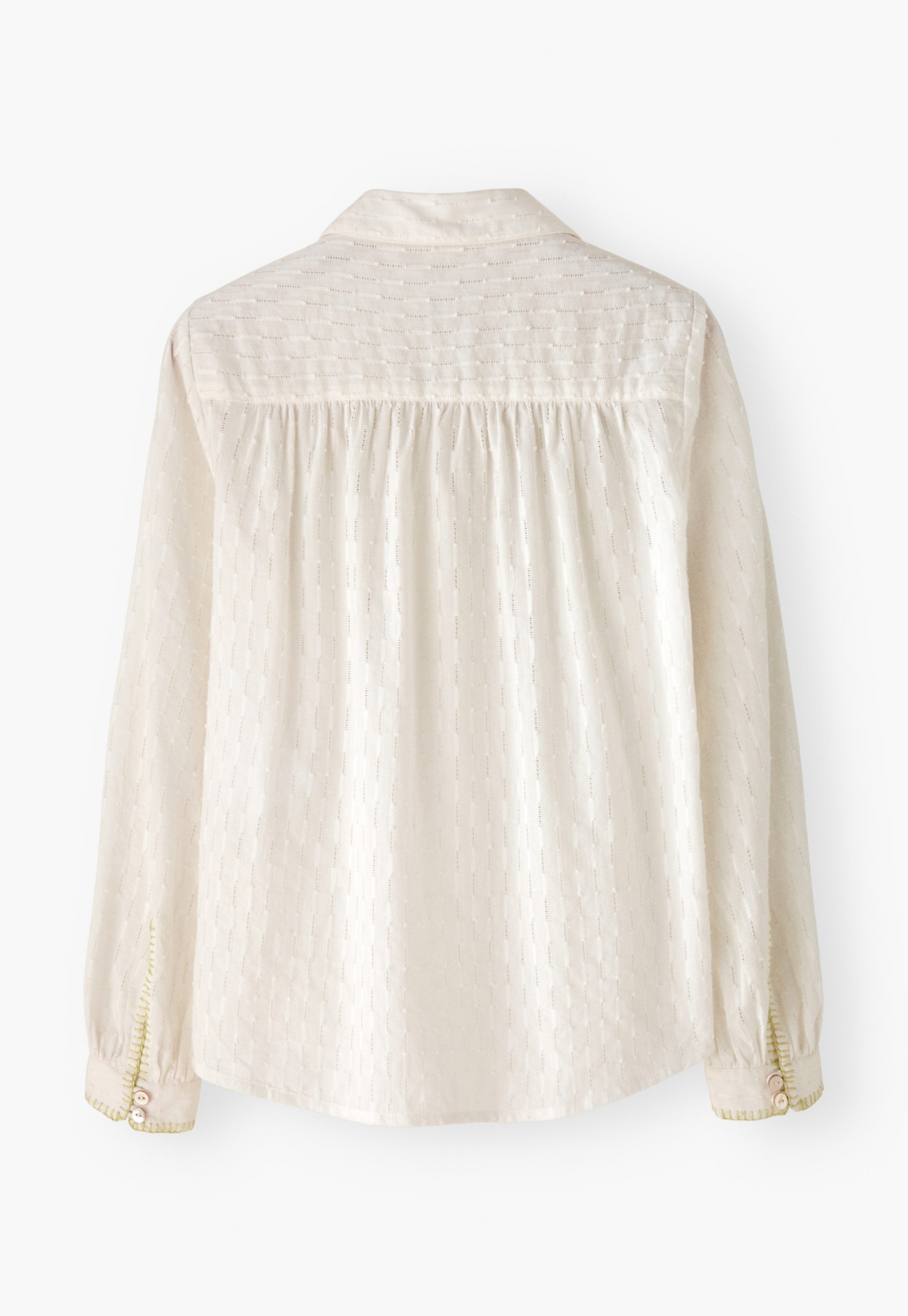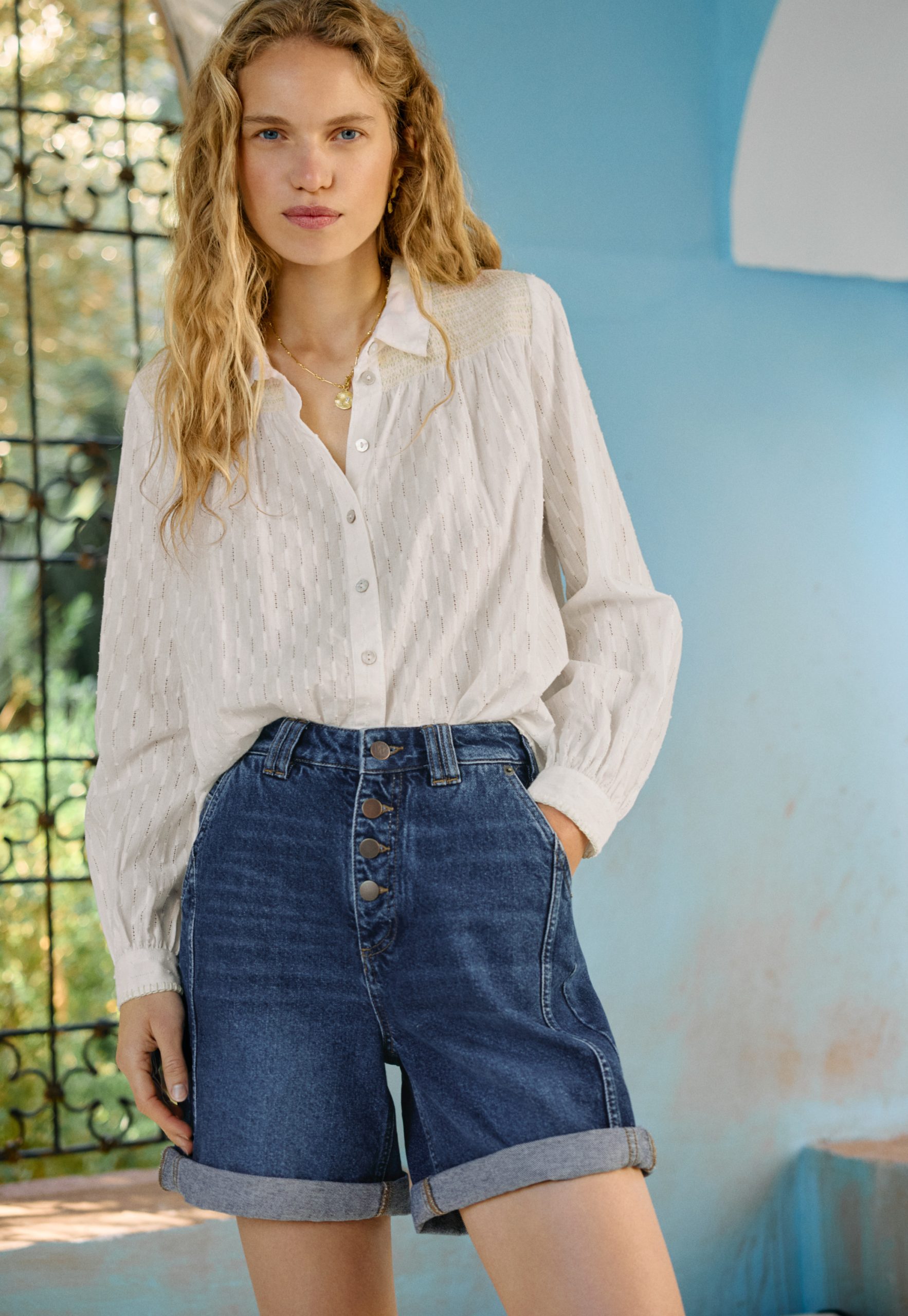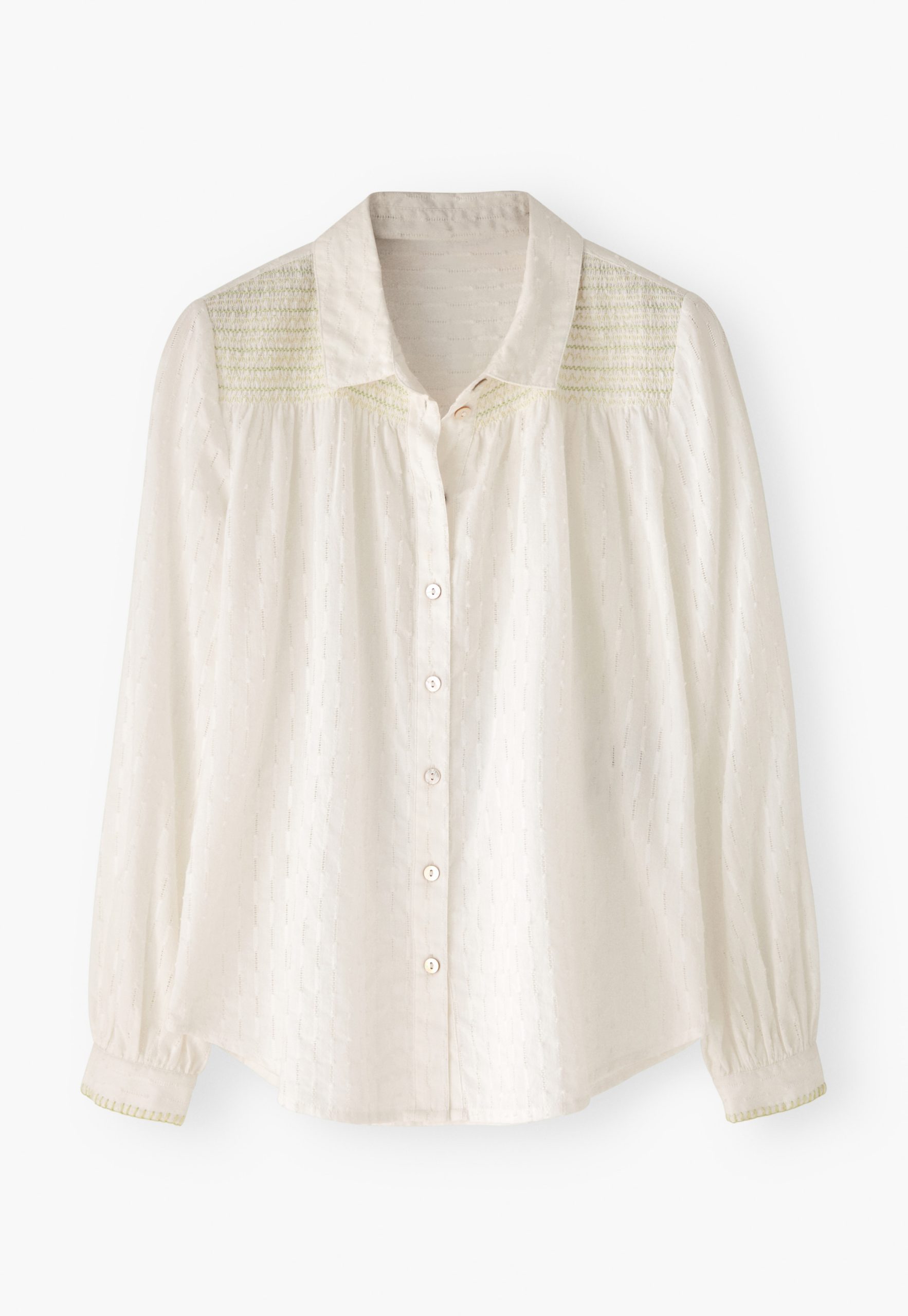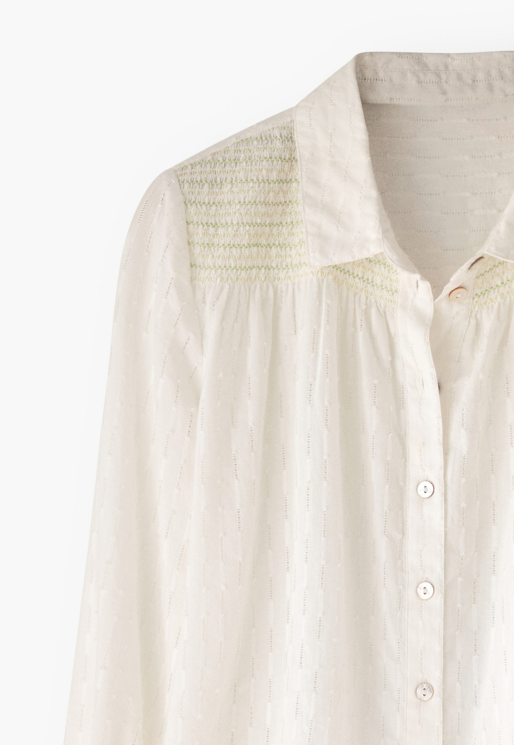 A special shirt with a dynamic shirring detail across the shoulders, made from lightweight cotton dobby – characterised by small geometric patterns and texture in the cloth. Look for the contrast blanket-stitch detail at the cuffs.