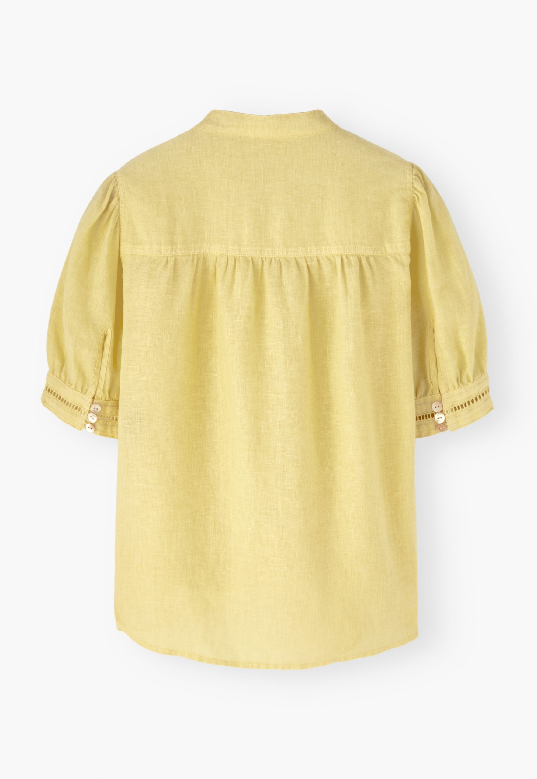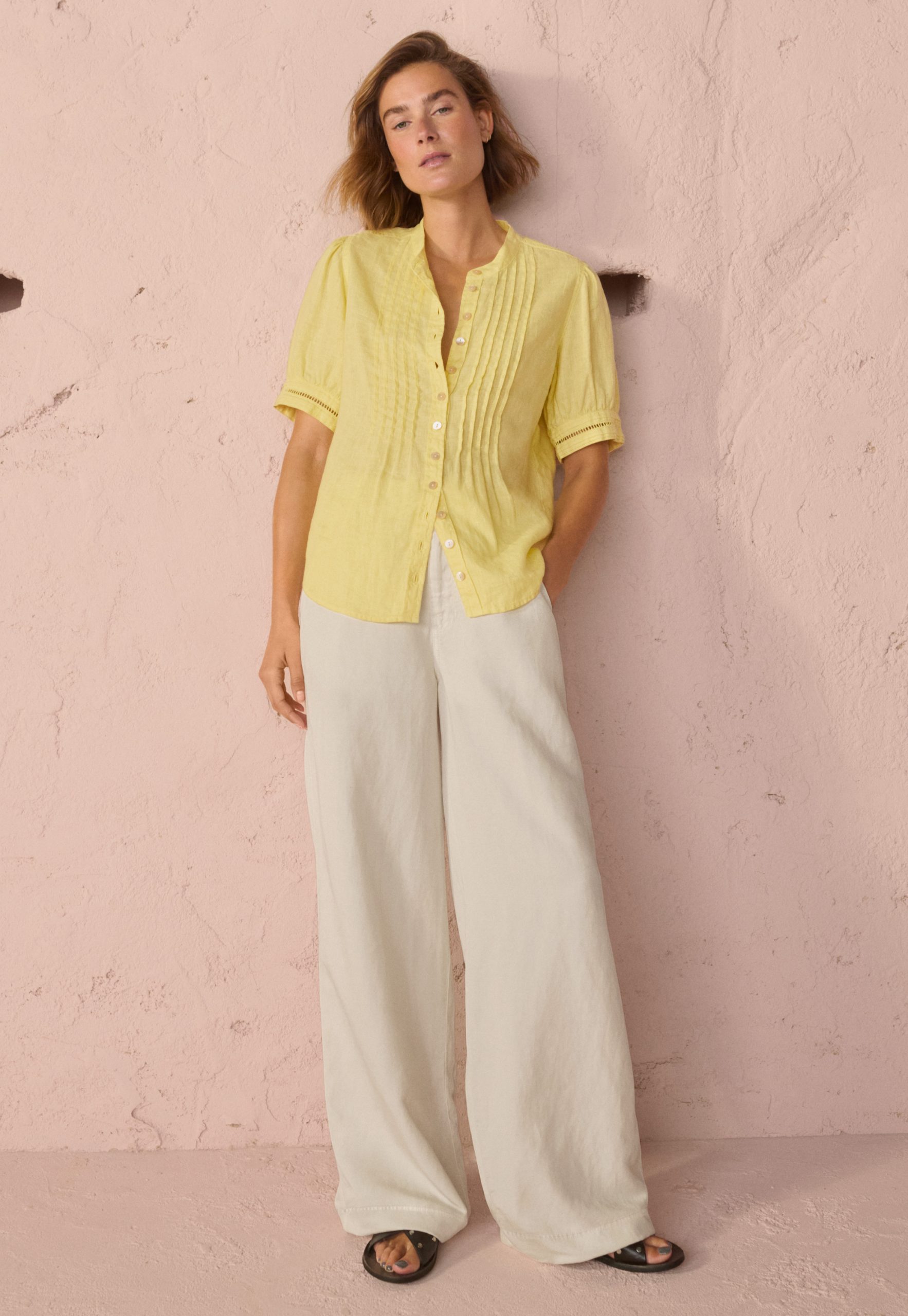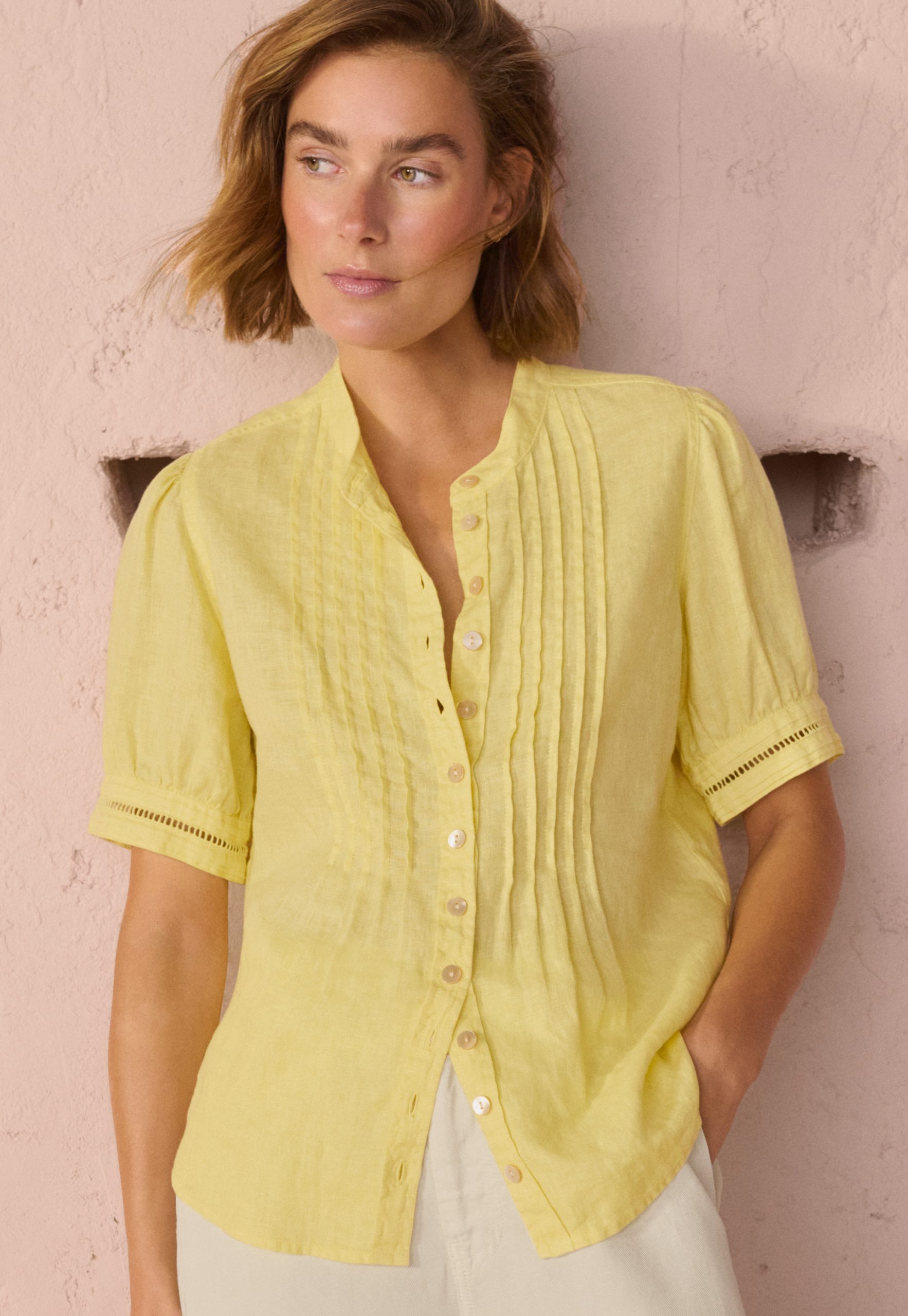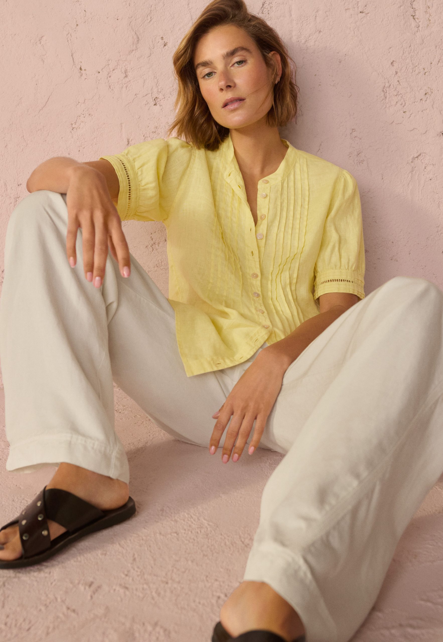 Perfect for when you want to feel more pulled together, this lightweight linen blouse has plenty of pintucks, gentle gathers at the back and the short-sleeves finish with a neat lace-detail and a button fastening.