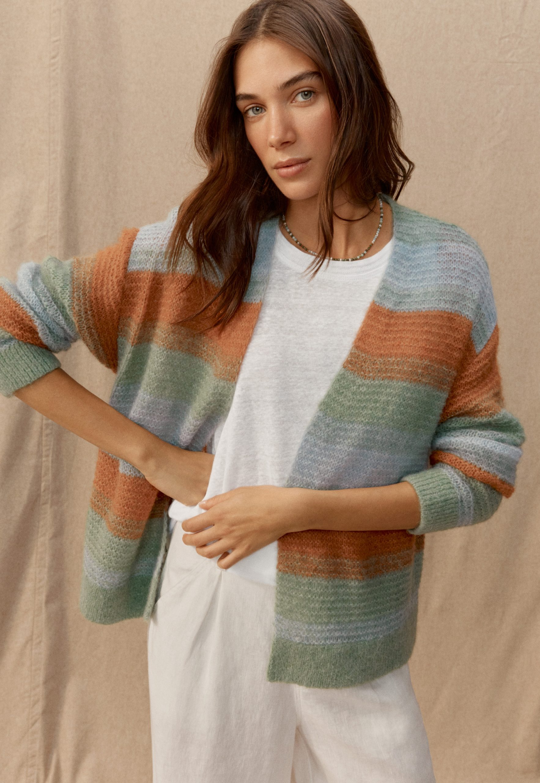 A wonderful way to add colour to any outfit, this super-soft and lightweight alpaca blend cardigan is knitted in a large, open stitch to create irregular stripes. With soft, dropped shoulders and clean edge-to-edge closing, this is a great throw-on layering piece.