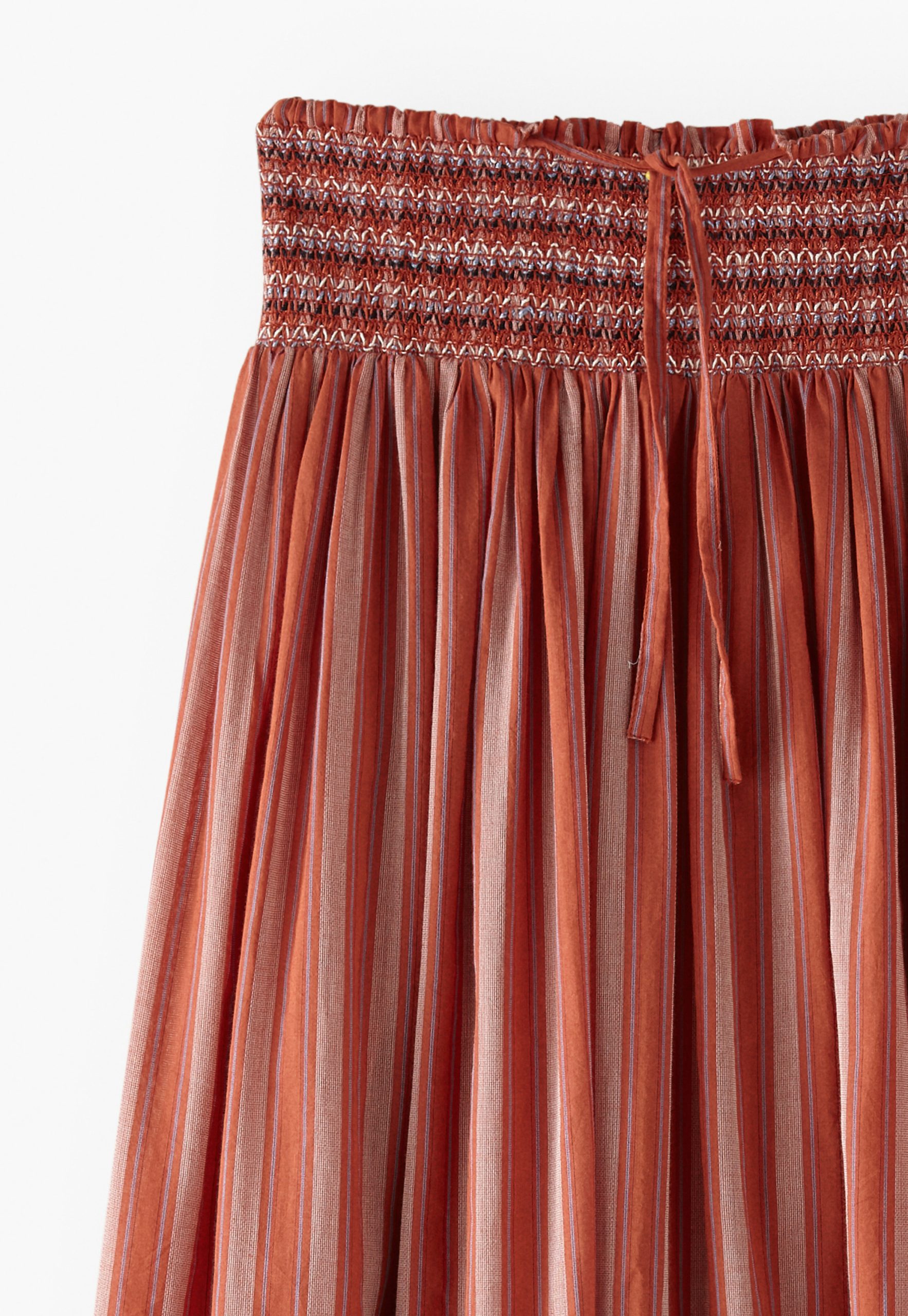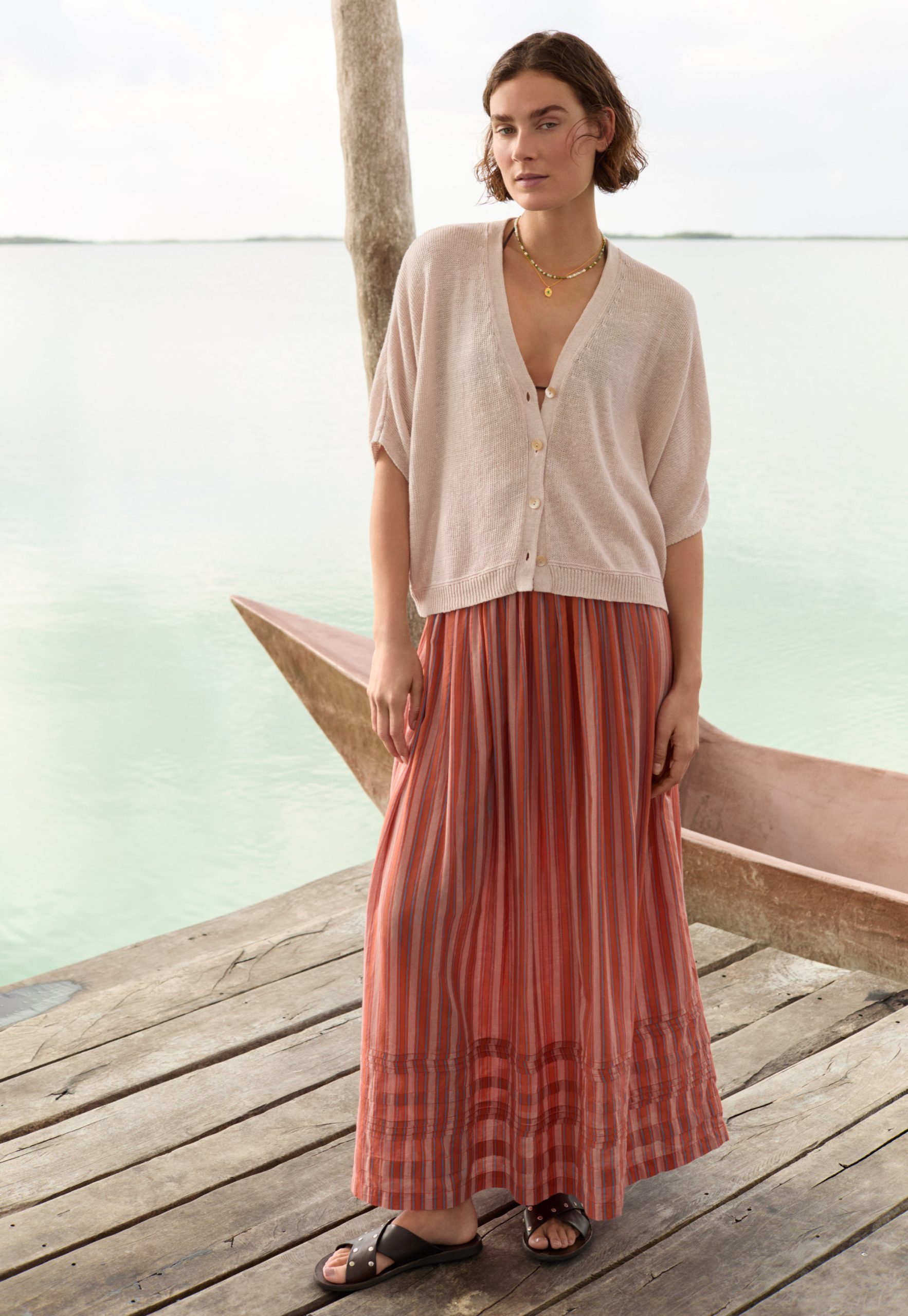 Tuck your T-shirt or vest into the deep elasticated waistband of this lightweight cotton, striped skirt to show off the fabulous shirring detail. The tie detail ensures a great fit and the deep hem finish adds a final flourish.
