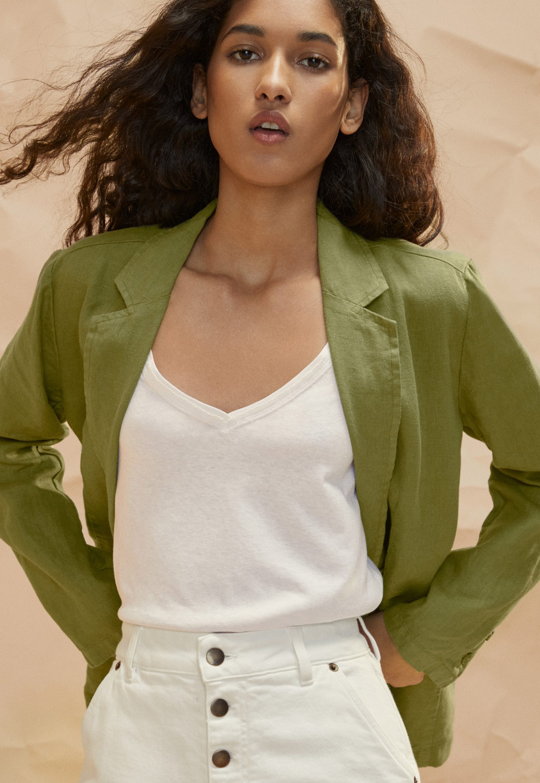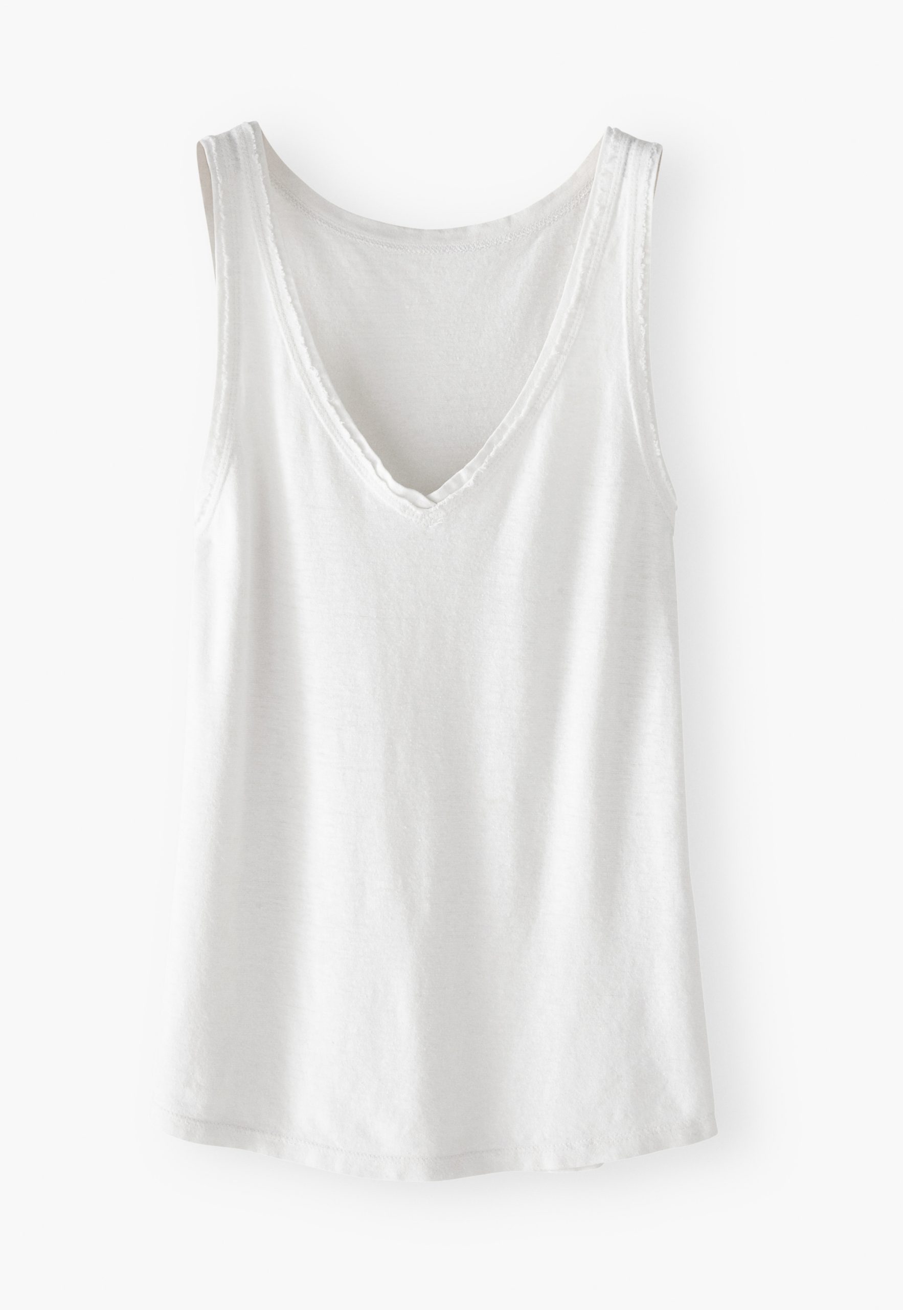 Keep your cool in this simple jersey vest given a Wrap London twist with raw-edge detail at the v-neckline and finished with a curved hem. In a range of earth-tone colours, mix it up with shorts or jeans.