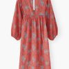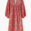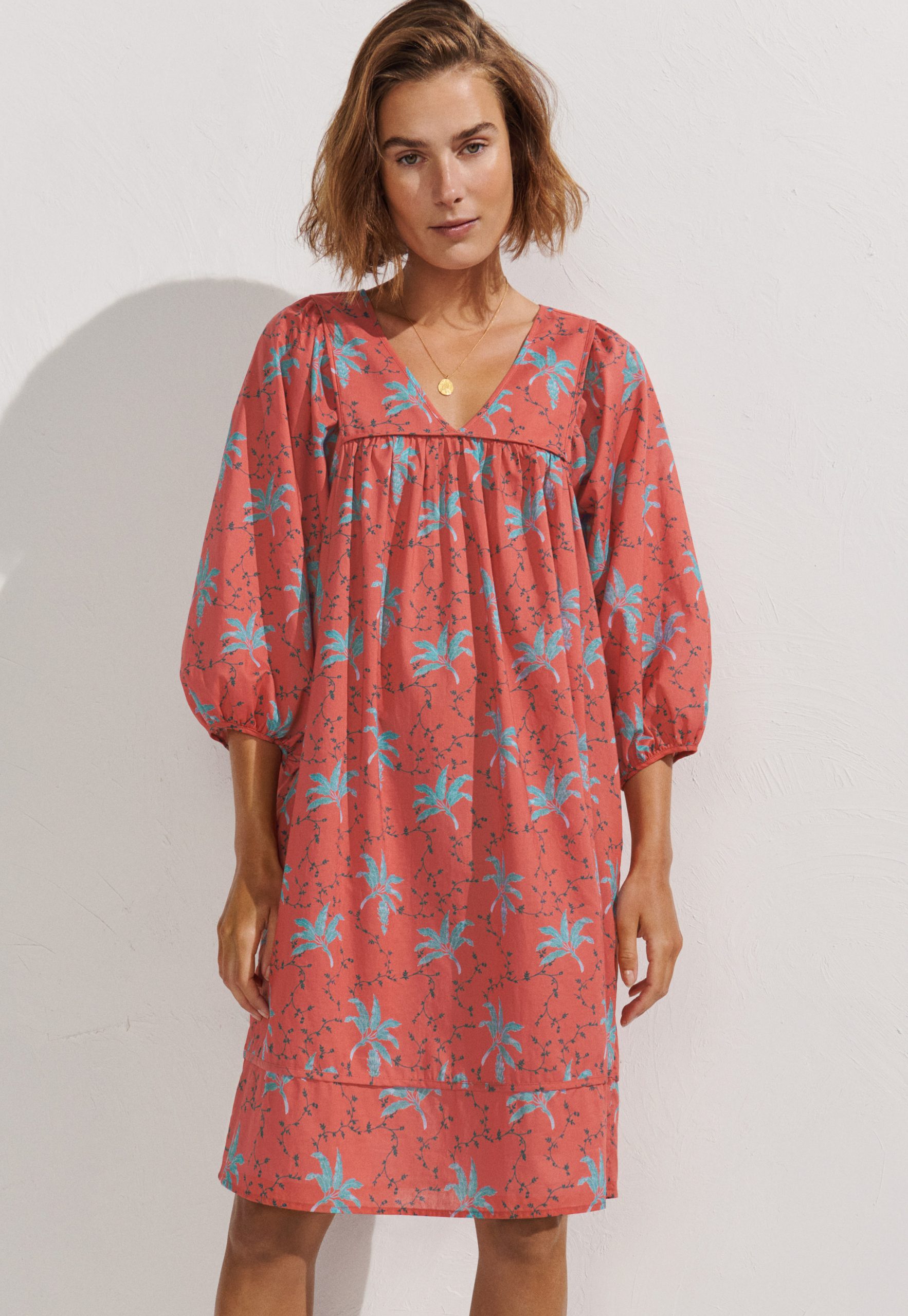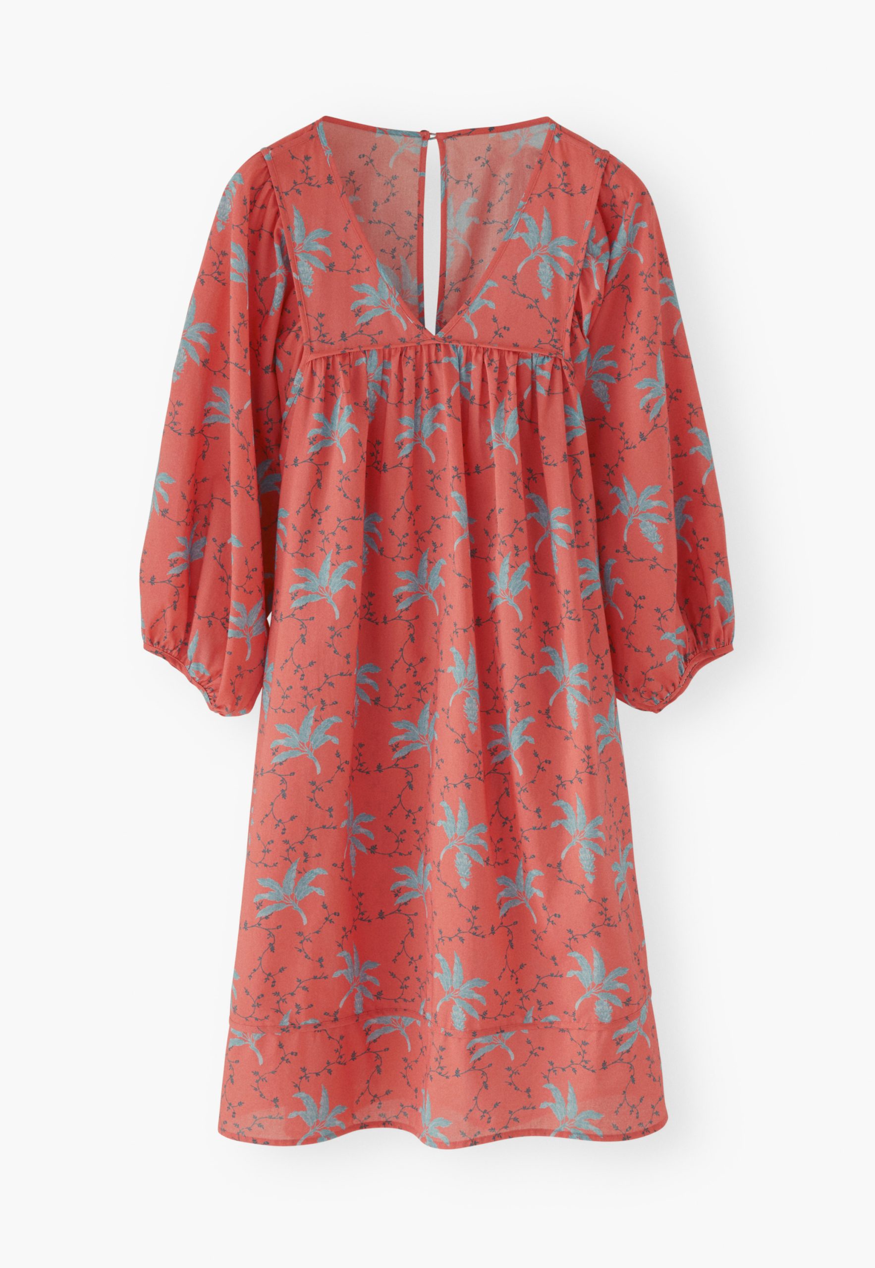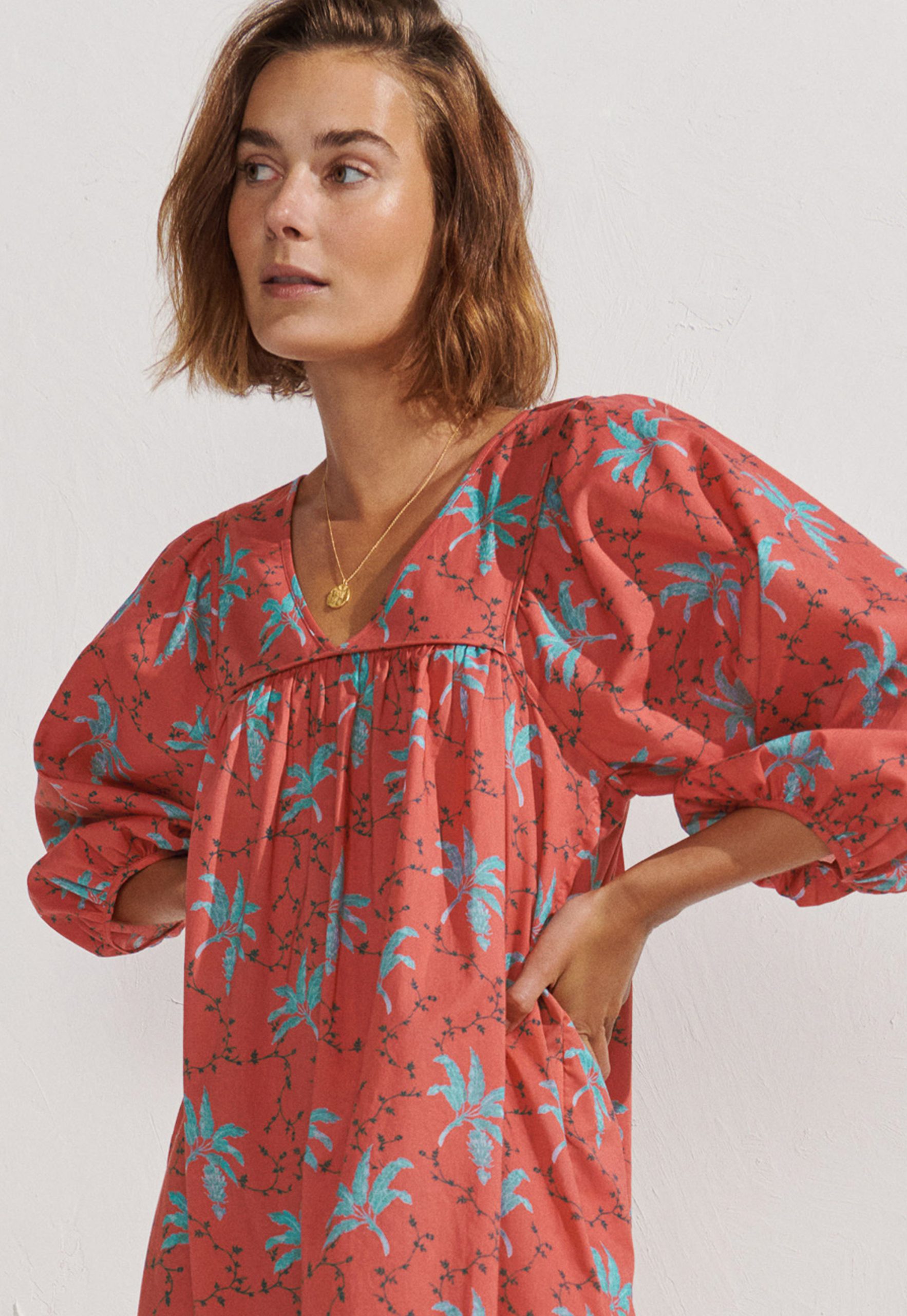 Add a pop of colour to your summer wardrobe with this beautiful soft red cotton dress featuring an exclusive Wrap London botanical print. With a V-neck, blouson sleeves and a neat opening at the back, it finishes just over the knee.